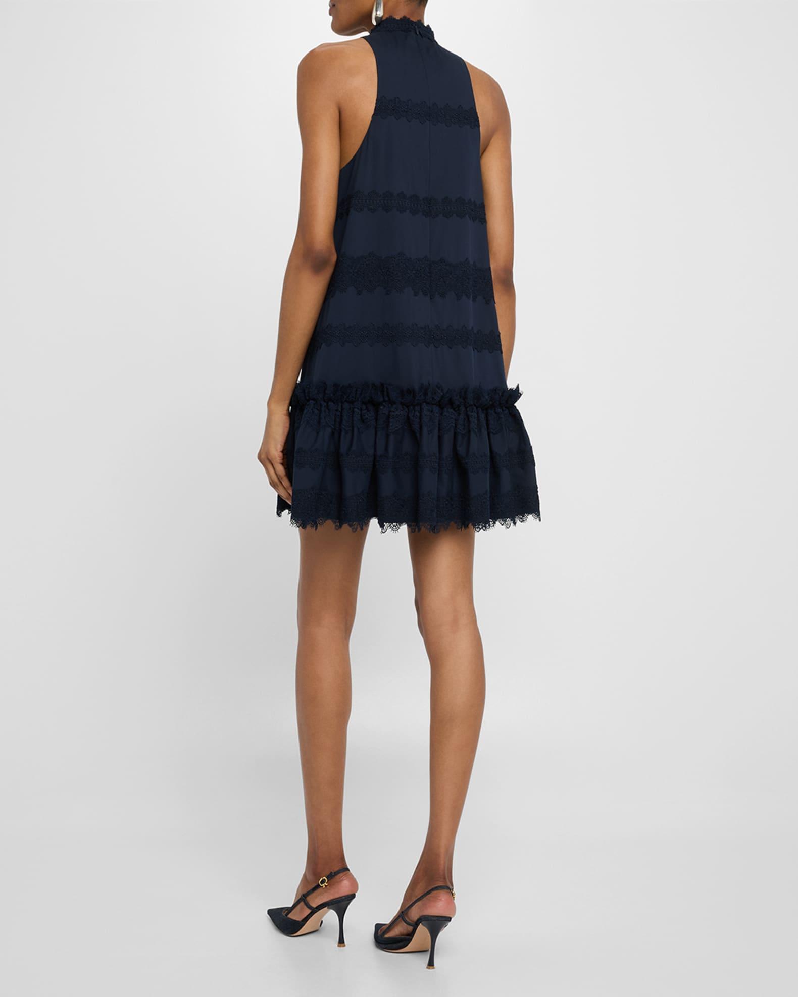 Cinq a Sept "Malena" mini dress finished with tonal lace detailing High neckline Sleeveless Shift silhouette Flounce hem Button-front Cotton/nylon/polyamide/spandex Lining: Rayon Dry clean Imported