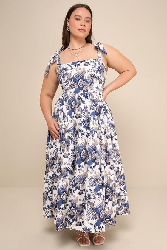 Capture that vacay vibe no matter where you are in the Lulus Mallorca Memories White Floral Print Tiered Tie-Strap Maxi Dress! Midweight woven fabric boasts a vintage-inspired floral print as it shapes tying shoulder straps that support a princess-seamed bodice with a fitted waist. Tiered skirt falls to a maxi hem. Hidden zipper/clasp at side.