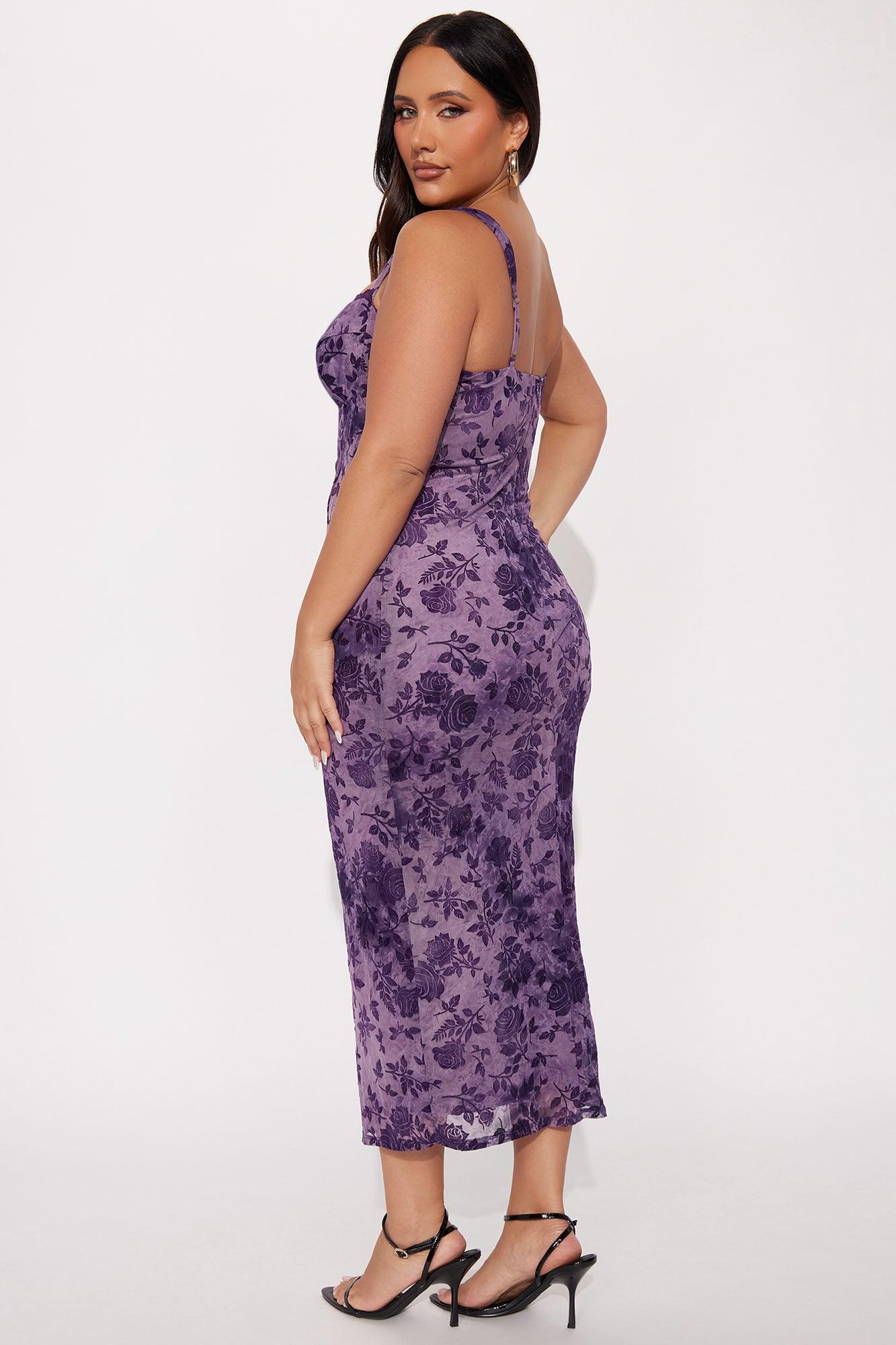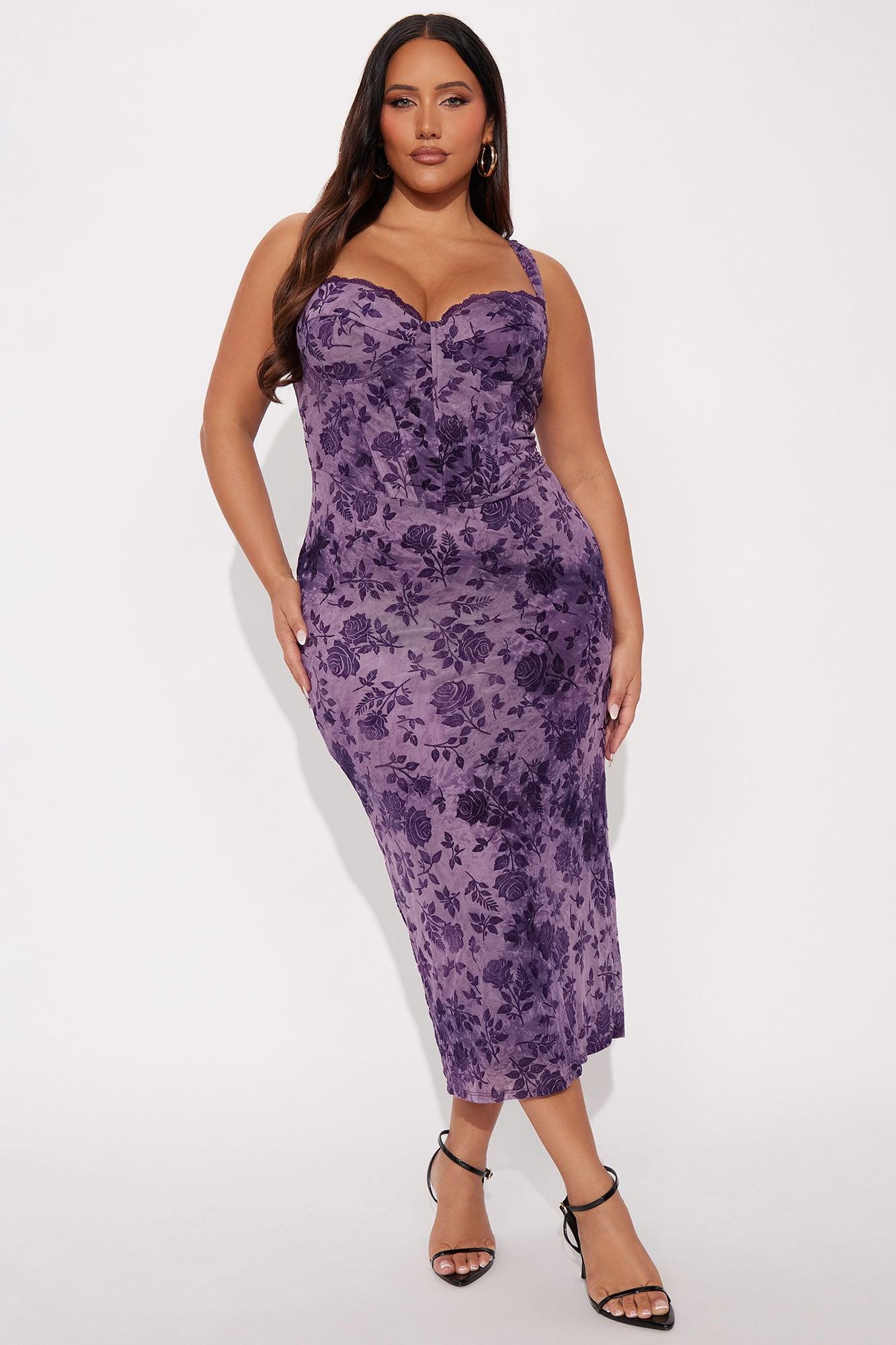 Available In Purple. Floral Print Midi Dress Adjustable Spaghetti Straps Sweetheart Neckline Corset Waist Back Slit Lined Stretch Length Measured Flat = 47" Disclaimer: Due To The Printing Process A Difference In Saturation May Occur. Each Garment Is Unique. Print Placement Will Vary. Self: 95% Polyester 5% Spandex Lining: 100% Polyester Imported