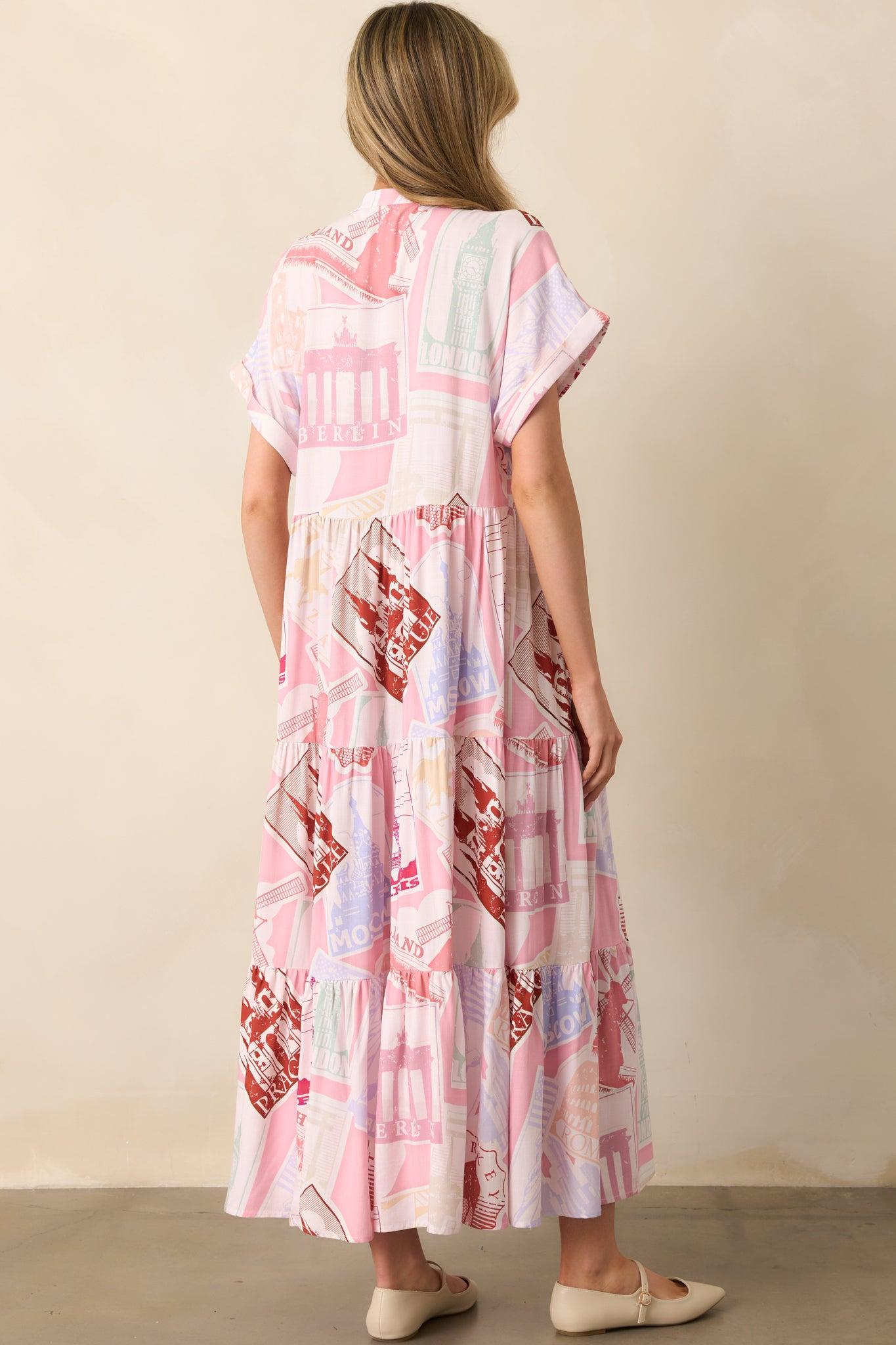 The Mallory Passport To The Sun Pink Midi Dress is a charming choice for embracing the lightness and joy of carefree days. It's perfect for those moments when you want to feel airy and stylish, with a sense of freedom that makes every day feel fresh and delightful. This pink midi dress features a passport-inspired print, round neckline, functional covered placket button front, rolled cuff short sleeves, and a tiered design. 100% Rayon Unlined Wash inside out, with cold water on a gentle cycle Use mild detergent & avoid bleach Hand wash cold & air dry preferred Manufactured in China & Designed in The USA Model is 5'8" & is wearing an x-small