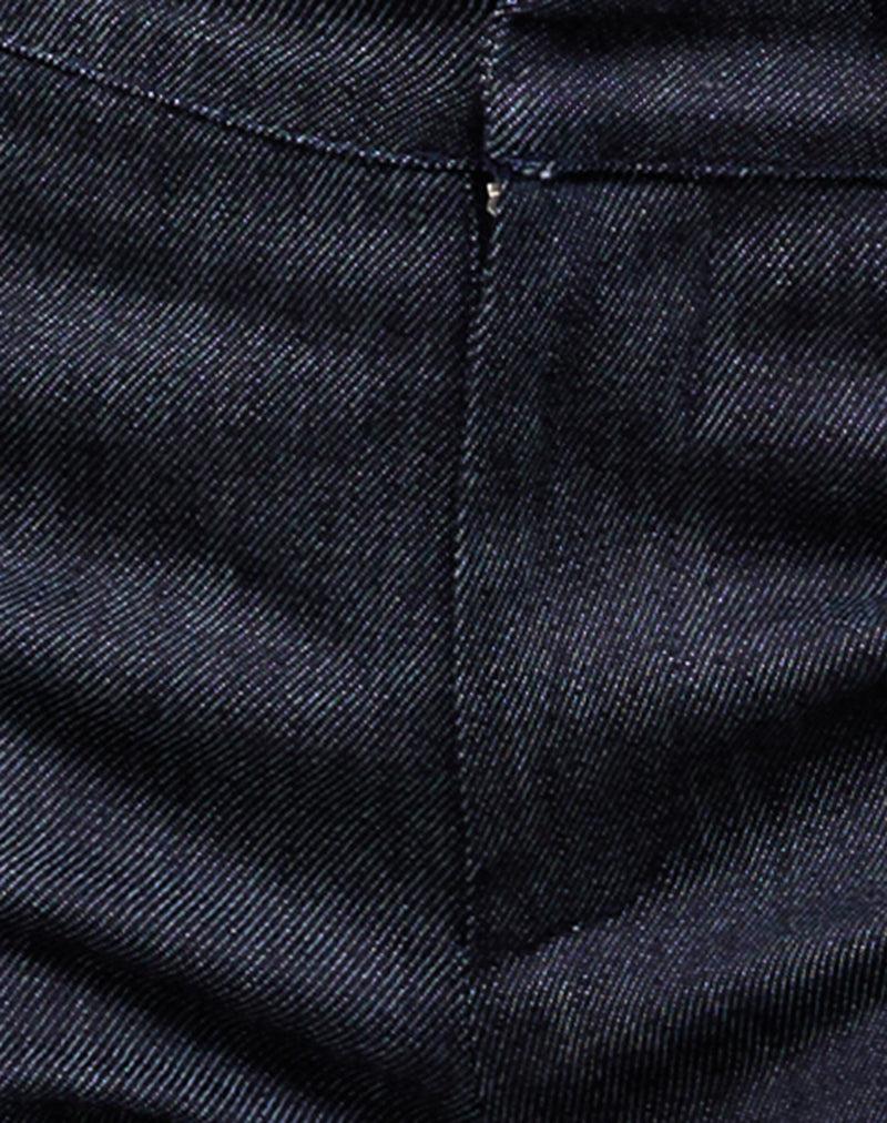The Malvinas trousers in dark indigo stretch denim, feature a low waist, concealed front zip with hook-and-eye closure, a fitted leg silhouette with a flared hem and a skinny waistband. Complete the set with matching Oria vest. MODEL WEARS SIZE:SMALL - MODEL HEIGHT:5'7