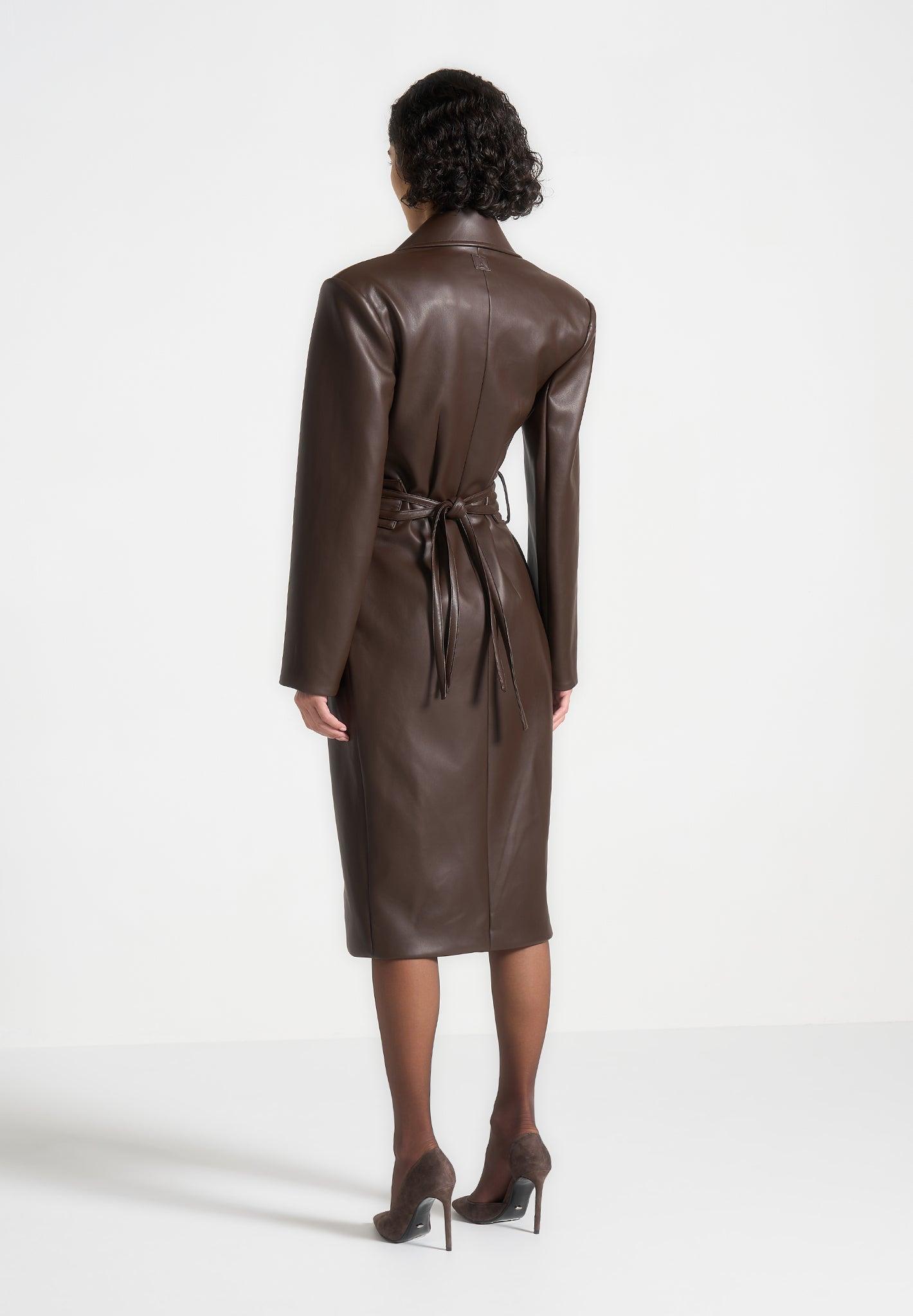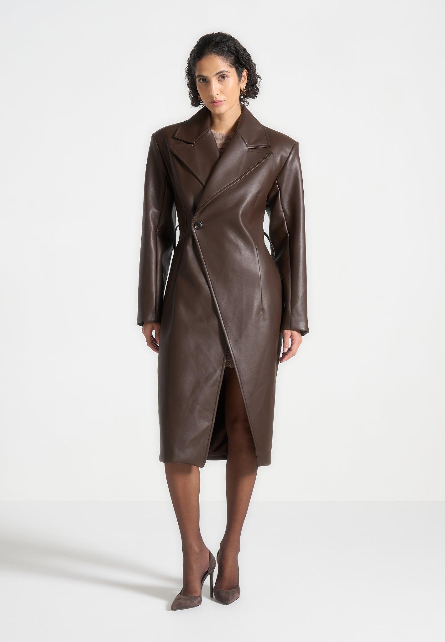 The asymmetric front wrap defines this coat with a modern, statement edge, setting it apart as a bold outerwear piece. Crafted from vegan leather for a sleek, textured finish, the longline silhouette elongates the frame with refined structure. Classic lapels add timeless tailored detail, while marble feature buttons introduce a bold, elevated accent. Completed with a detachable vegan leather belt, it allows for versatile waist definition, balancing contemporary style with practical wearability. Crafted from vegan leather for a sleek, textured finish Asymmetric front wrap for a statement edge Longline silhouette for an elongated look Classic lapels for a timeless tailored detail Detachable vegan leather belt for versatile waist definition Marble feature buttons for a bold, refined accent Tonal Manière De Voir vegan leather Eiffel patch to centre back