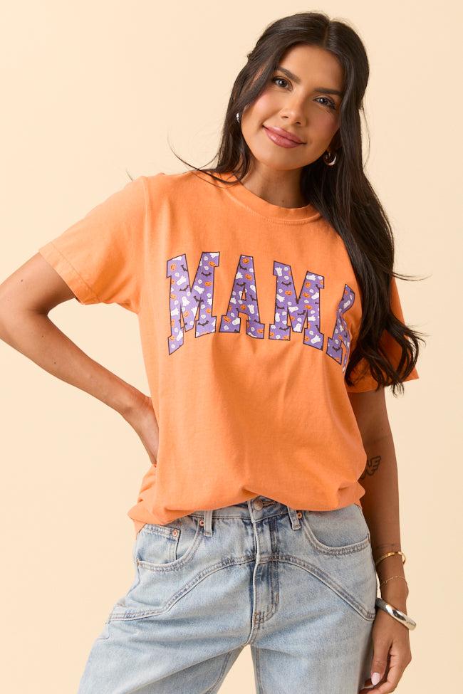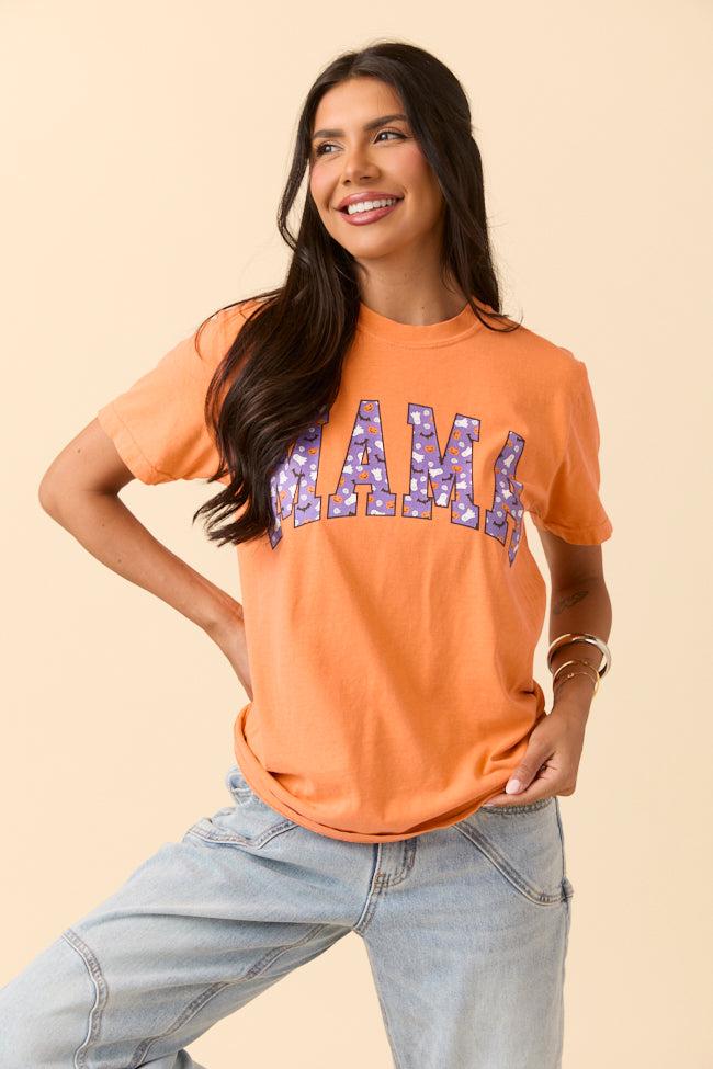 Details Orange crewneck with mama Halloween icon design Crew neckline Short sleeves Material and Care Comfort Color Tee 100% cotton For best results, wash inside out on a gentle cycle with cold or lukewarm water. Tumble dry low or hang to dry to keep your tee looking fab! Size and Fit Size Small approximate measurements. Relaxed fit, size up 2 sizes for oversized fit Chest Width: 17.25” Body Length: 25.6”