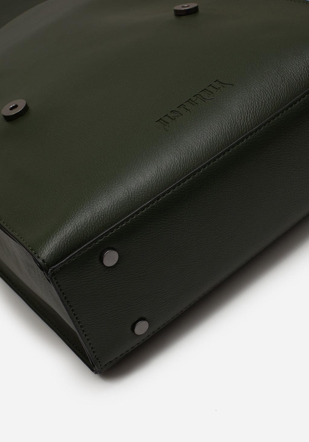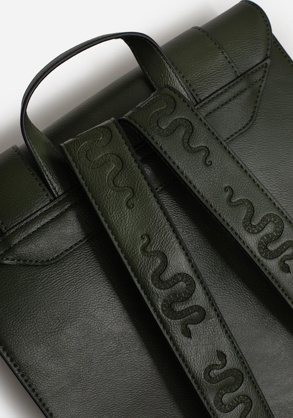 Revenge is never a straight line- Green snake debossed PU leather satchel backpack with statement buckle - Large square shape holds all your daily essentials for work & play - Fastens with magnetic closures on flap - One large internal compartment with one pouch & one zipped pocket - Adjustable shoulder straps with debossed snake motif - Decorative gunmetal moulded snake buckles on front - Metal bag feet on base - Textured green faux leather fabrication for a sturdy finish Main: 100% PULining: 100% cotton