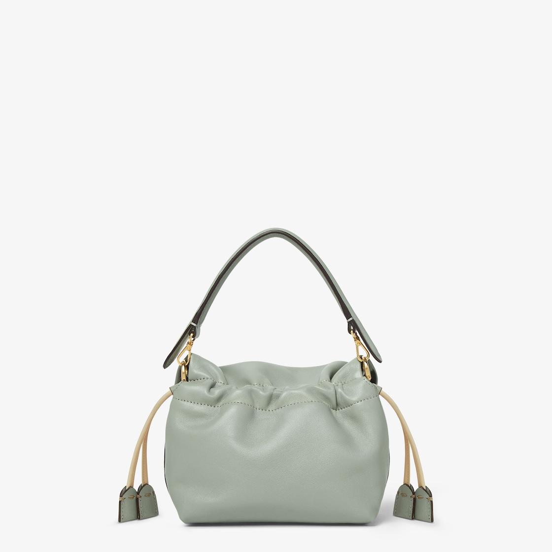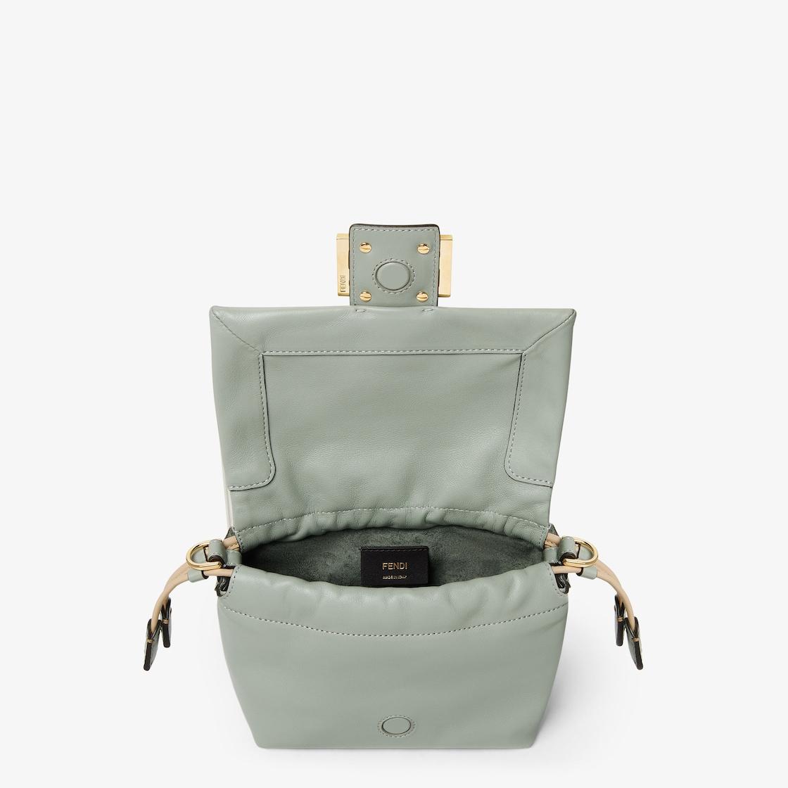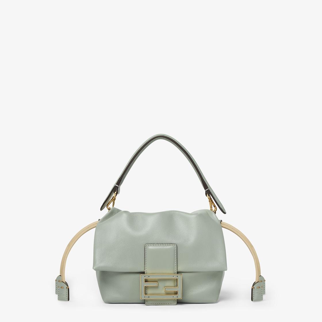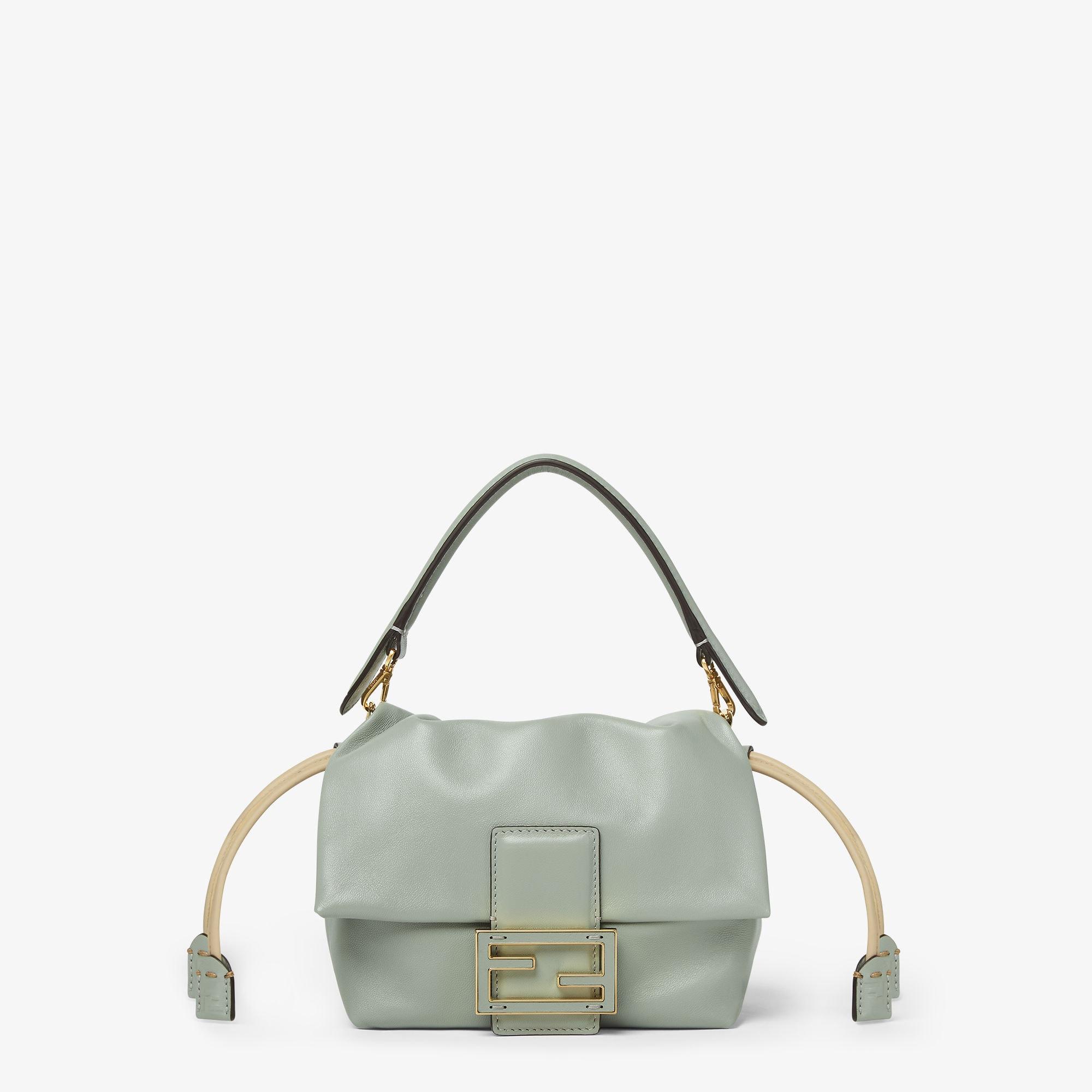 Iconic small Mamma Baguette bag, created in the late 1990s as a larger version of the iconic Baguette, hence the name Mamma Baguette. Updated for the Spring/Summer 2025 fashion show with a soft, deconstructed look while retaining the original elements of the bag. Made of soft, matcha green nappa leather embellished with a metal FF clasp with tone-on-tone leather insert. Large suede-lined internal compartment with drawstring closure featuring cream-colored leather ties and customized details. Featuring a front flap and magnetic clasp. Gold-finish metalware. Can be carried by hand or worn cross-body thanks to the handle and shoulder strap, both detachable. Made in Italy
