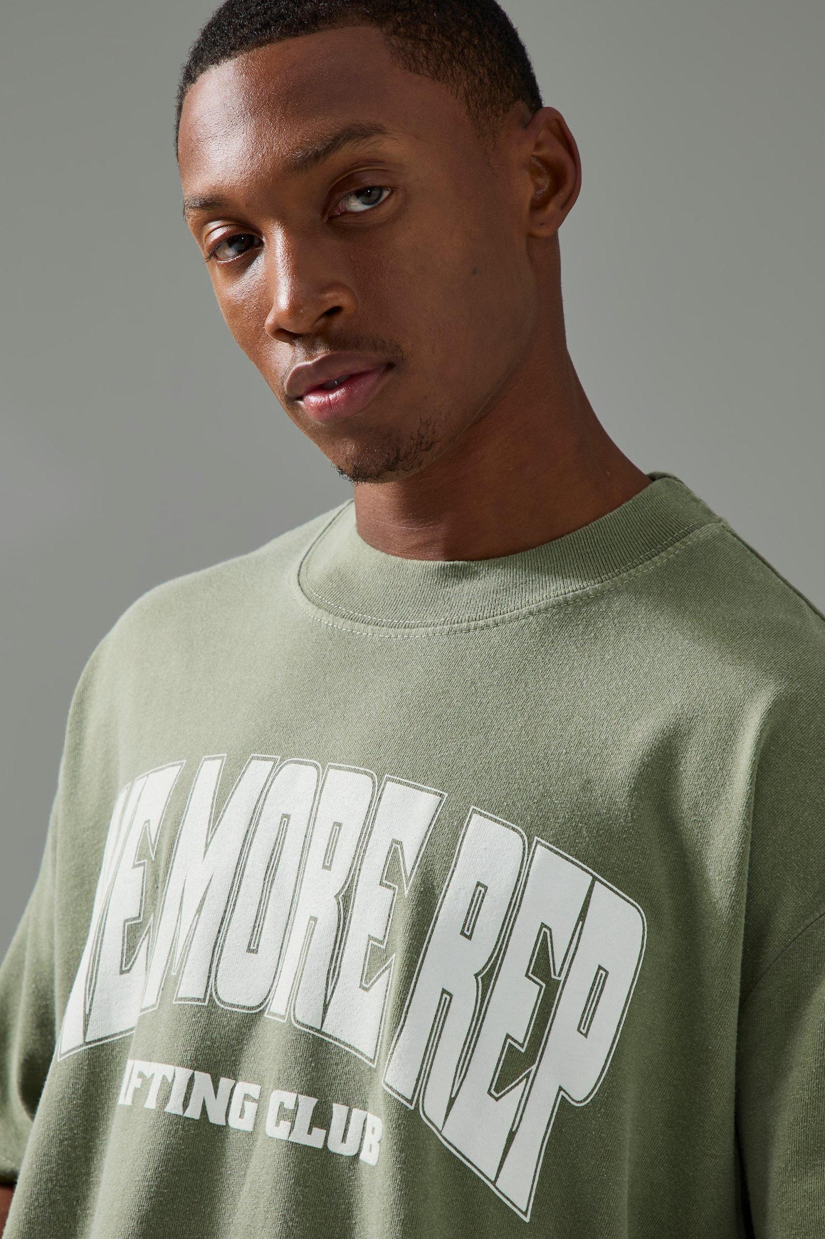 Mens Green Man Active One More Rep Oversized Over-dye T-shirt - Work out in style This collection of gym t-shirts is a must have in your workout wardrobe, perfect for the gym goer to the outdoor adventurer. Each piece is made from fabric that guarantees maximum comfort and performance during the most intense workouts. These gym t-shirts come in a variety of colours and patterns, from bold and eye-catching to cool and tonal, making finding the perfect gym top easy for you. Team with a pair of your favourite gym joggers and gym trainers.Style: Printed T-ShirtFabric: JerseyLength: RegularNeckline: CrewSleeve Length: Short Sleeve