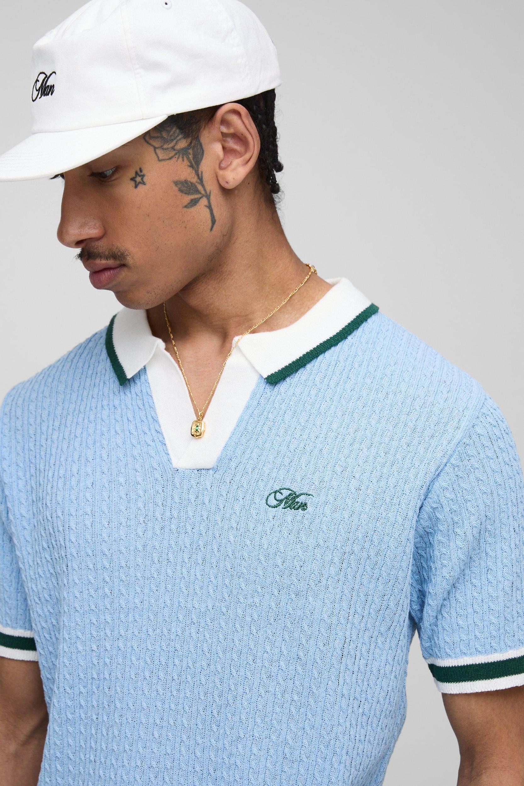 MAN Boxy Cable Embroidered Knitted Polo | boohooMAN USA