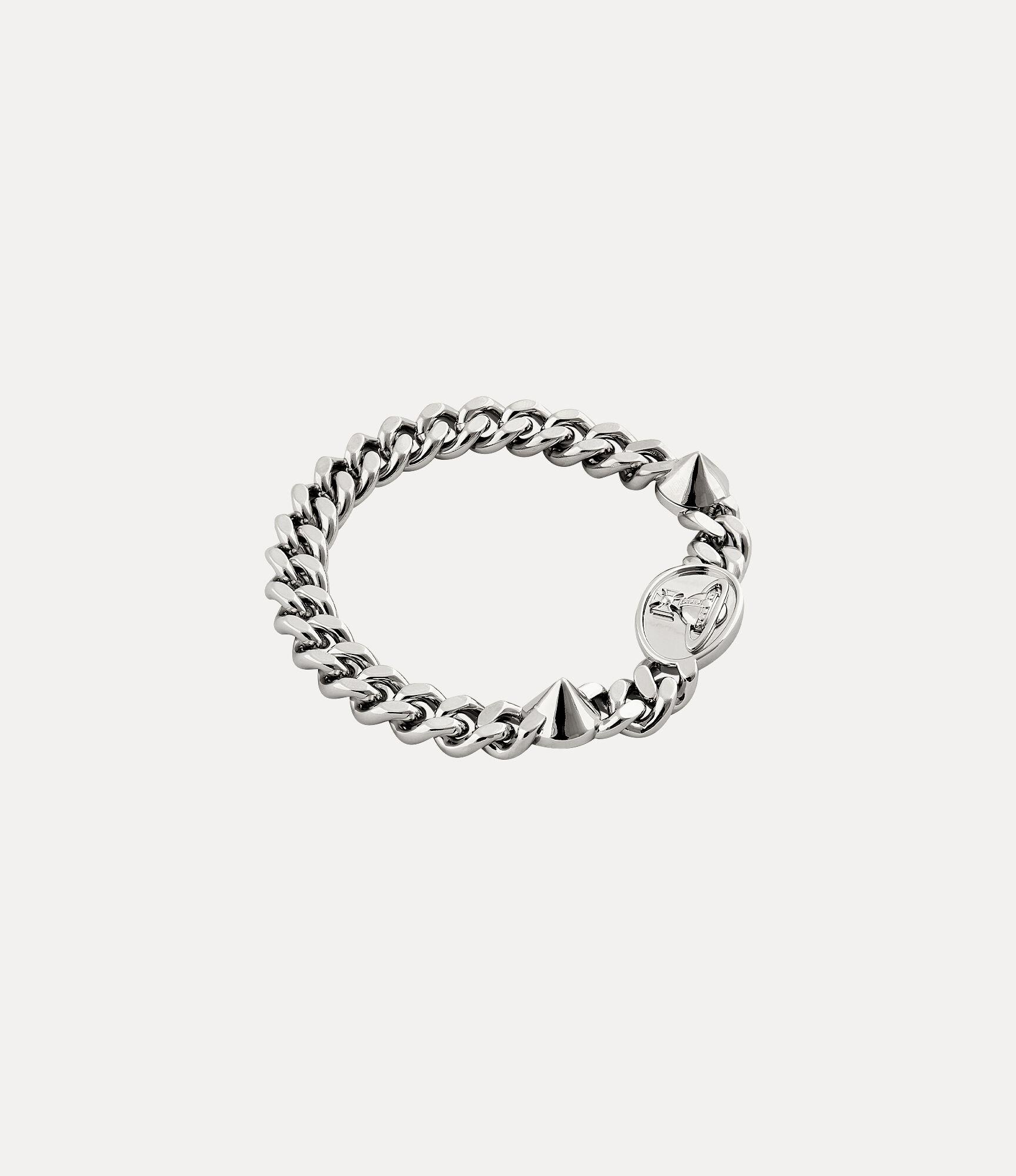 Our Man. Chester bracelet features a chunky, diamond-cut curb chain with spike studs interwoven throughout the design, finished with an oval plaque that is branded with our signature orb motif at the centre. The piece fastens with a secure magnetic stud closure, complete with silver-tone plating.