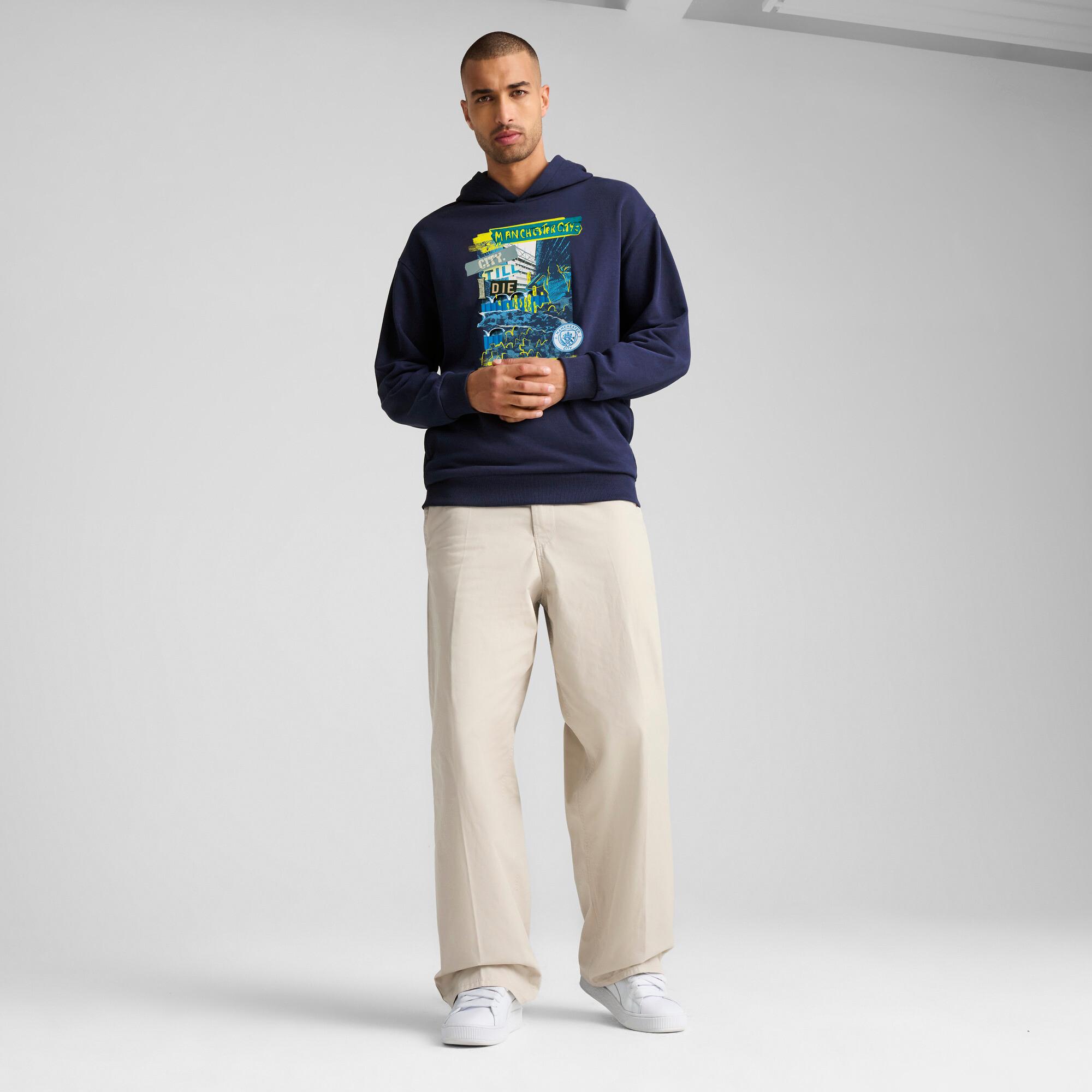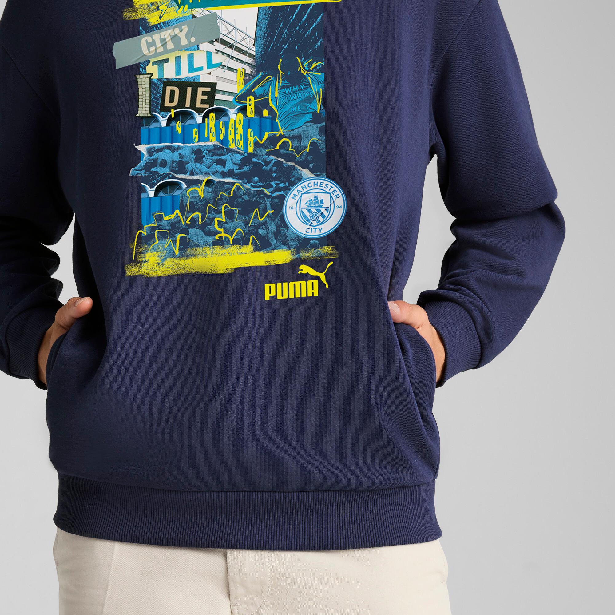 Rep your love for the Cityzens with this PUMA hoodie. Featuring bold graphics and the iconic Man City crest, it's perfect for cheering at the Etihad Stadium or hanging out with friends. Show your true colors and embrace the spirit of Manchester's best club.Made with at least 20% recycled cottonRelaxed fitFrench Terry materialRegular lengthHoodLong sleevesManchester City graphic on the frontManchester City badge and PUMA Cat logo on the front