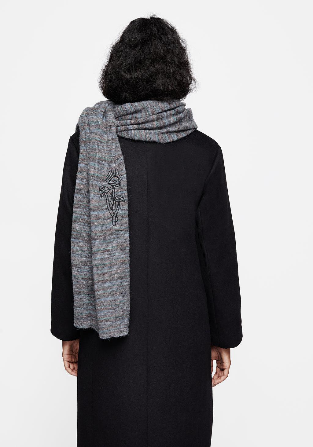 Scream if you wanna go faster- Grey moon & mushroom embroidered knit scarf - Long length to envelope you in warmth - Dimensional blue-grey wool-blend knit - Black moon & mushroom embroideries on ends - Life is simply cosier with a scarf 45% nylon, 30% polyester, 15% acrylic, 10% wool