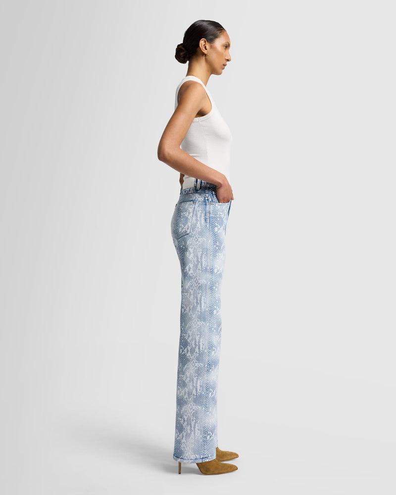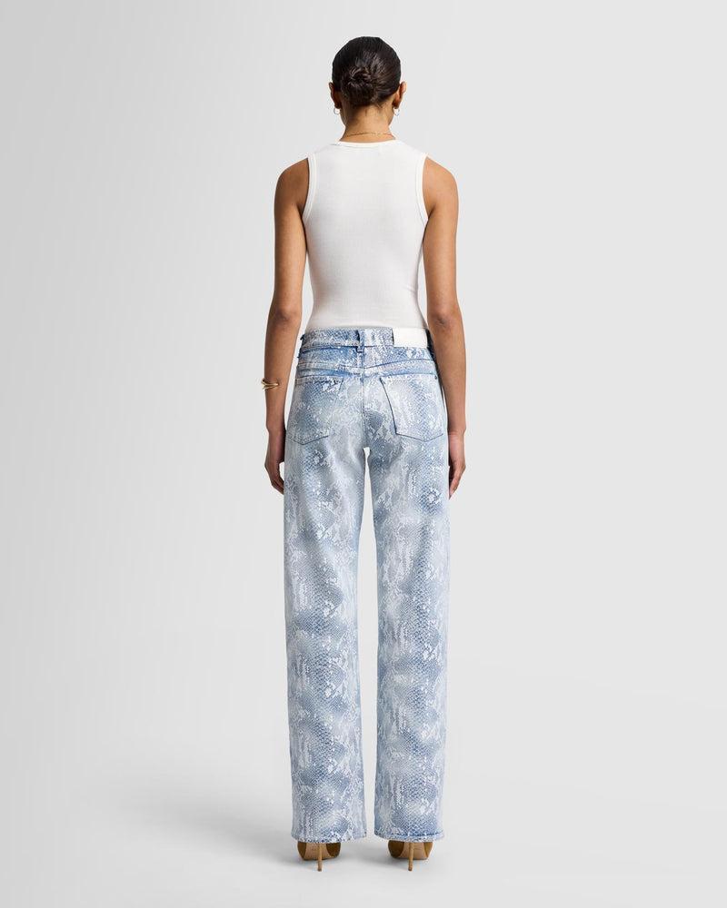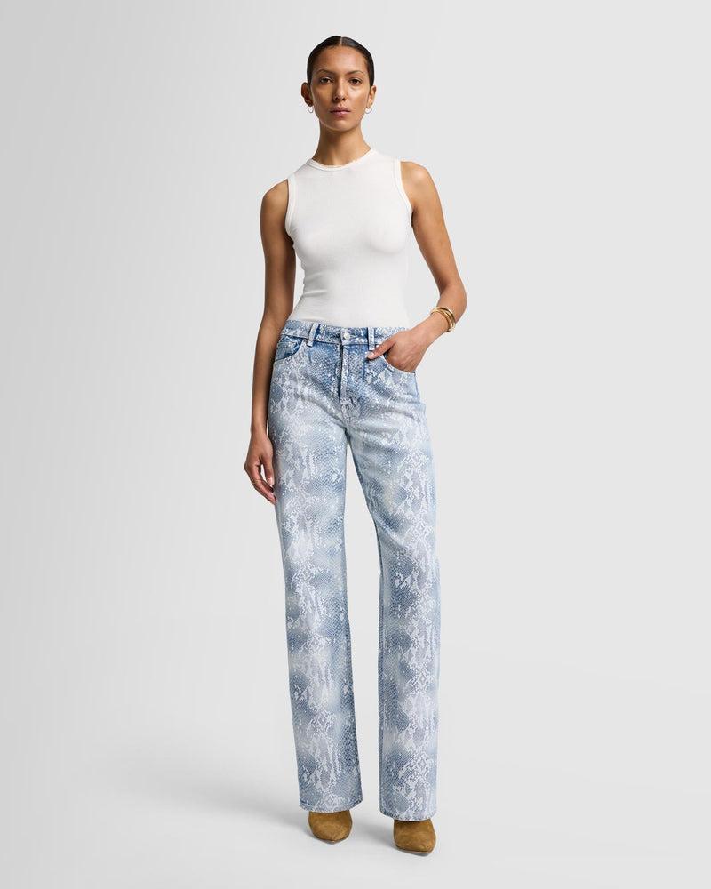 Fits like: A high-rise, full-length straight leg with a slightly relaxed fit. Feels like: Classic, rigid denim with no stretch to it. Denim that gets better with every wear. The Details: Coated snake-skin print atop a pale blue denim base Coated denim offers the look of leather with the comfort of 7 denim Zip closure