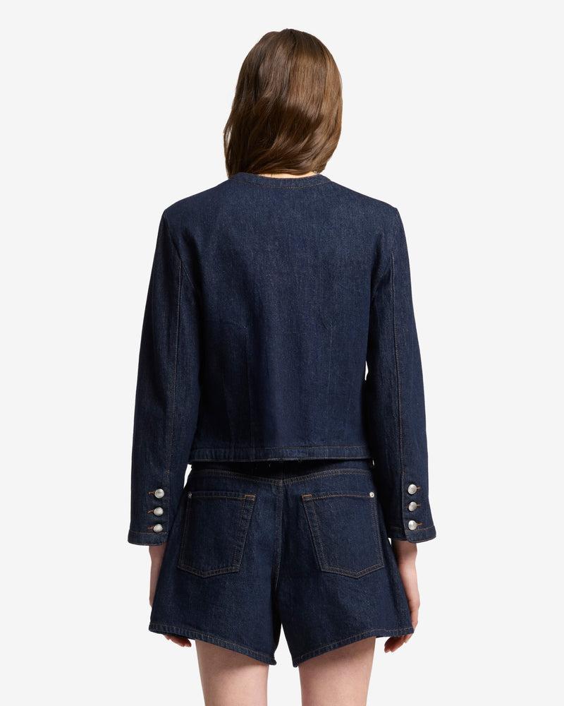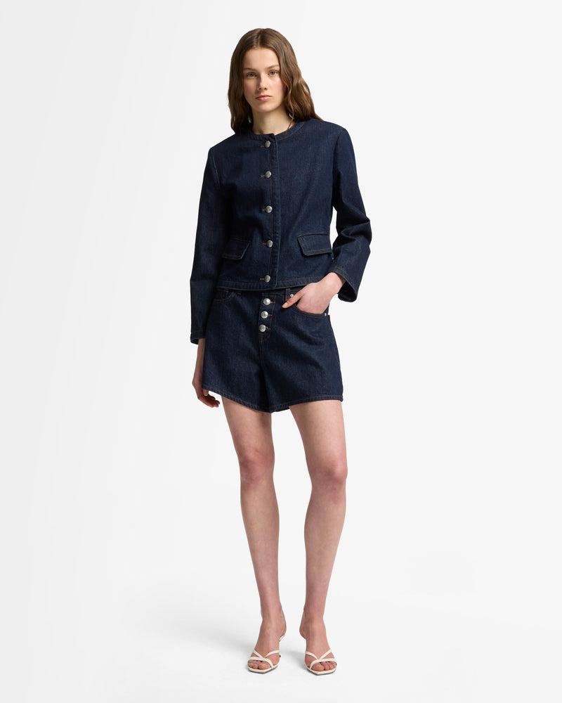 Fits like: A sleek, collarless denim jacket with a clean, streamlined fit that sits comfortably at the waist for a contemporary, sophisticated look. Feels like: Rigid denim that holds its shape while evolving into a softer, more lived-in fit over time. The Details: Dark Indigo Wash Front button closure Silver-tone butt