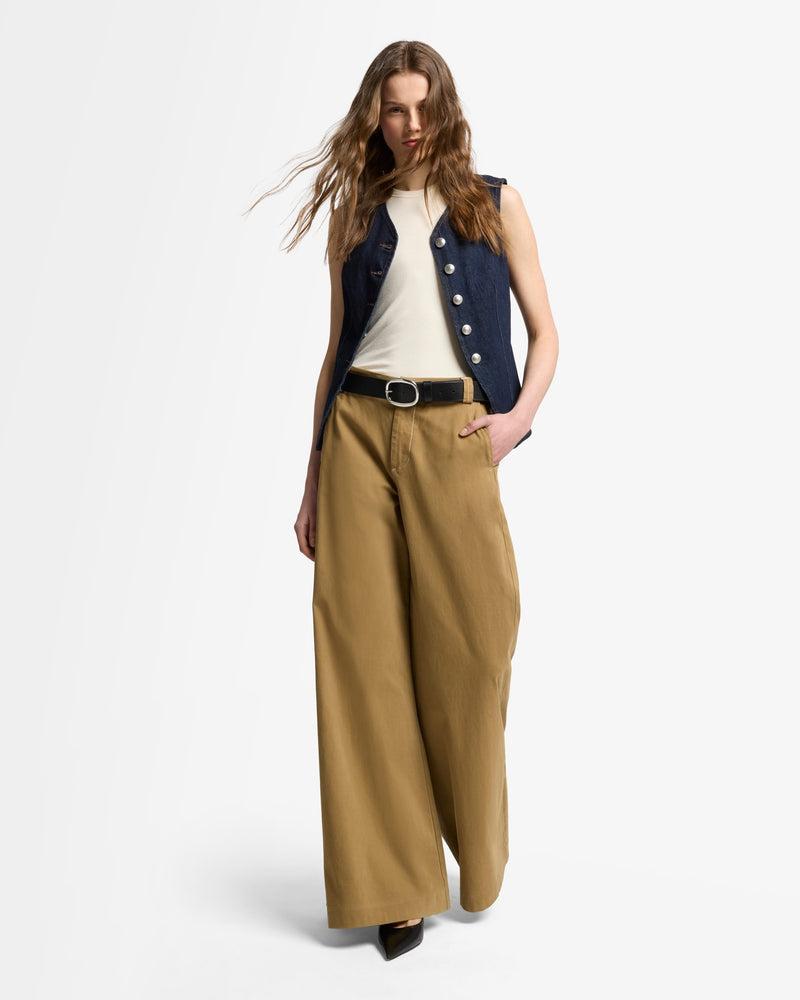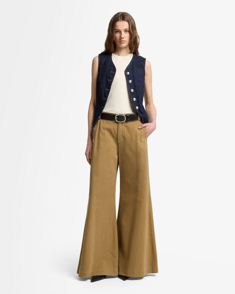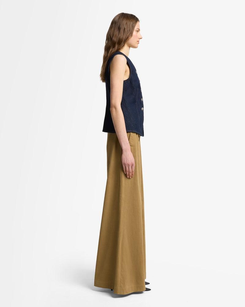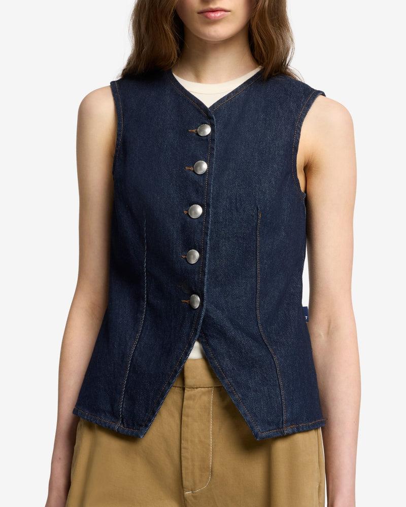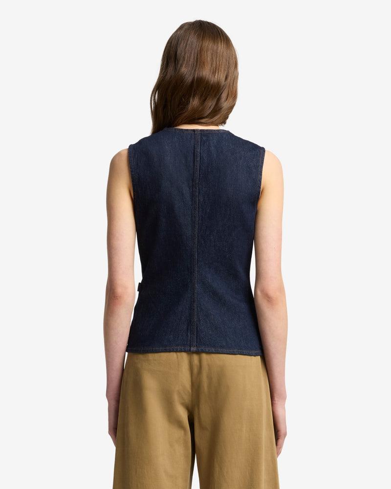 Fits like: A fitted vneck vest that contours to the body, offering a flattering silhouette with a sleek, modern tailored vibeFeels like: Rigid denim that holds its shape while evolving into a softer, more lived-in fit over time. The Details: Rigid Sleeveless Dark wash denim Seam details Front button closure Silver dome