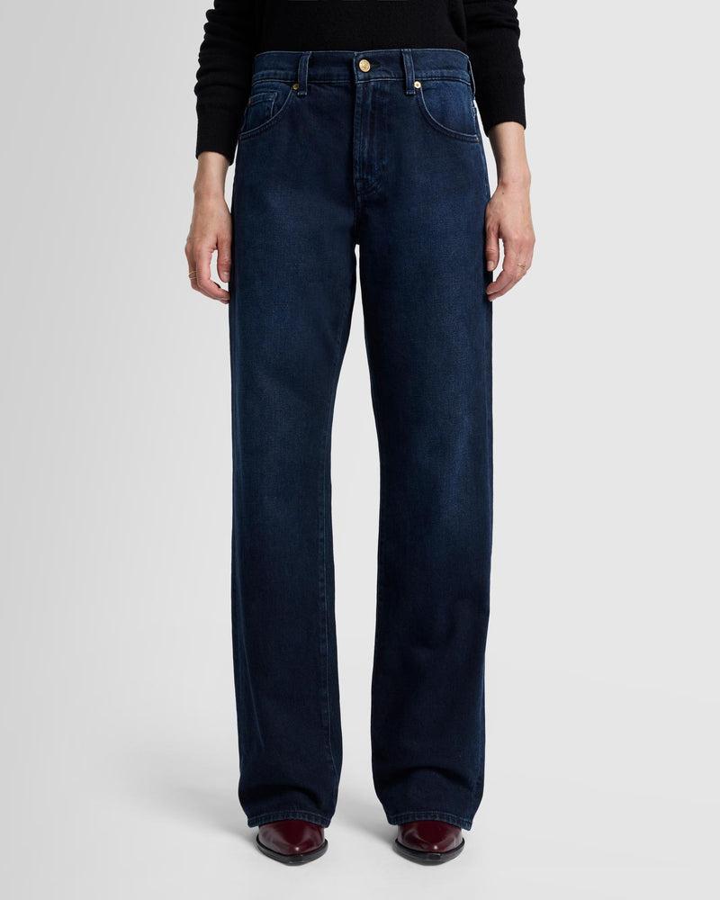 Fits like: A high-rise, full-length straight leg with a slightly relaxed fit. Feels like: Classic, rigid denim with no stretch to it. Denim that gets better with every wear. The Details: Dark indigo rinse Zip closure Tonal navy leather logo patch
