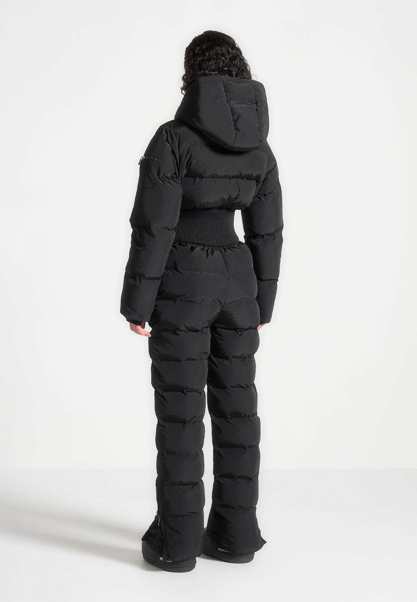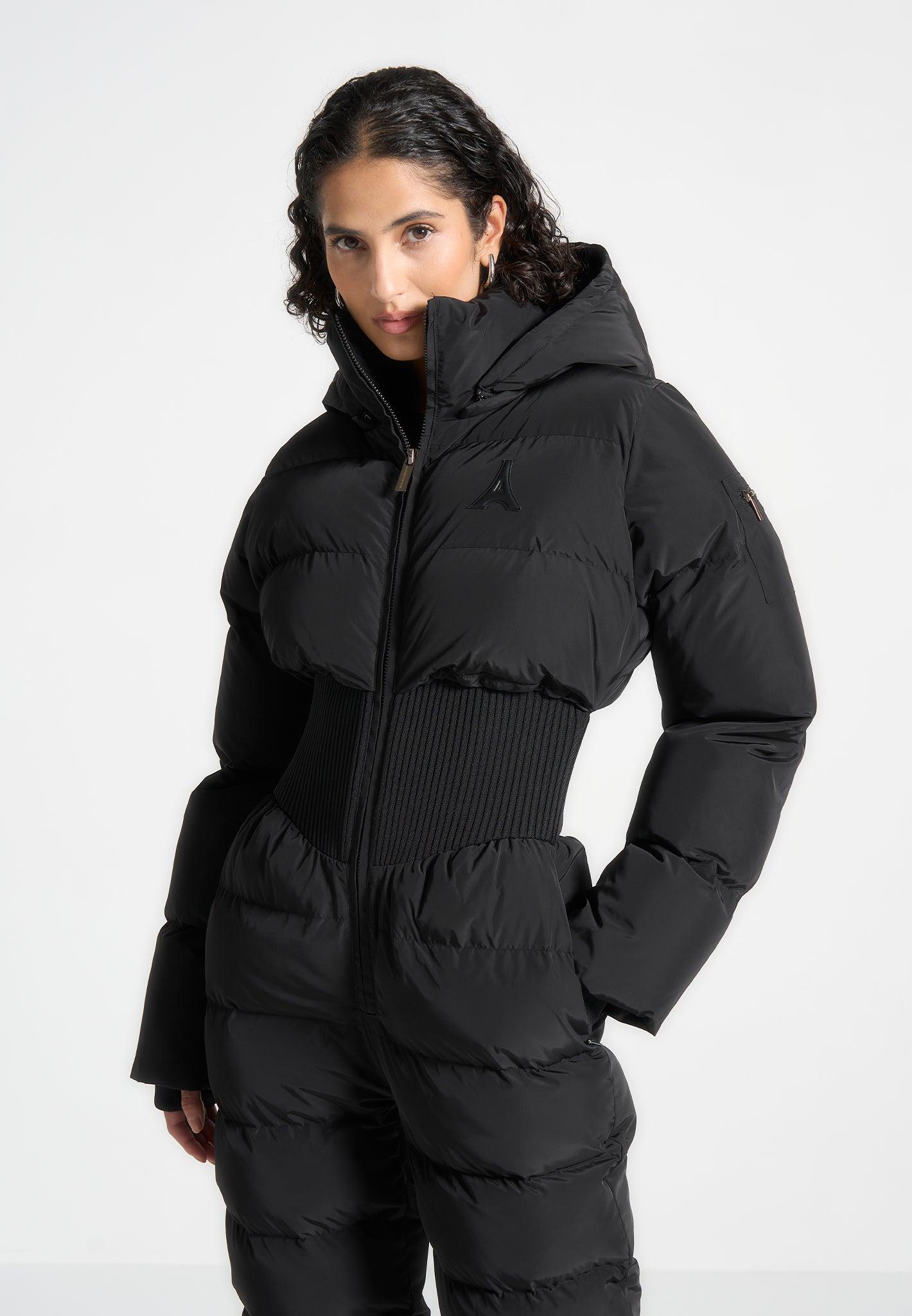 This ski suit offers full-length coverage in a sleek, streamlined silhouette. Ribbed corset detailing adds structure and definition, while practical features including a zipped sleeve pocket and hem zip detail combine functionality with a modern edge. Ski suit construction for full-length coverage Ribbed corset detailing for structure and definition Zipped sleeve pocket for functional storage Hem zip detail for a modern, versatile finish Manière De Voir vegan leather Eiffel to front