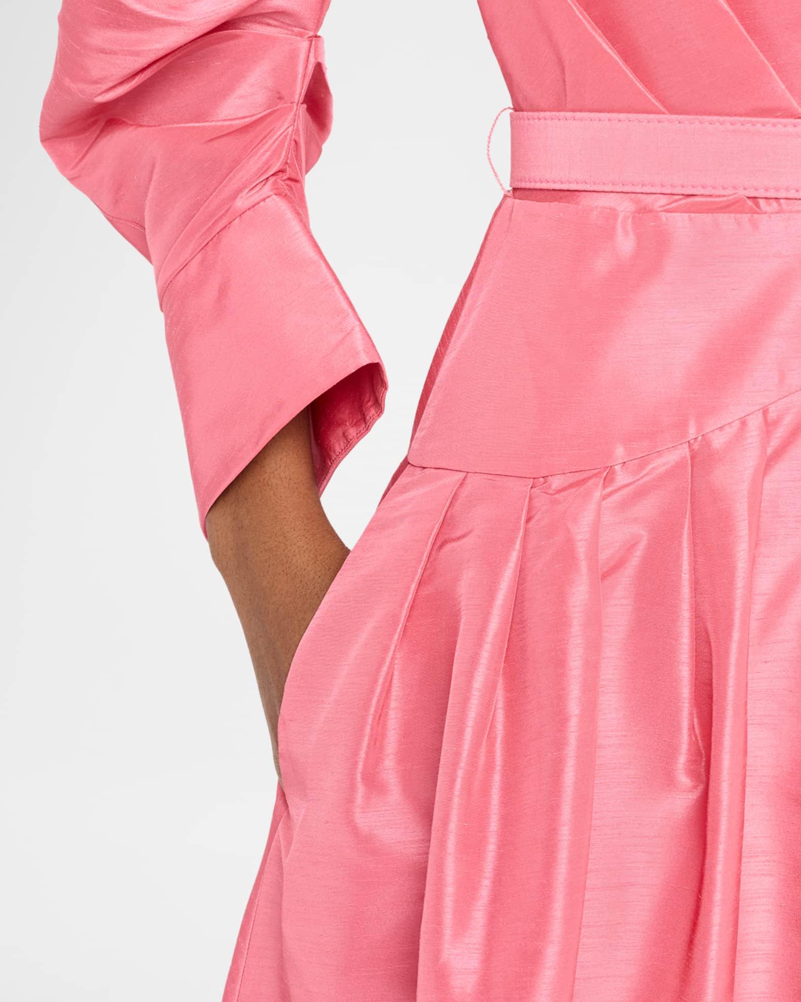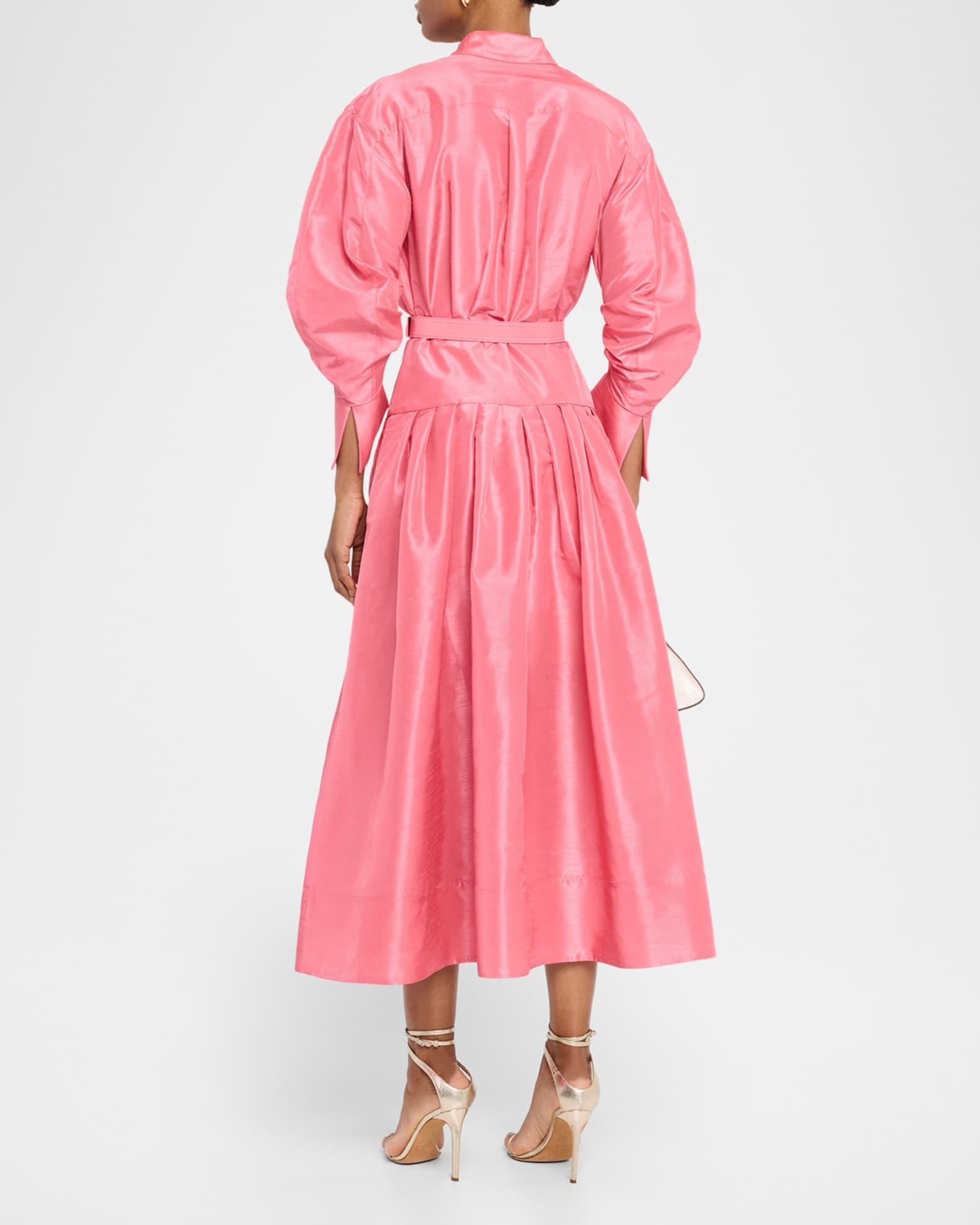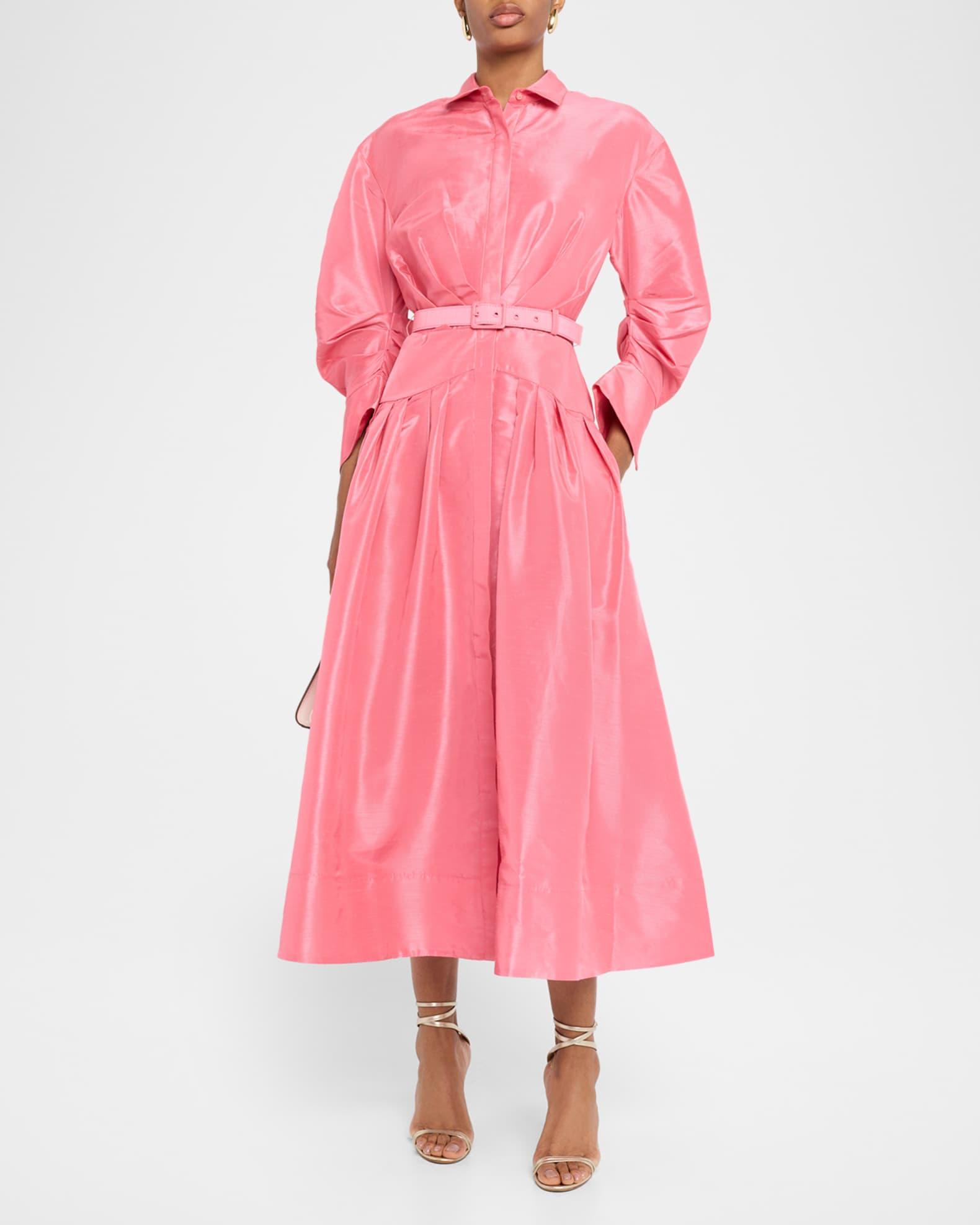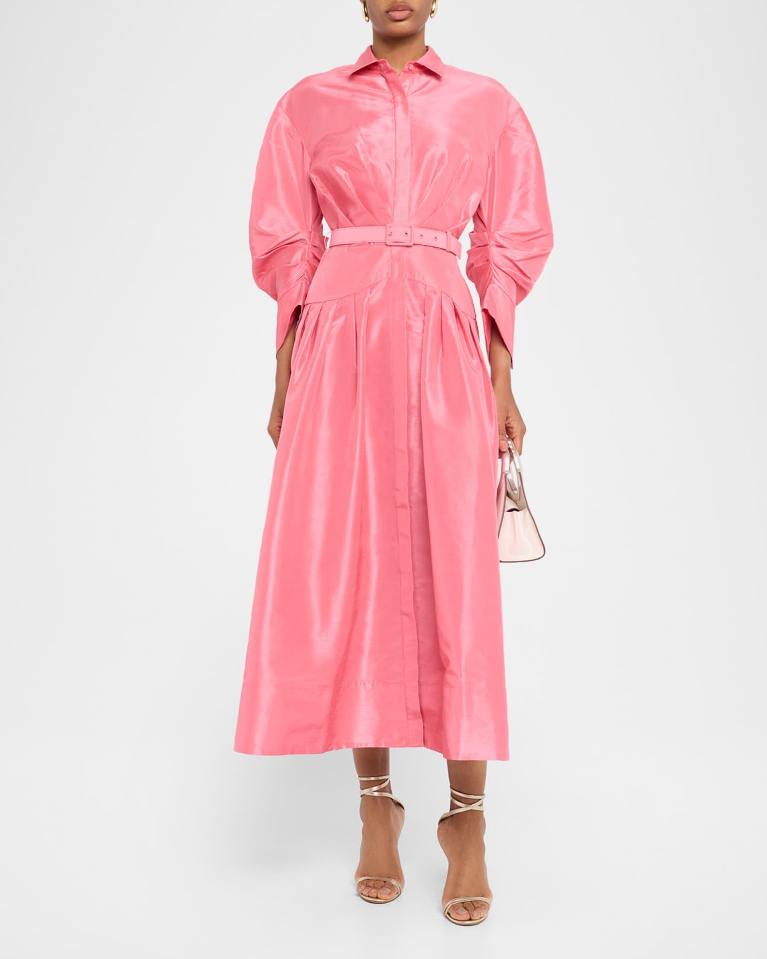 Cut from slub taffeta, the REBECCA VALLANCE "Maple" midi shirtdress is structured with a pleated skirt and matte belt Spread collar; concealed button front 3/4 cocoon sleeves Split cuffs Box-pleated back yoke Drop waist On-seam pockets Hem falls below the knee A-line silhouette Polyester Dry clean Imported