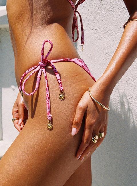 Two thin fastening at side with dainty charm, high cut leg, cheeky style bottom, gold-toned ring detail