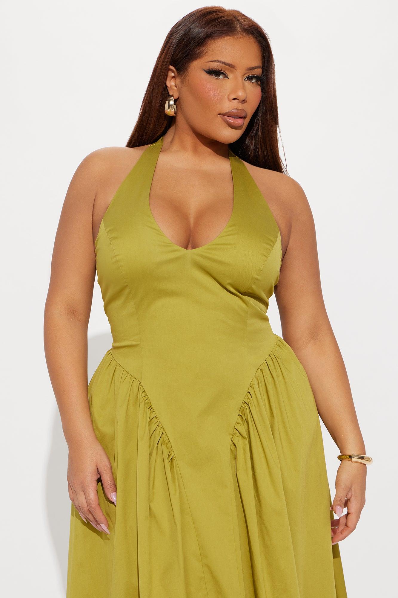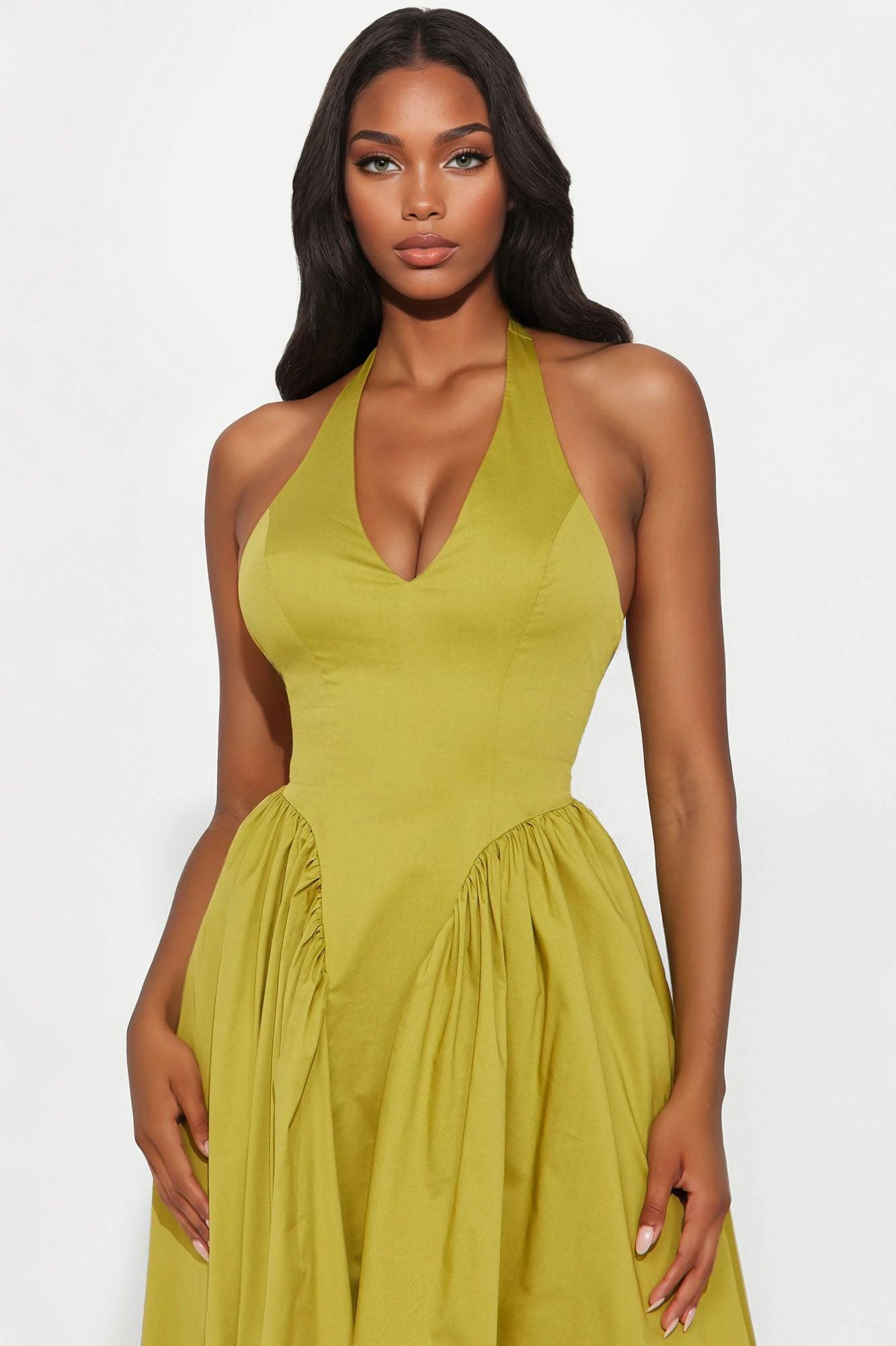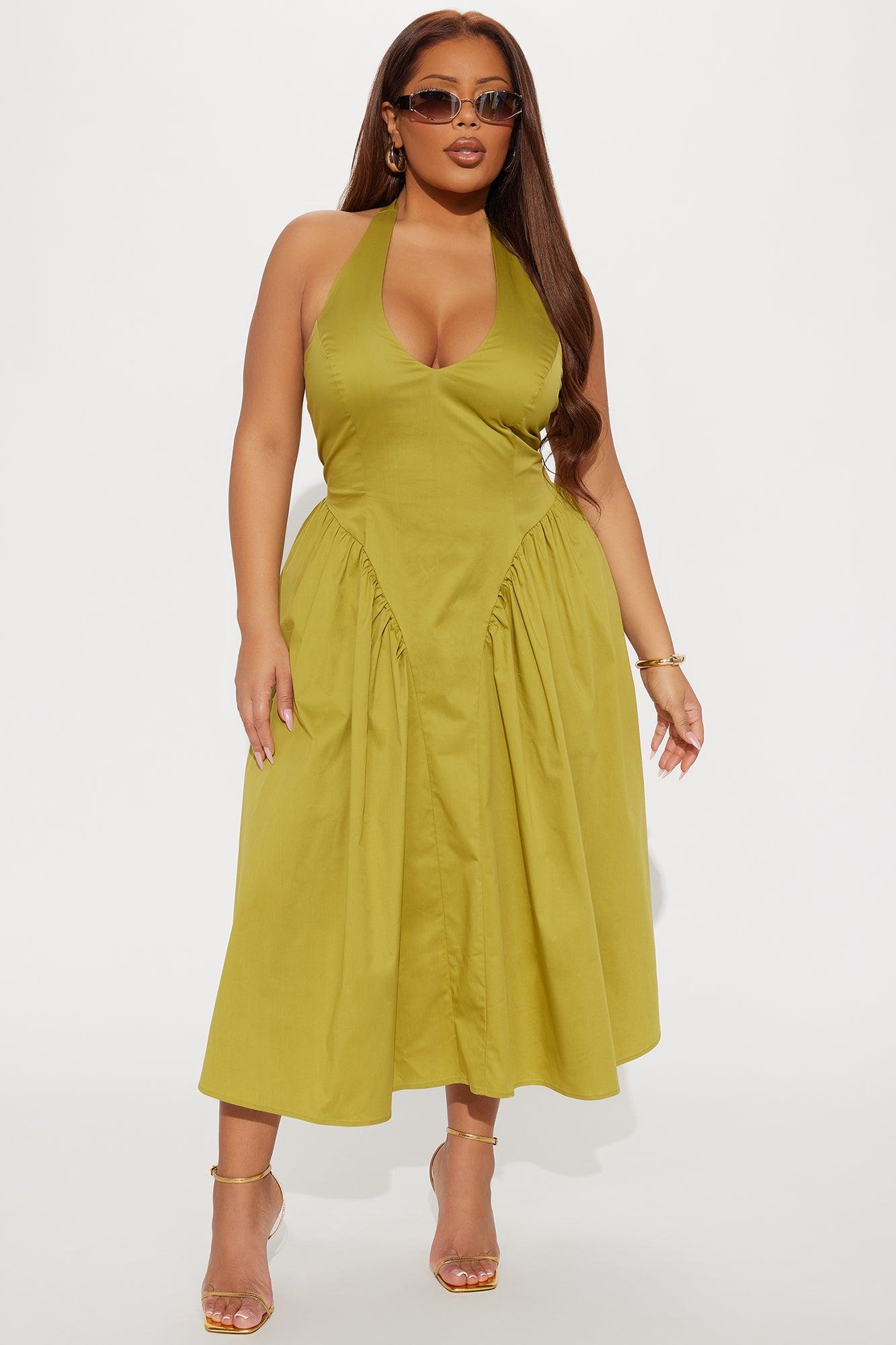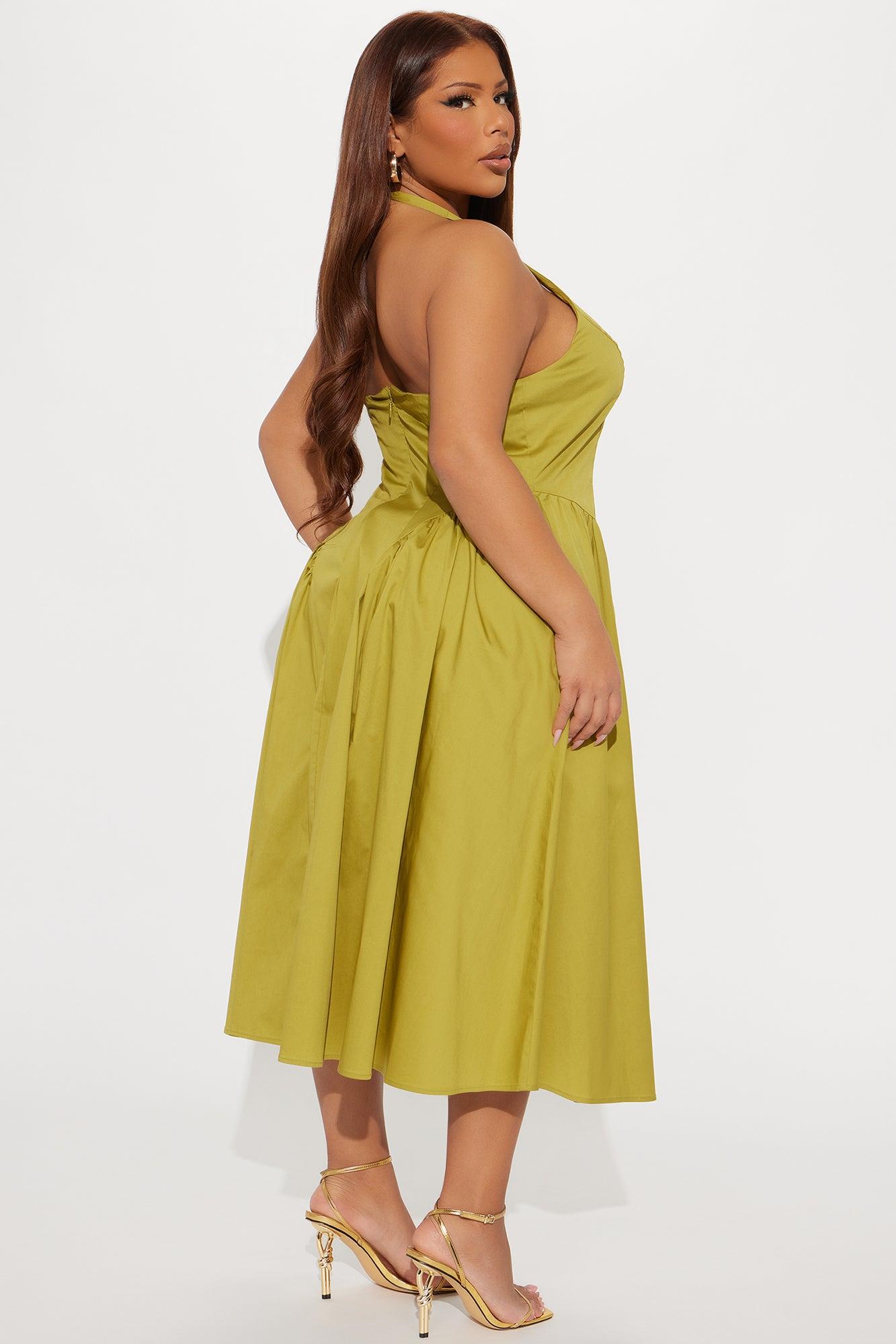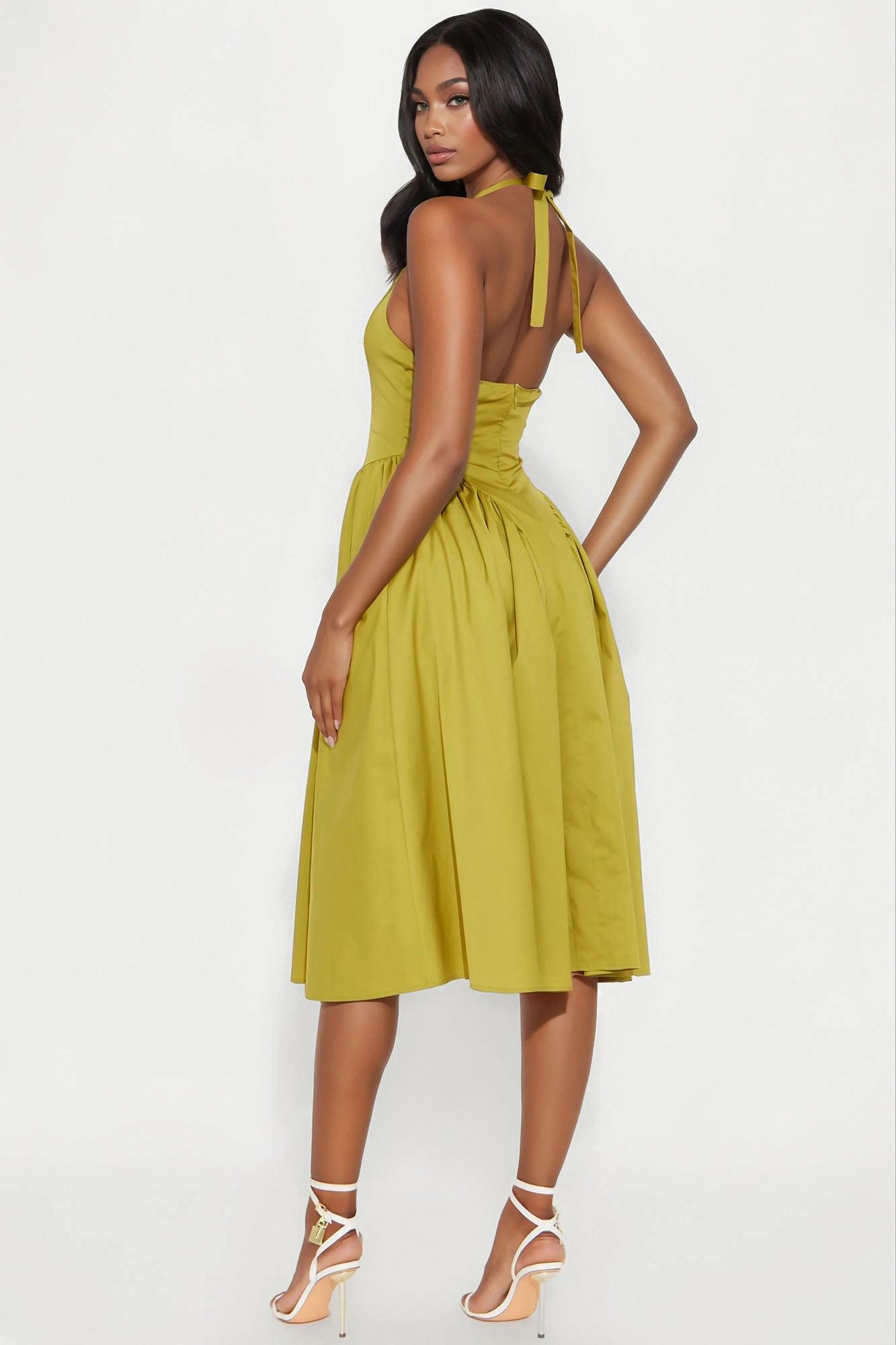 Available In Chartreuse And Pink. Midi Dress V-Neck Halter Corset Waist Back Zipper Length = 43" Shell: 62% Cotton 35% Nylon 3% Spandex Lining: 100% Polyester Imported