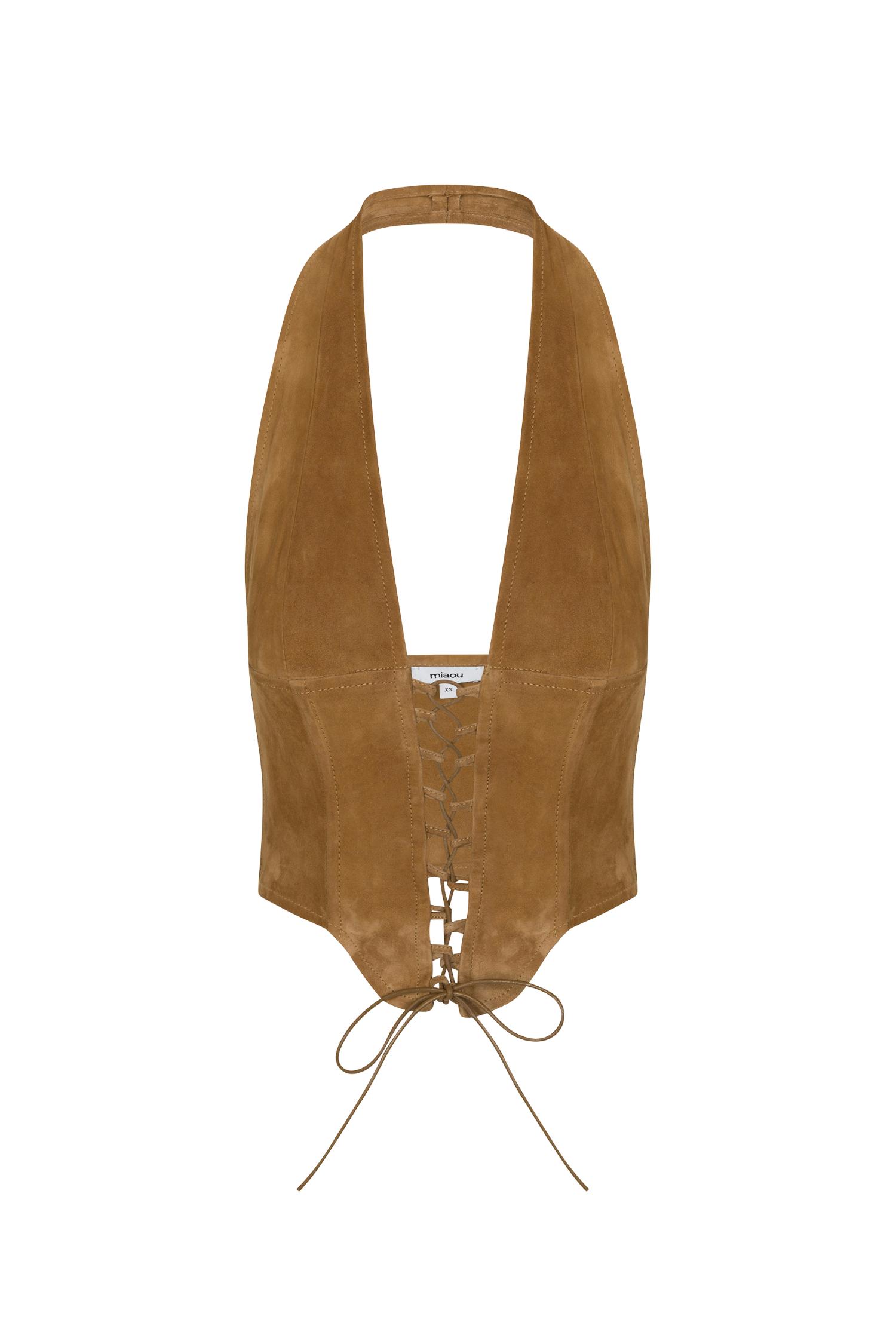 The Mara Corset - now in Tan Suede. Features a plunging halter neckline, fully fastened with front lace-up closure.