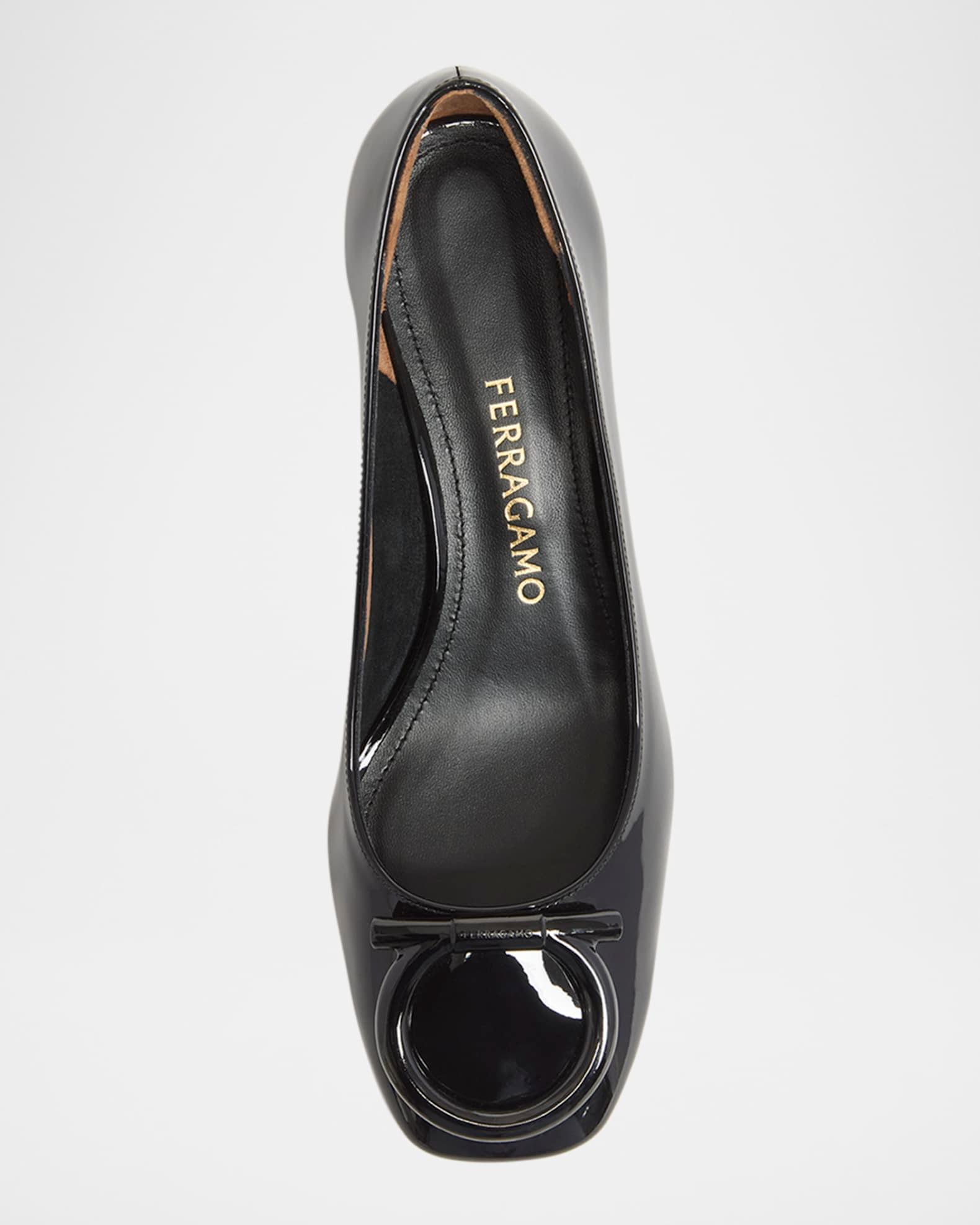 Ferragamo "Mara" patent leather pumps featuring a logo-engraved Gancini medallion 1.50 in / 40 mm block heel Almond toe Slip-on style Leather outsole Lining: Leather Professional cleaning recommended Made in Italy