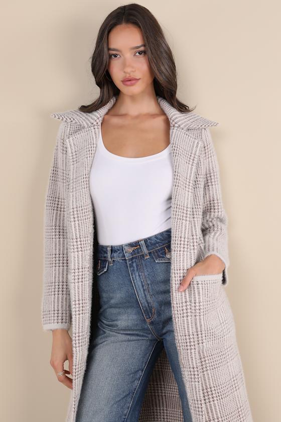 Before you head out, wrap yourself up in the Sage the Label Marceau Ivory and Brown Houndstooth Eyelash Knit Coat! Fuzzy eyelash knit, with a brown houndstooth-style pattern, shapes this effortless coat with a notched collared neckline and long sleeves. The longline silhouette features an open-front design and functional, twin patch pockets that keep your hands toasty warm on those chilly days!
