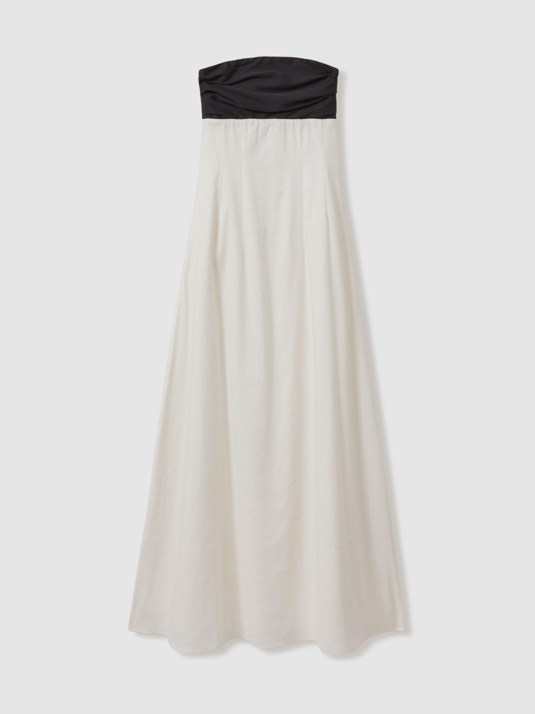 The Marcia maxi dress has a hybrid construction with a ruched, strapless jersey bust and an Italian linen skirt. Contrasting against the bust, the skirt starts high on the body with an empire-style waistband. Hybrid linen-jersey construction. Strapless. Ruched bust. Empire waistband. Maxi length. Anna Quan, curated by Reiss, is a collection of women’s eveningwear borne at the intersection of minimalism and luxury. Discover these classic shapes, reimagined for a timeless style experience.