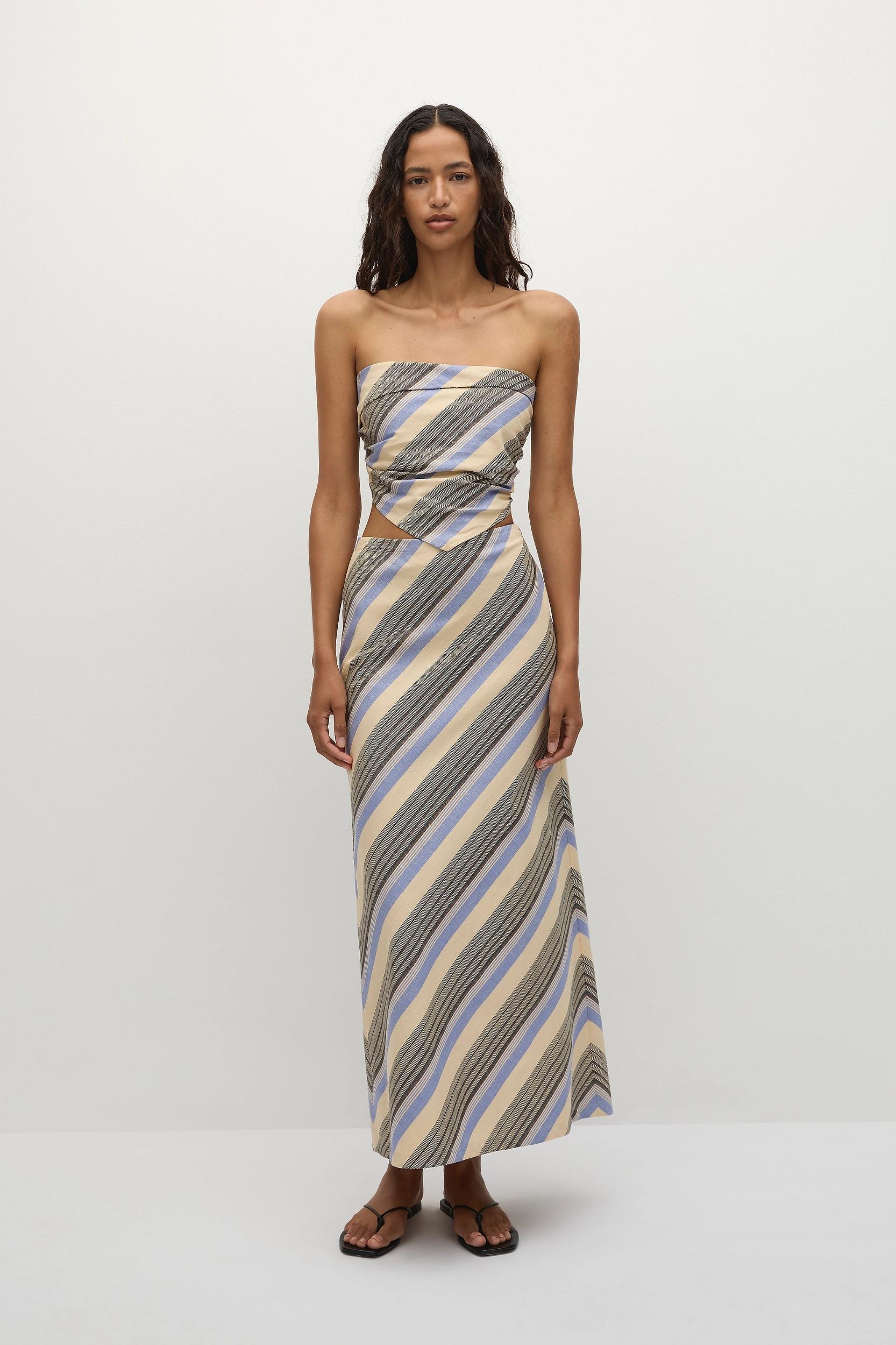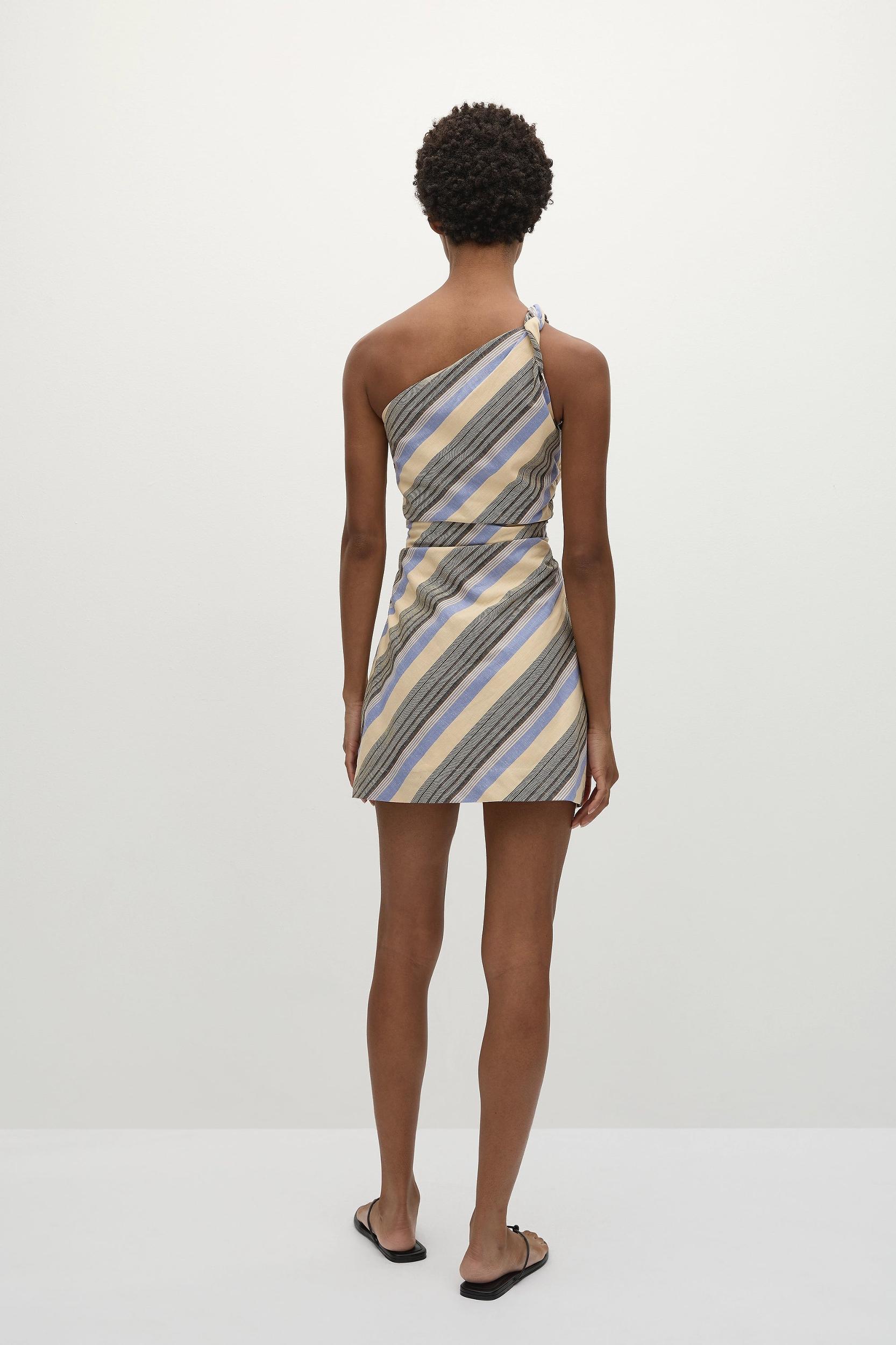 A one-shoulder mini dress, designed from a unique blend of organic cotton and European Flax® linen, yarn-dyed in a multi-colour stripe, inspired by the sun setting over the ocean. It features a twist tie detail at the shoulder and a slightly cinched waist with gathering on the side for a more flattering silhouette. Semi-fitted through the body, it finishes with a straight skirt cropping short. Style with a sandal or kitten heel for vacation dressing.This style runs slightly smaller through the bust and it is recommended to size up if in between sizes for a more comfortable fit. There is no elastic woven into the fabric so it does not offer any additional stretch.