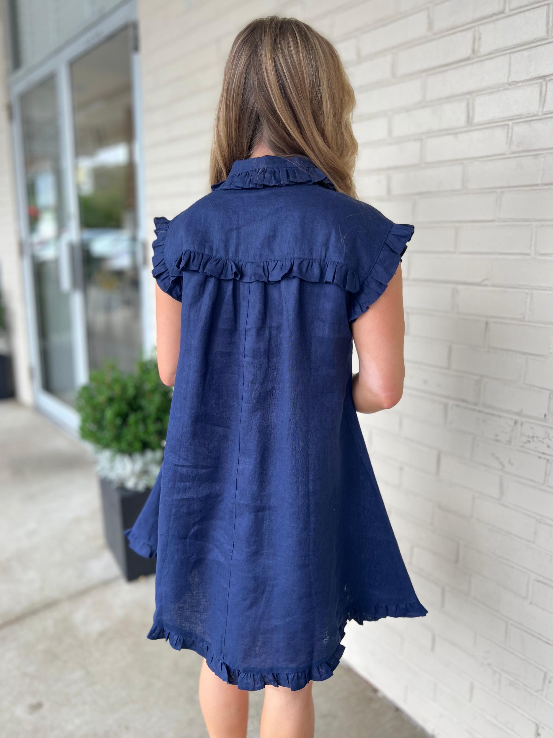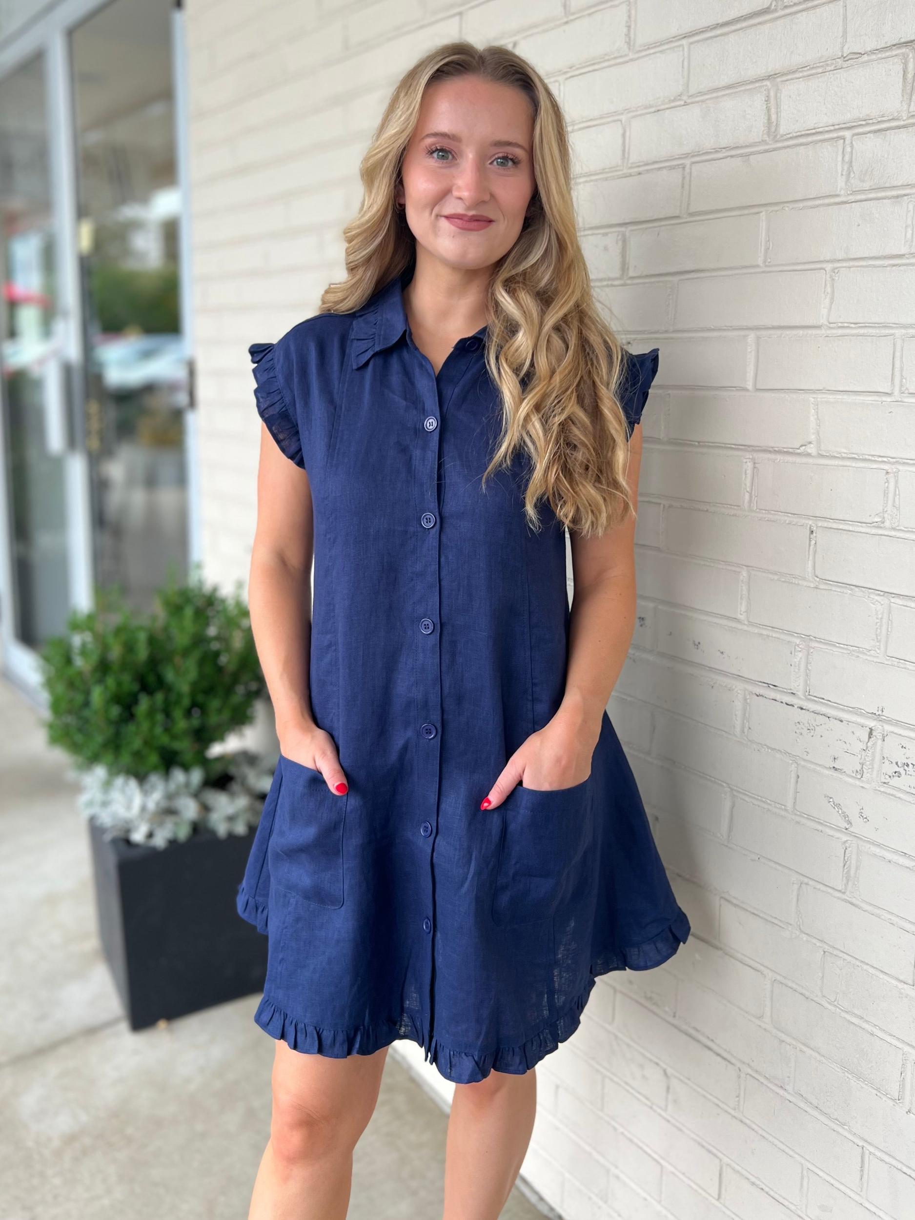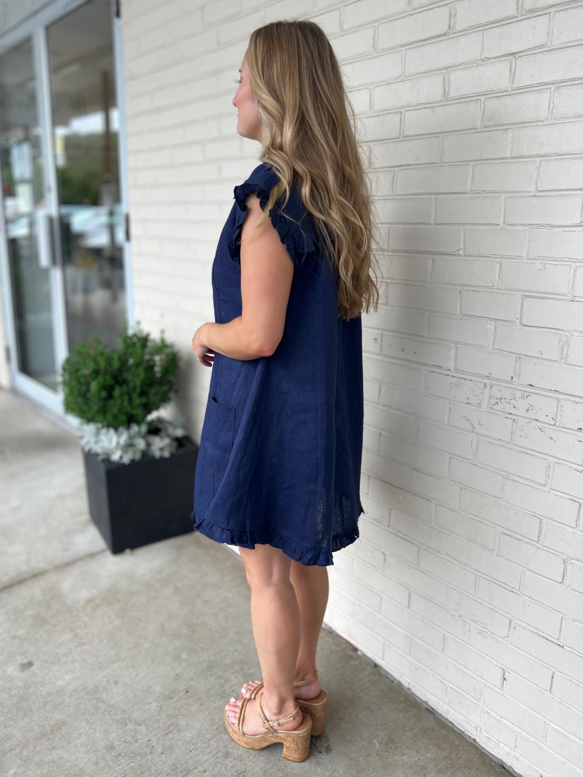The Margaret Dress is a fun and flirty choice with its navy linen fabric, button-front detail, and playful ruffle trim. Featuring convenient front pockets, it’s perfect for keeping essentials close while you enjoy a day out in style and comfort.