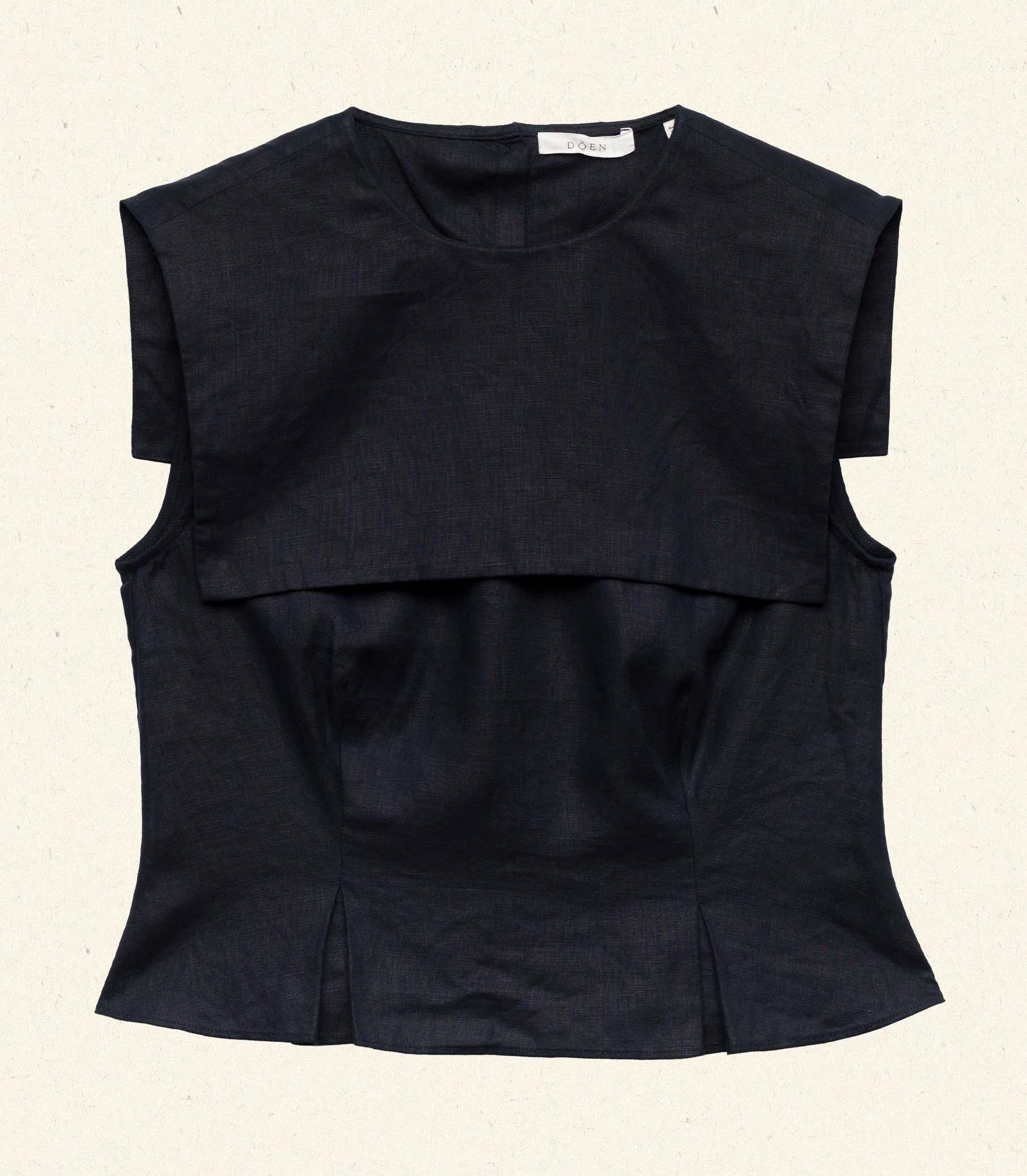 Tailored in soft midweight linen, the ‘60s-inspired Margie Top is a sleeveless style with a wide square sailor-style collar. A fitted silhouette is adorned with waist darts and box pleats for structure, while self-covered buttons extend down the back.
