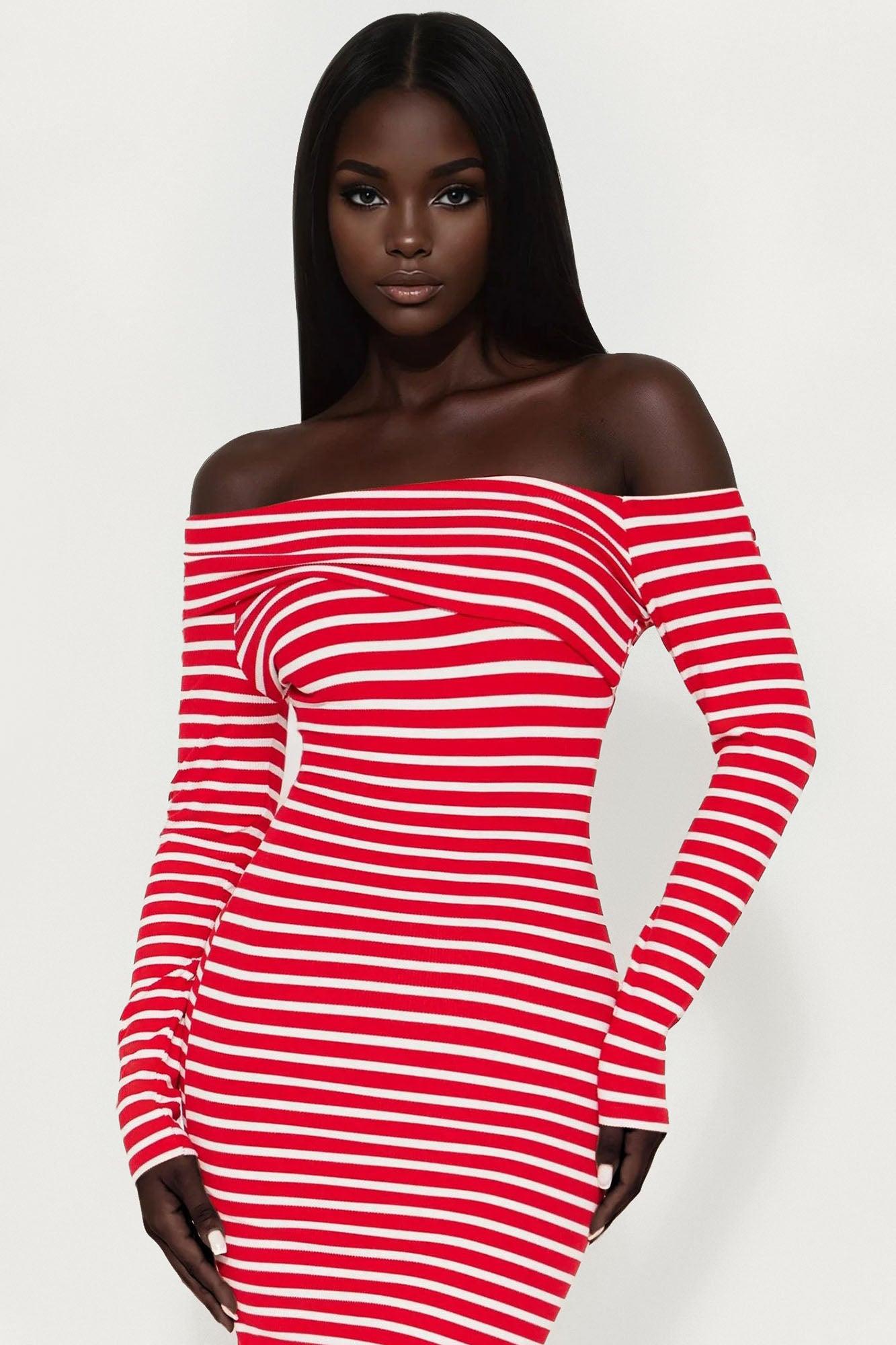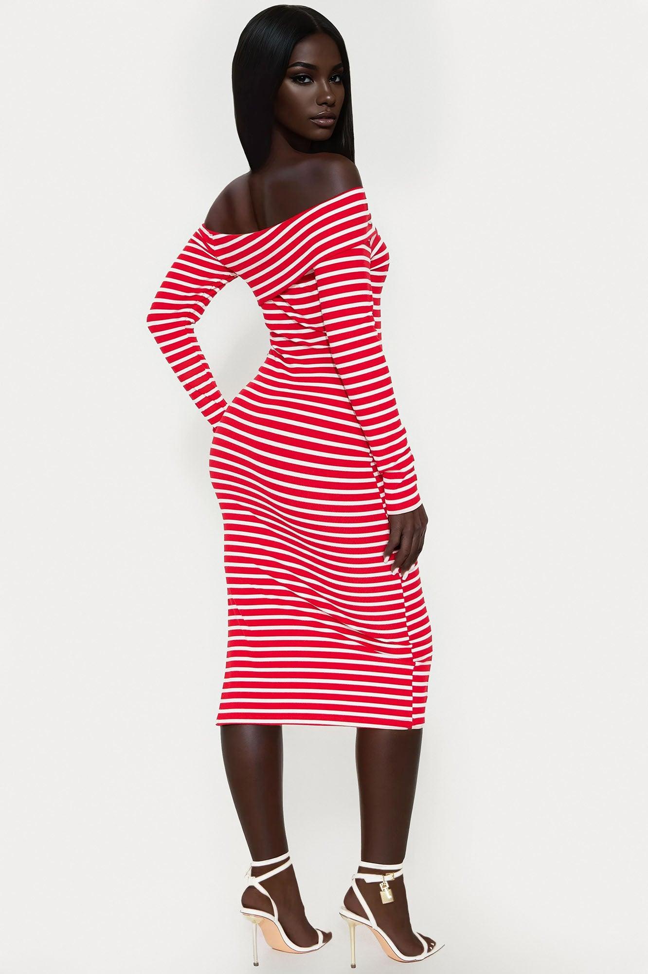 Margo Ribbed Long Sleeve Midi Dress - Red/White Female