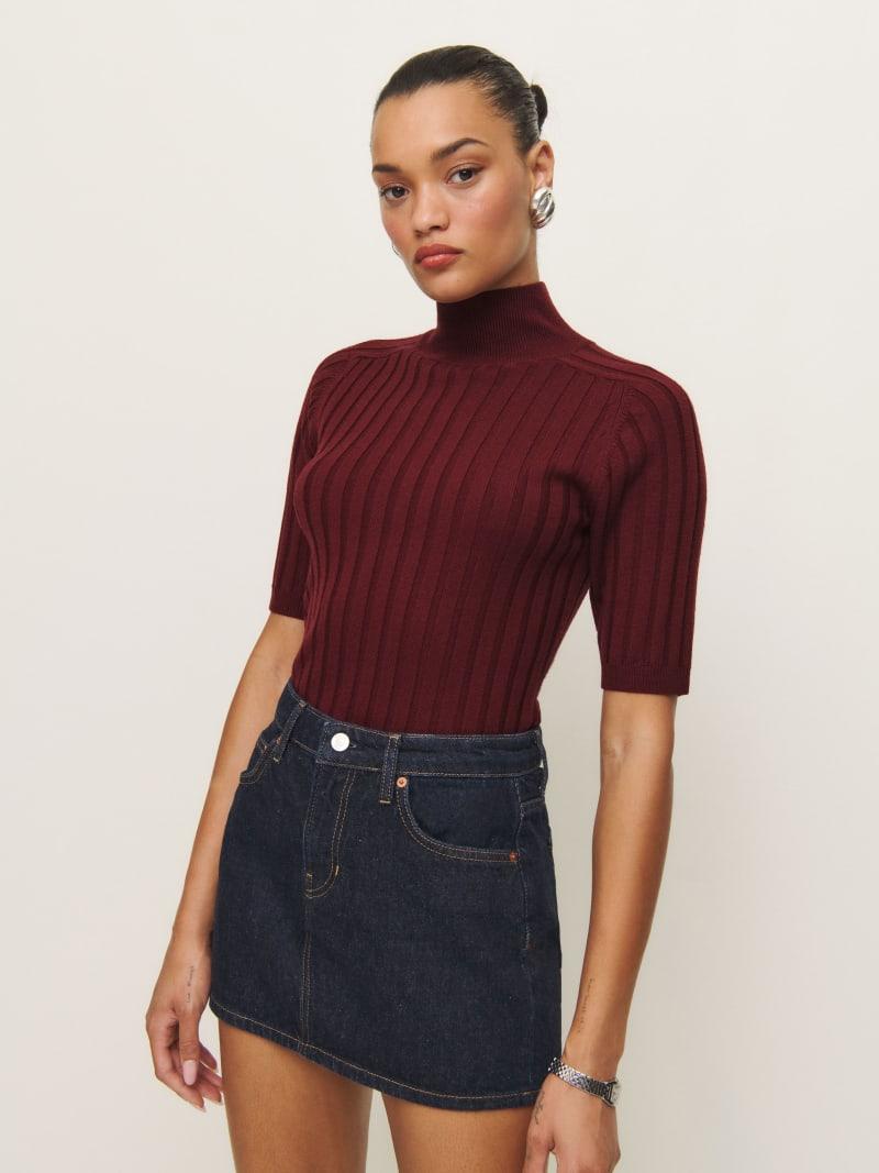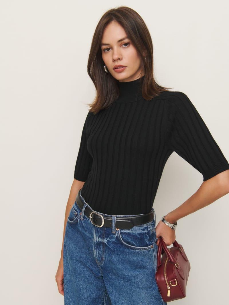 Layer up. Shop the Margoax Regenerative Merino Mock Neck Sweater from Reformation, a short-sleeve sweater with a mock neckline and ribbing throughout.