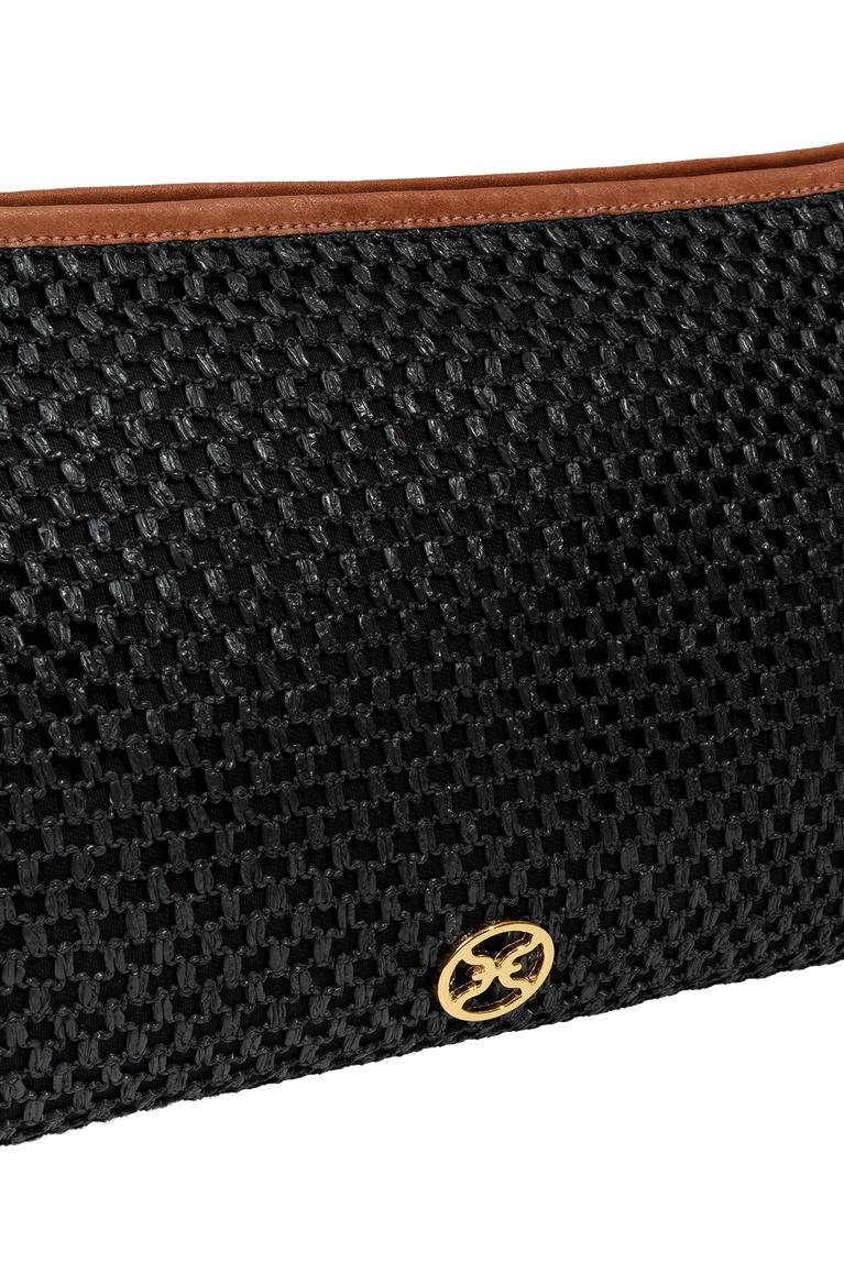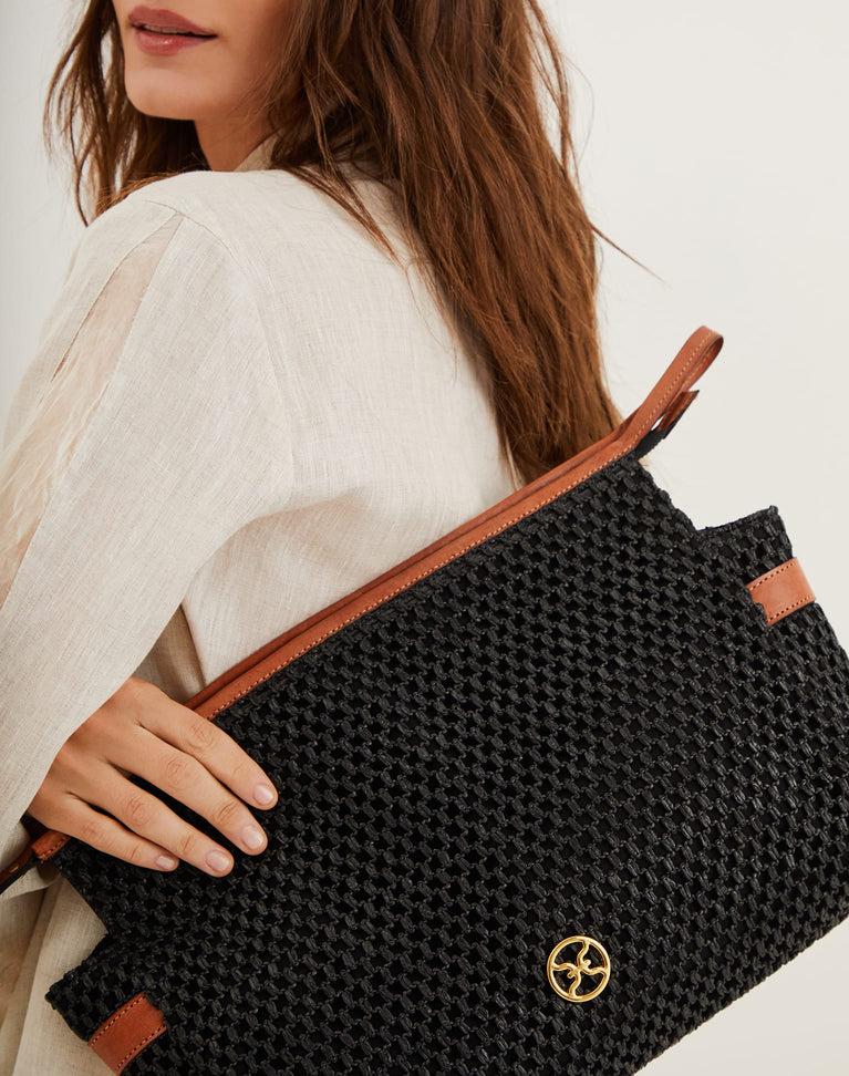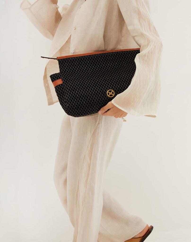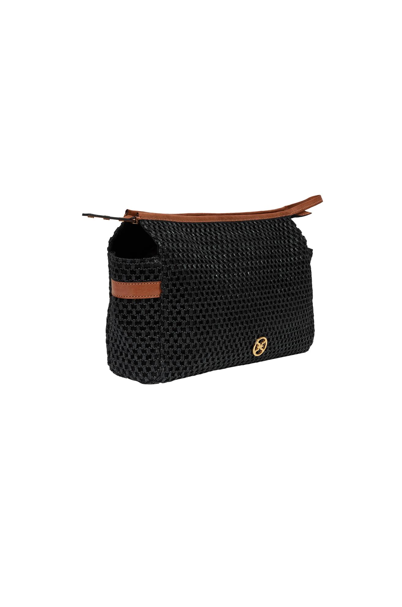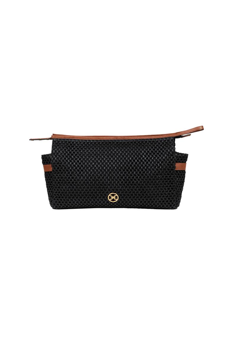 Black woven straw toiletry pouch accented with brown leather trim and the ViX logo—perfect for carrying your essentials with effortless style. Take it to the beach, style it as a chic clutch around town, or use it as an organizer inside your travel bag—versatile and effortlessly practical. Features: 14” L x 9” H x 4” D