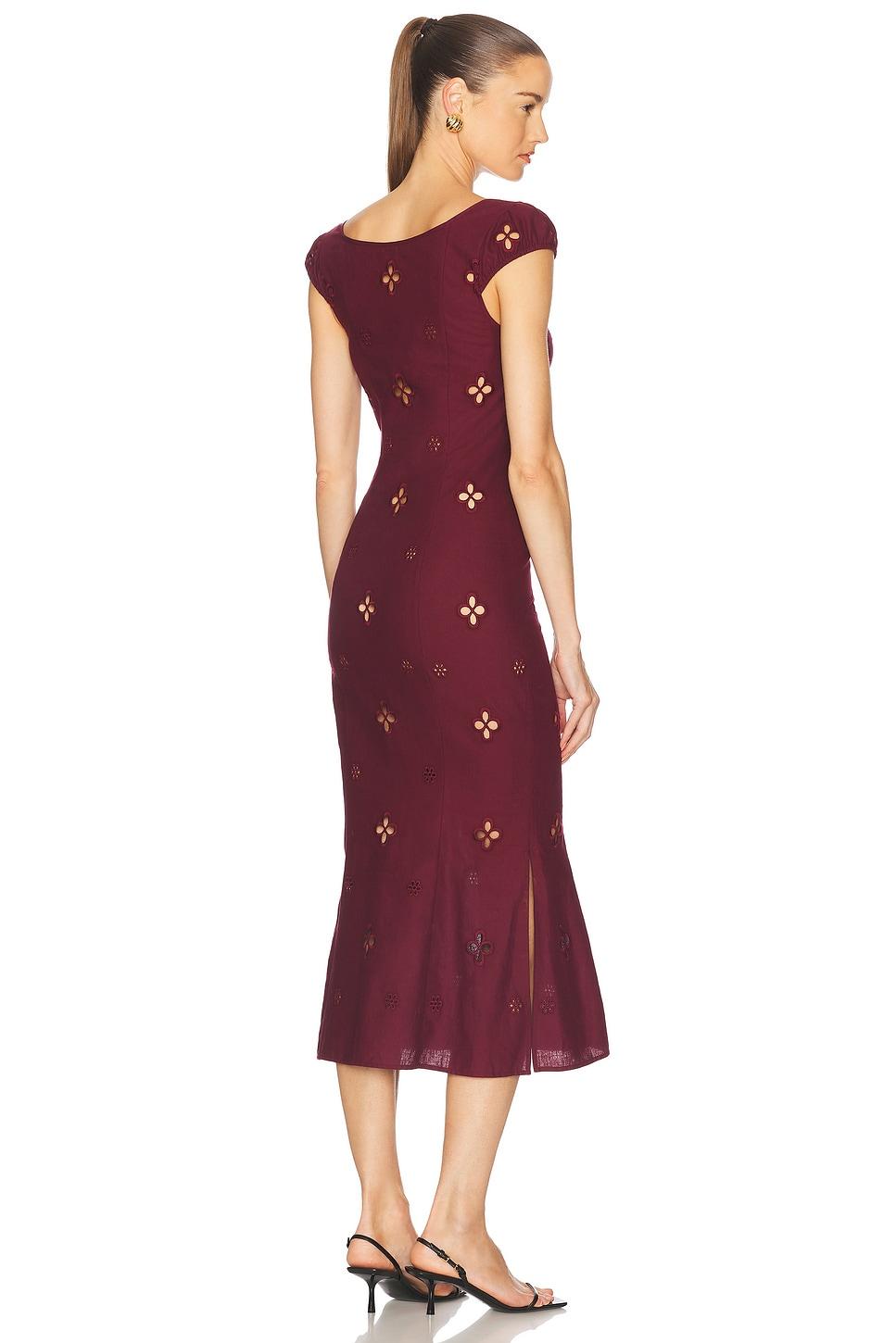 dress70% cotton, 30% linen / Made in China / Dry clean only / Unlined / Hidden side zipper closureFront partial button loop closure / Front cut-out detail / Twill fabric with eyelet detail throughout / Garment is made with a semi-sheer fabric, undergarments can show through / Our Style No. MRPF-WD43 / Manufacturer Style No. MP230 / Model is wearing size S.
