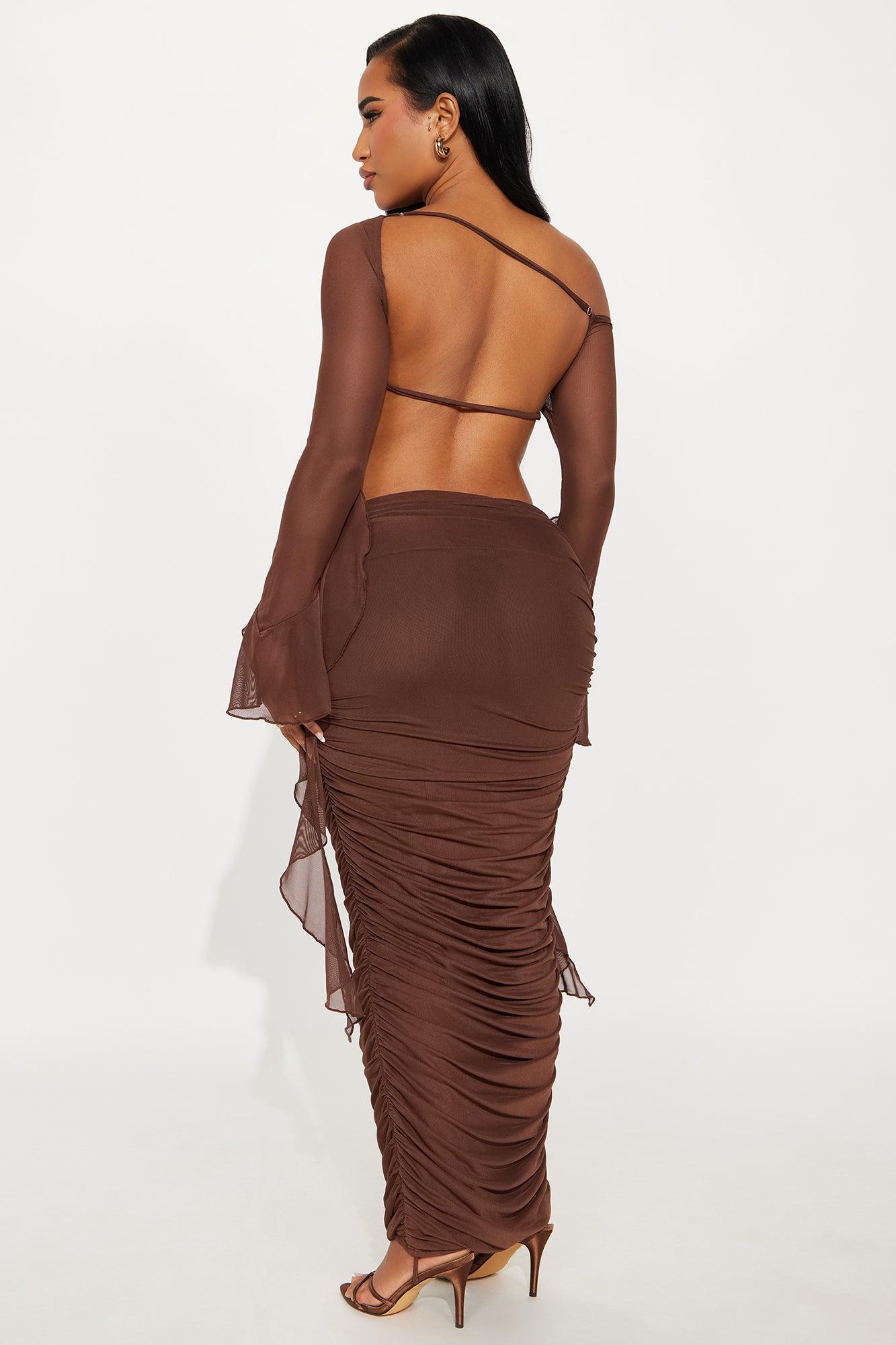 Available In Brown And Cream. Mesh Maxi Dress Long Sleeve Ruffle Drape Detail Off Shoulder Neckline Ruched Backless Adjustable Back Straps Lined Stretch SELF/LINING: 95% POLYESTER 5% SPANDEX Imported California Proposition 65WARNING: Cancer and Reproductive Harm - www.P65Warnings.ca.gov.