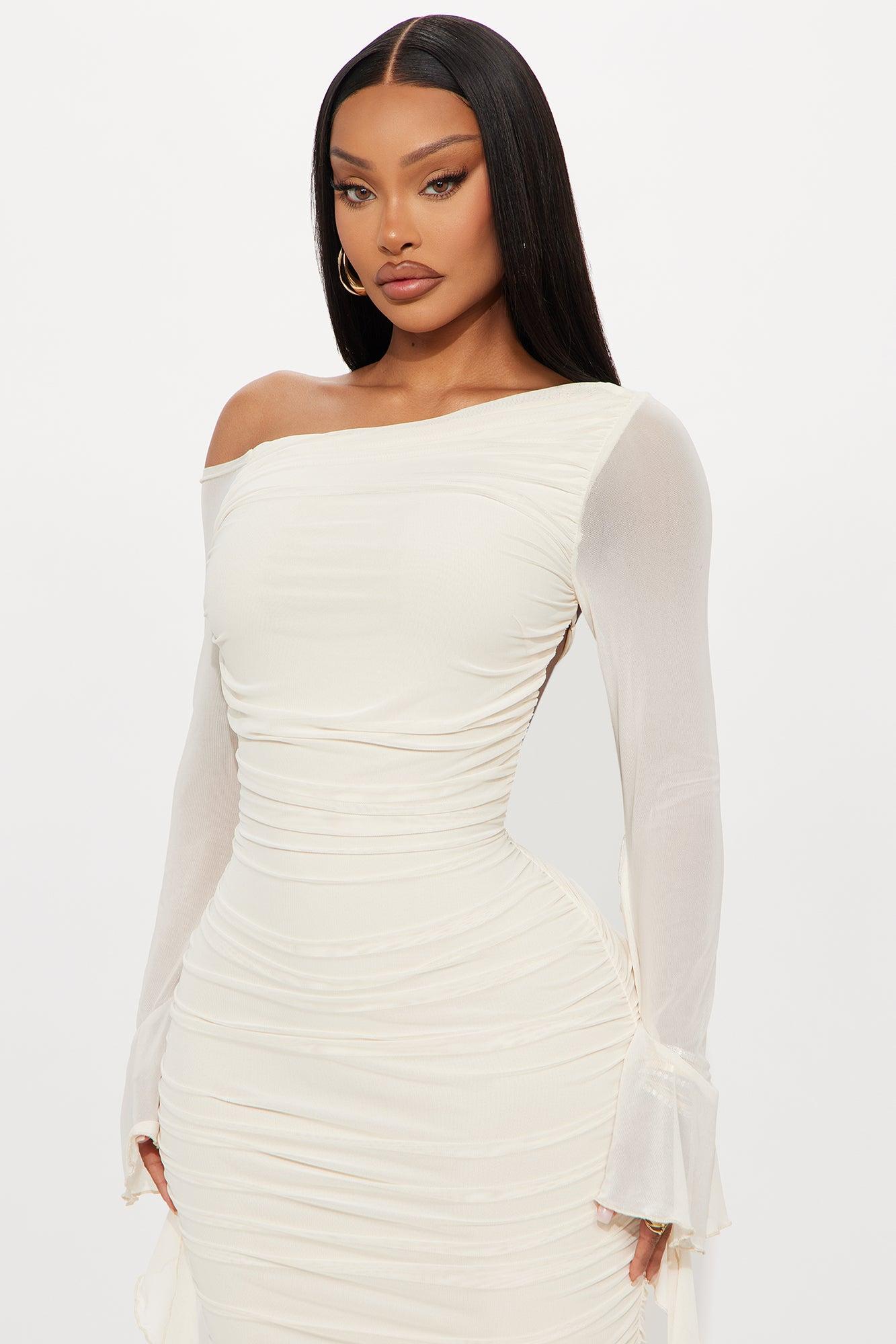 Available In Brown And Cream. Mesh Maxi Dress Long Sleeve Ruffle Drape Detail Off Shoulder Neckline Ruched Backless Adjustable Back Straps Lined Stretch Self/Lining: 95% Polyester 5% Spandex Imported California Proposition 65WARNING: Cancer and Reproductive Harm - www.P65Warnings.ca.gov.