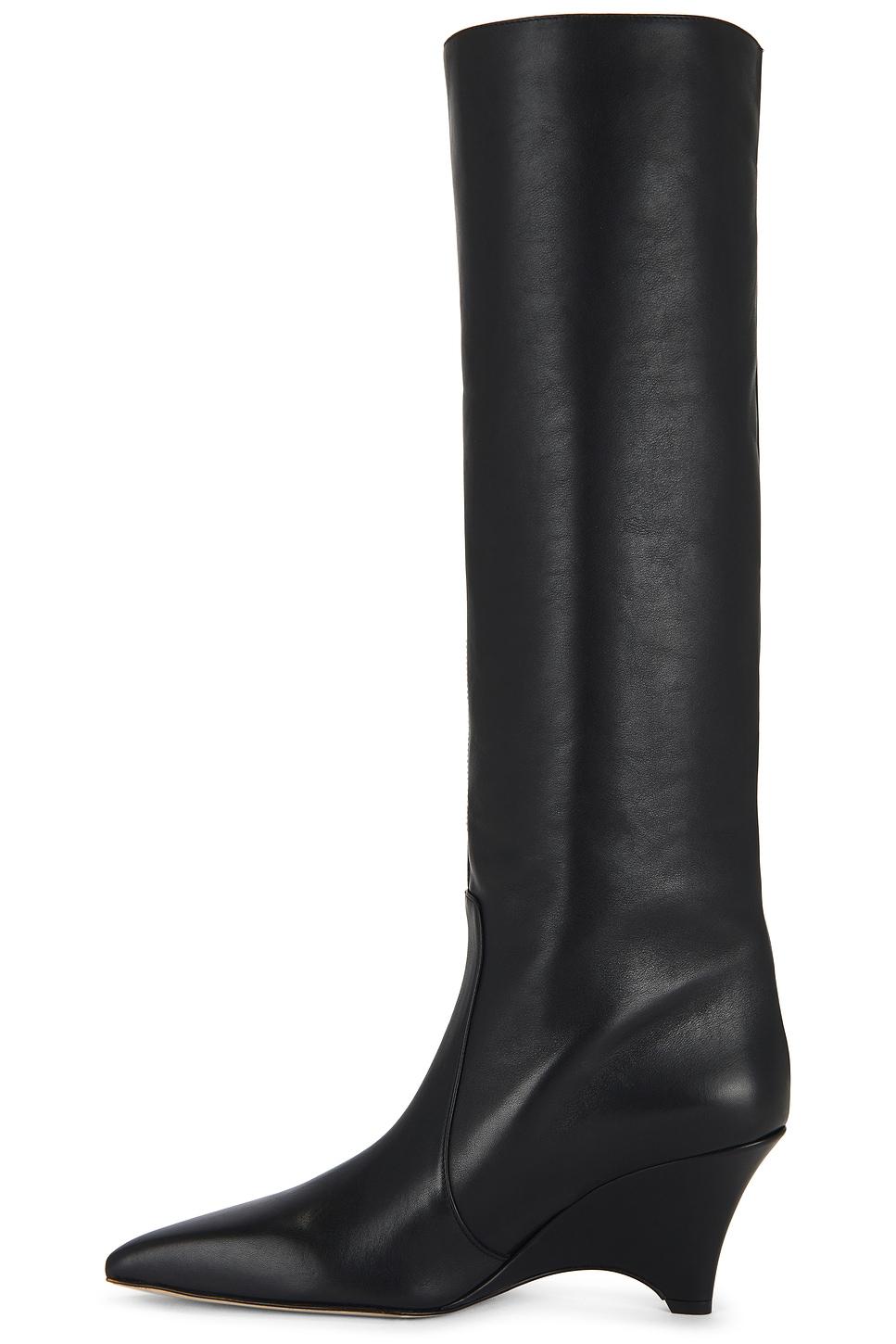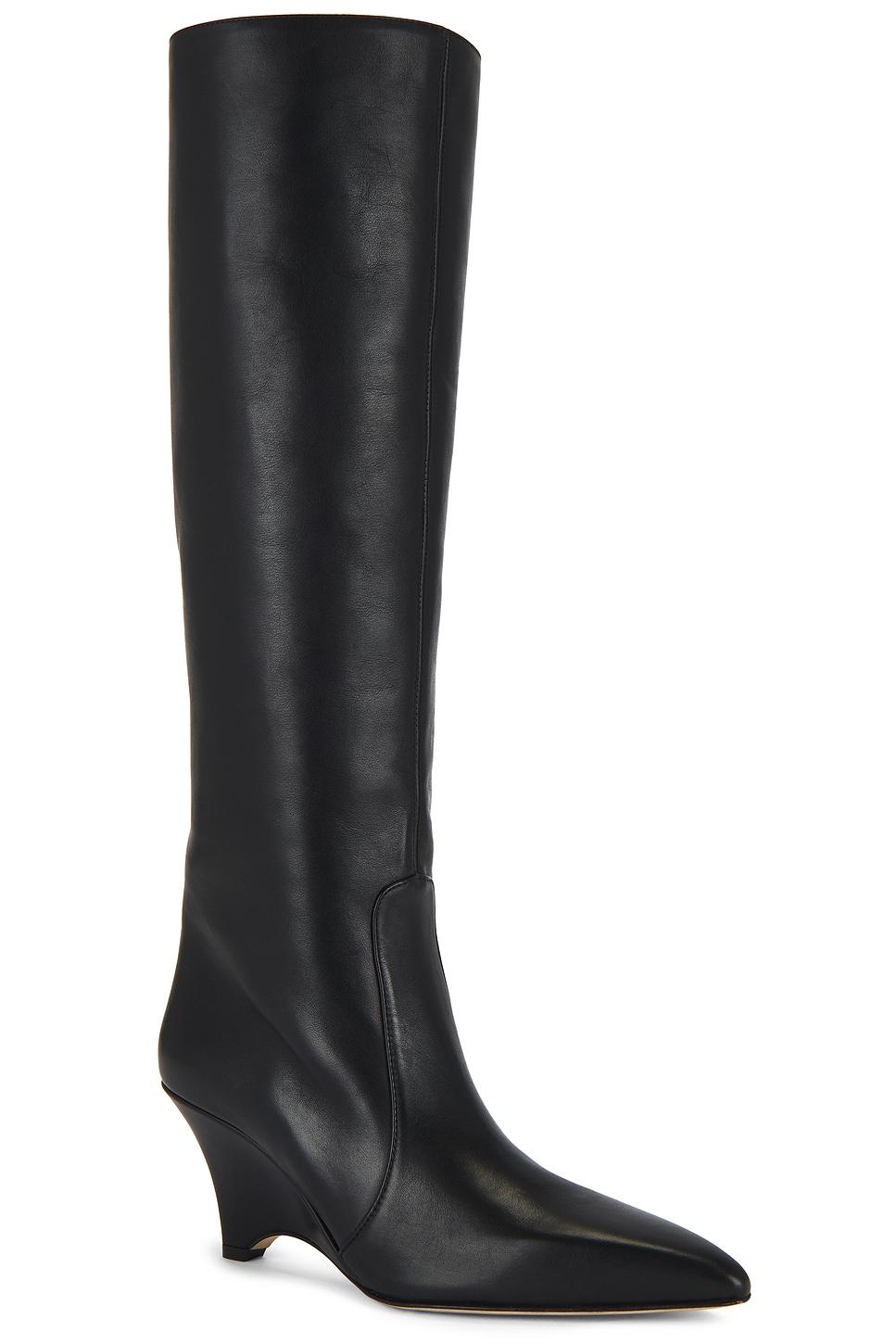 Leather upper with manmade sole. Pull-on styling. Pointed toe. Wedge heel. Approx 75mm/ 3 inch heelApprox 419mm/ 16.5 inch shaftShaft measures approx 14.13" in circumference. Made in Italy. Revolve Style No. FDAX-WZ50. Manufacturer Style No. MARIAH.