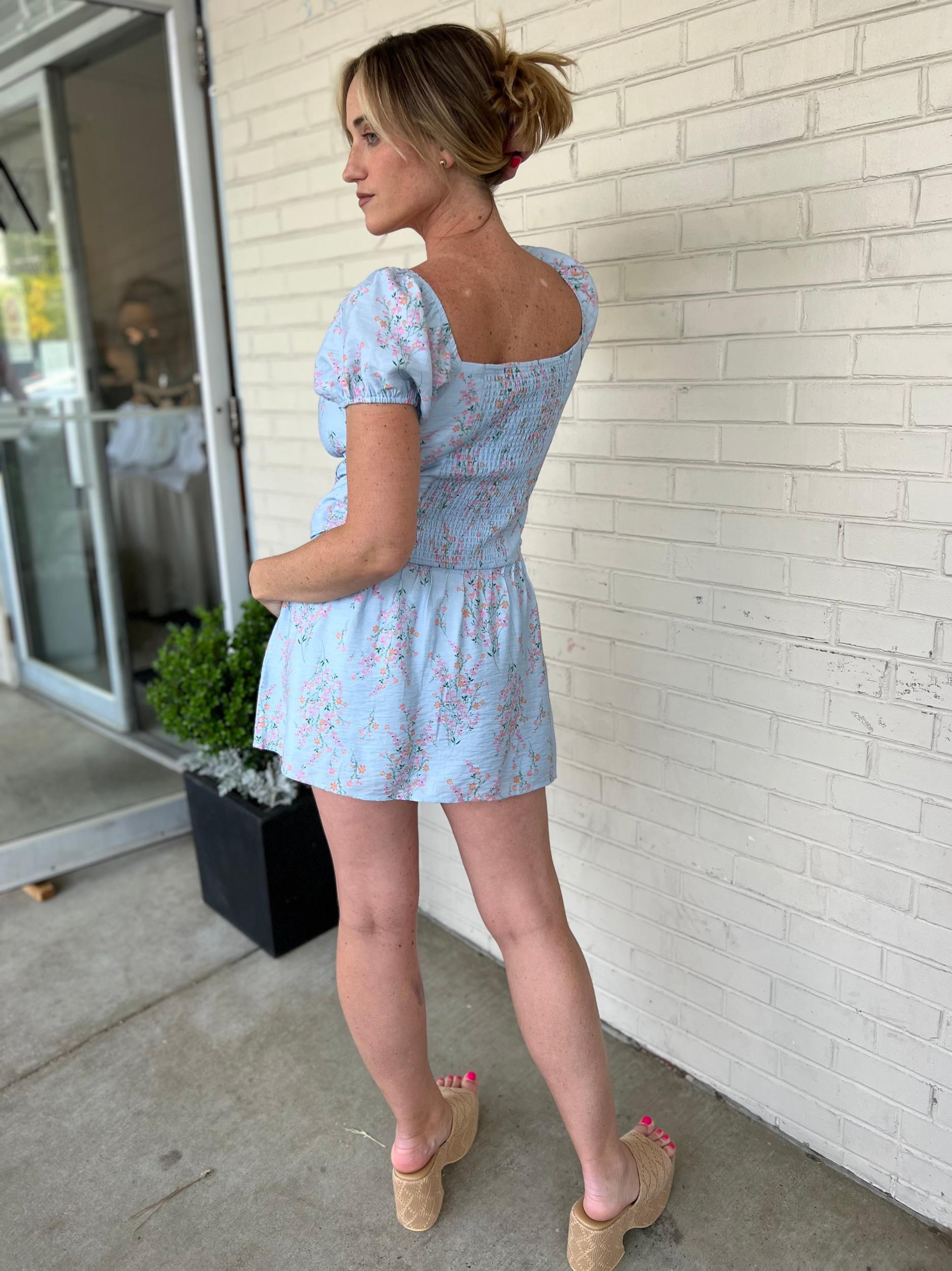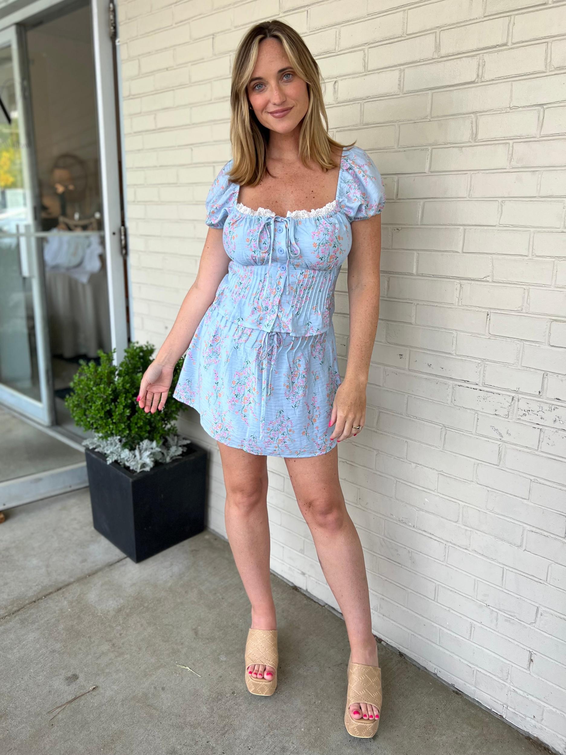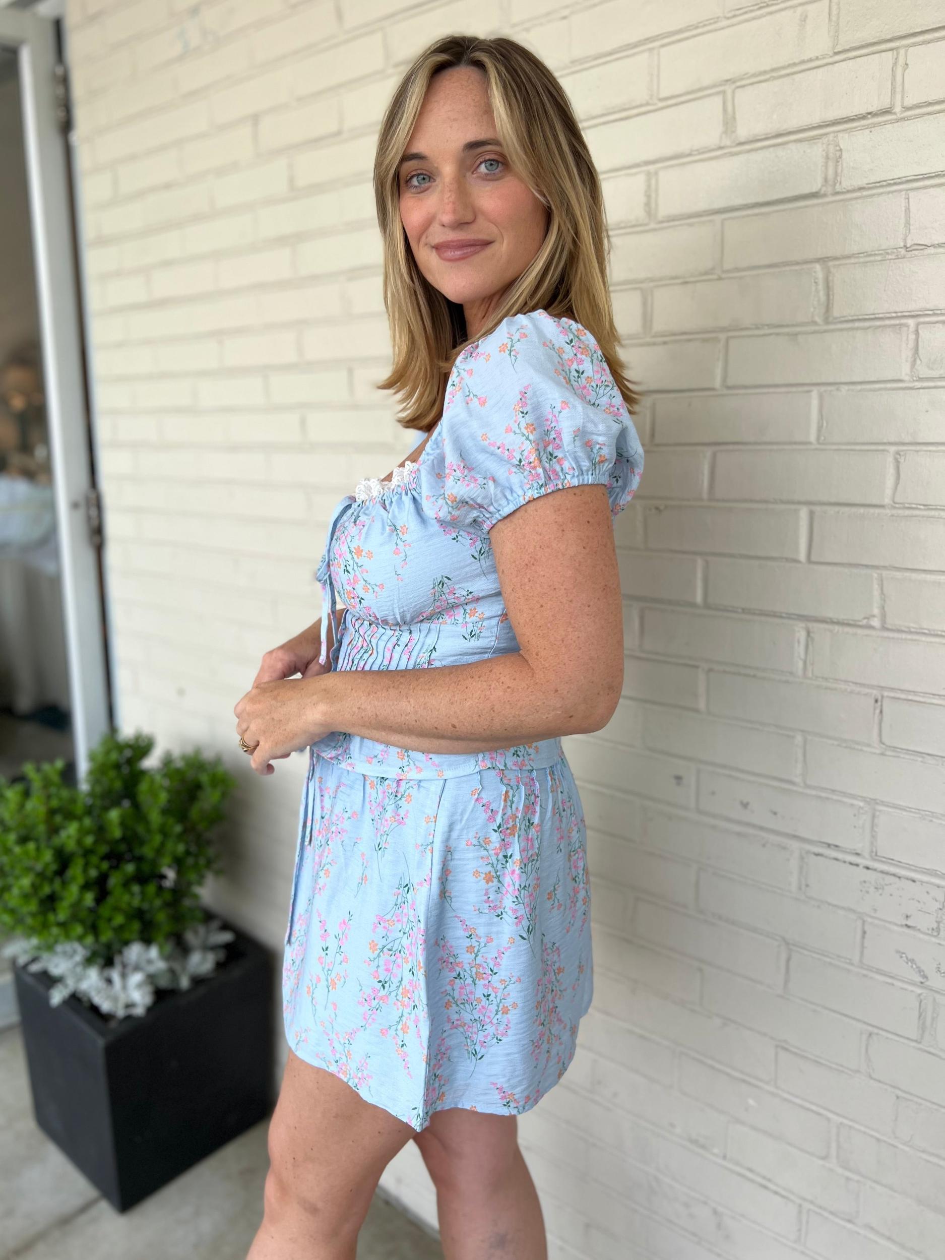 The Mariah Floral Set is a summer must-have with its light blue color and playful pink and orange floral pattern. The mini skirt features a front tie and subtle line stitching, while the top has delicate lace accents and a front tie. With comfortable elastic on the sleeves, this set is perfect for all-day wear.