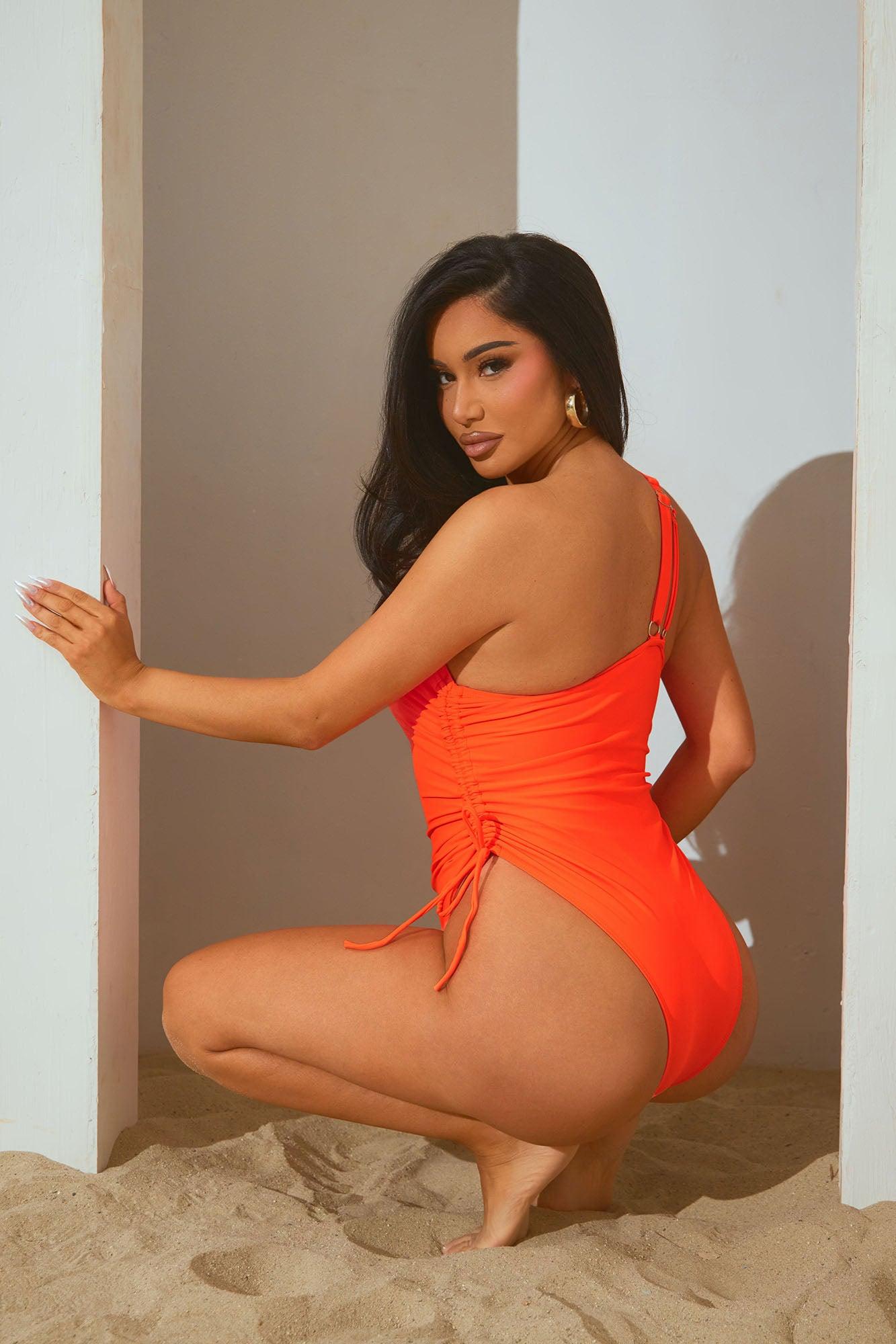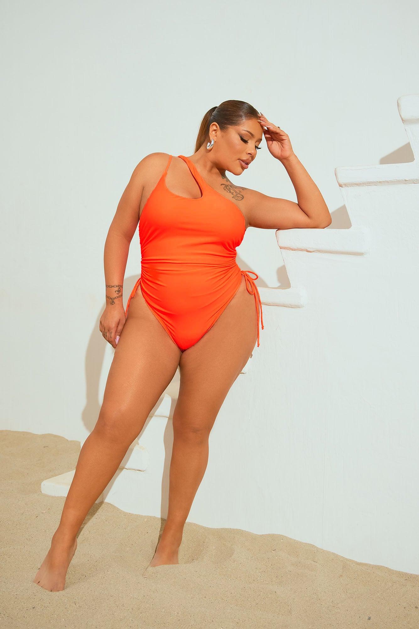 Available In Black, Blue, Chocolate, Olive, Orange, Red And White. One Piece Ensemble Swimsuit Adjustable Straps One Shoulder Removable Cups Cut Out Cinch Side Ties Full Stretch Final Sale Shell: 80% Nylon 20% Spandex Lining: 92% Polyester 8% Spandex Imported