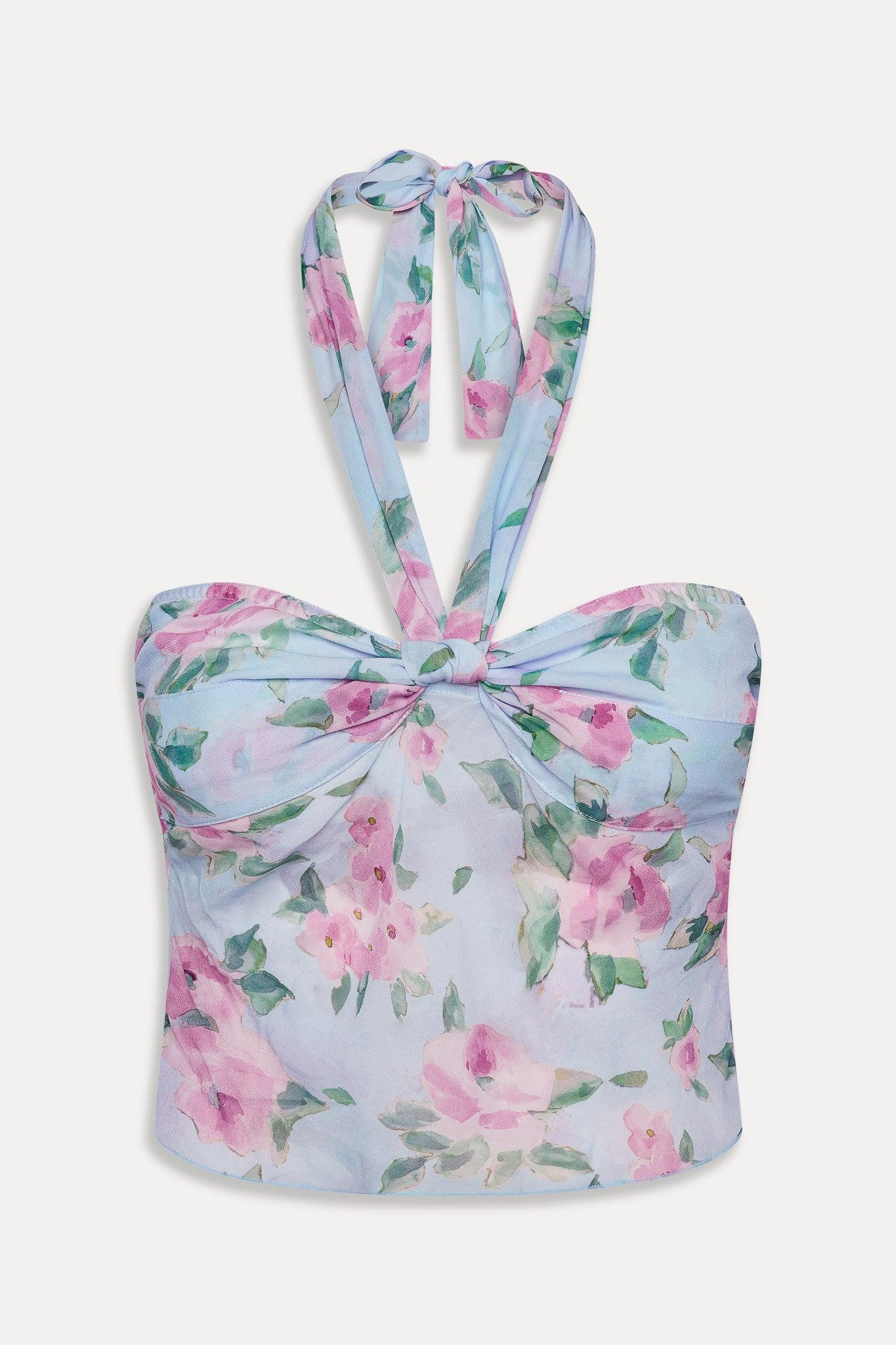 This feminine halter top knots at the front and ties at the neckline, creating a draped look across the bust. Smocking through the back adds flexible support. The Maribel top pairs beautifully with the matching mini skirt or tailored trousers. Details Lightweight chiffon fabric Painted watercolor pattern Front knot detail Ties at neckline Smocked back for comfort and flexibility Lined on the bust, sheer through the body