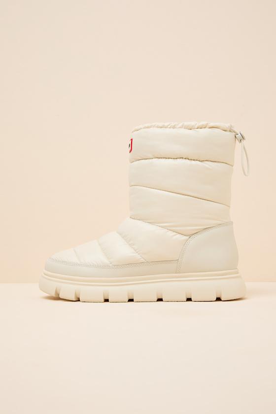 Iconic snow day style always includes adorable footwear like these winter-ready boots from Hunter! Crafted from sleek waterproof nylon, the puffy quilted design features a rounded-toe upper and a fleece-lined footbed, rising to an insulated mid-calf shaft. A cinching, adjustable back toggle makes for easier on-and-off and keeps warmth in with a customizable fit, all atop a chunky lug sole. Available in whole sizes only.