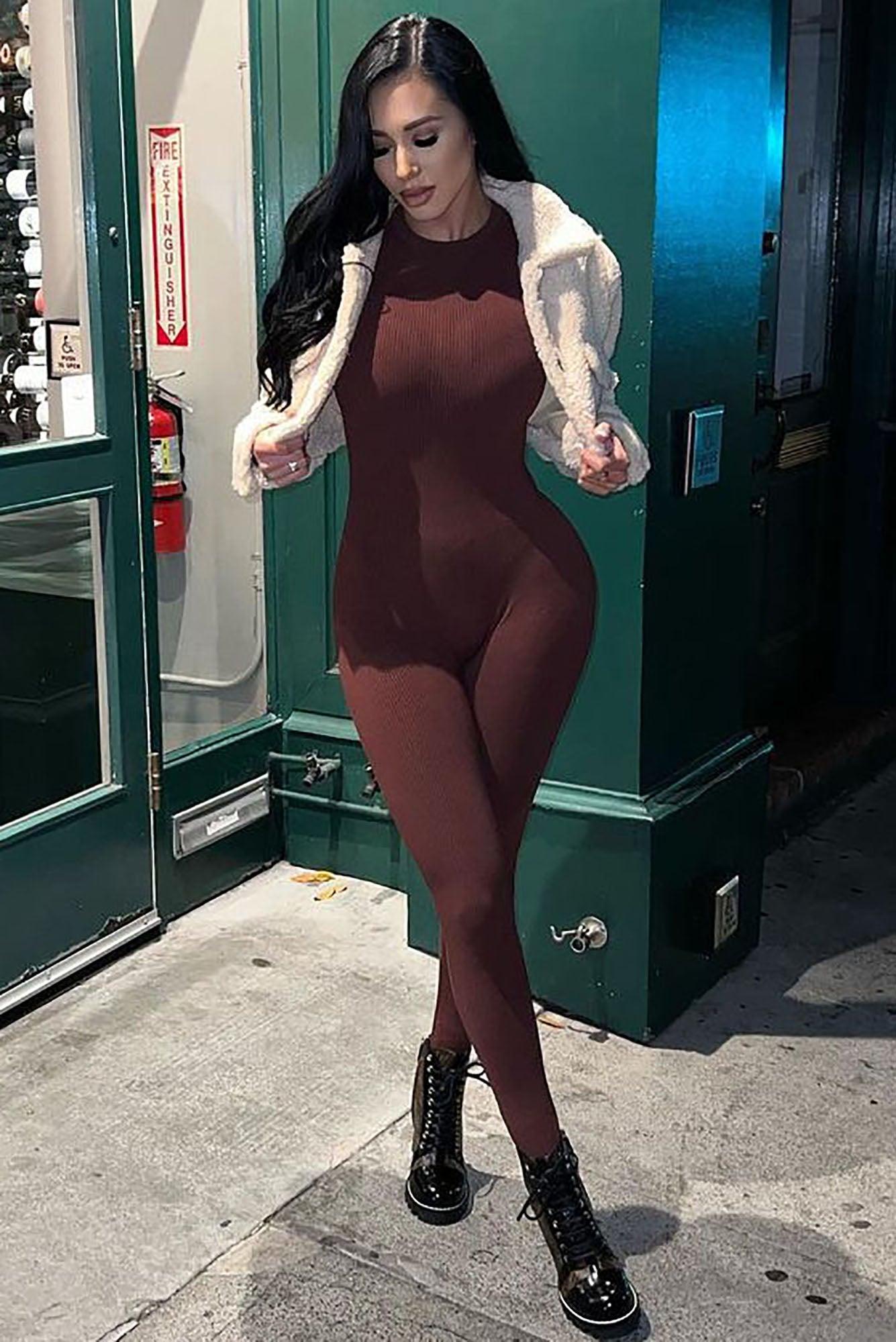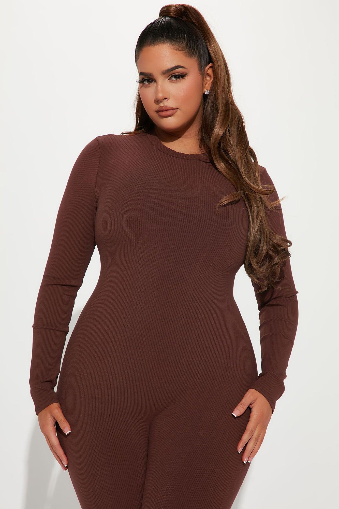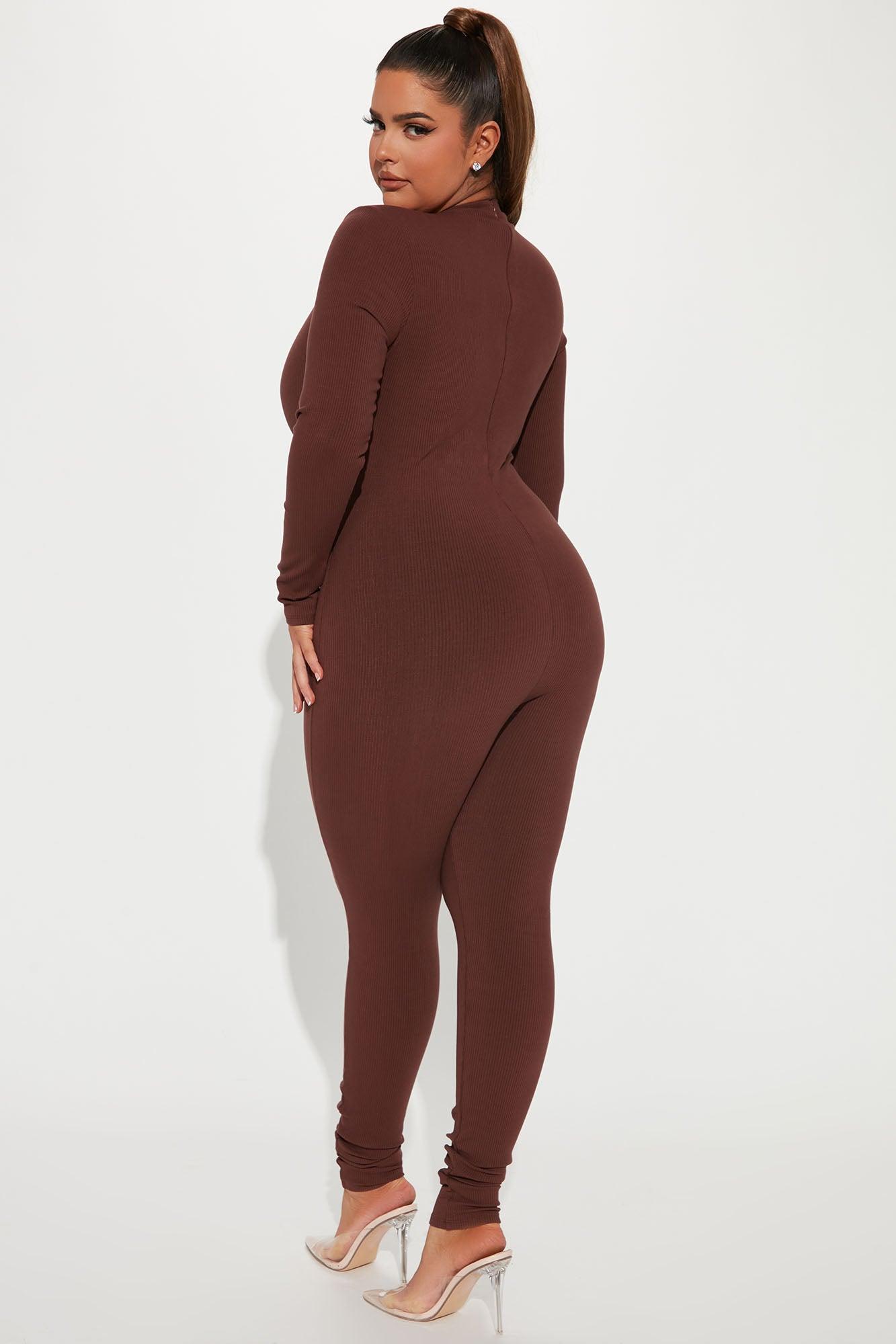Fashion Nova's Snatched Collection features form-fitting and slimming fabrics that sculpt your silhouette and highlight your best assets. Ultra-comfortable and crafted to contour your curves with a snatched finish that feels like second skin. Available In Black, Chestnut, Chocolate, Heather Grey, Olive And Slate Grey. Long Sleeve Jumpsuit High Neck Zip Back Closure Compression Ribbed Stretch 82% Rayon 18% Spandex Imported