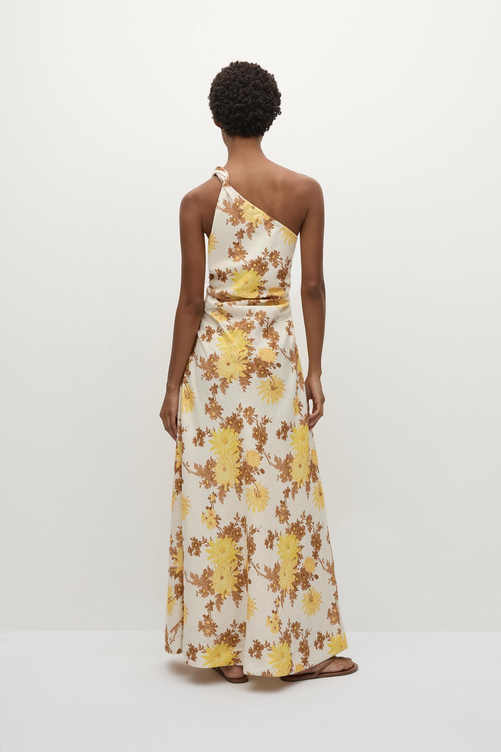 A feminine halter-style top with a deep V-neckline and tie detail at the back neck. There is subtle stitching under the bust for additional shape as well as panelling through the front and mock button detailing. It is fitted through the bodice, cropping at the hips with a slight flare, and a shirred back waist panel allowing for extra stretch. Designed from a signature 100% European Flax® linen fabrication in a vintage-inspired yellow floral, style with the Sanne Pant for an elevated approach to linen dressing.This style is true to size. The shirred back panel offers additional stretch.
