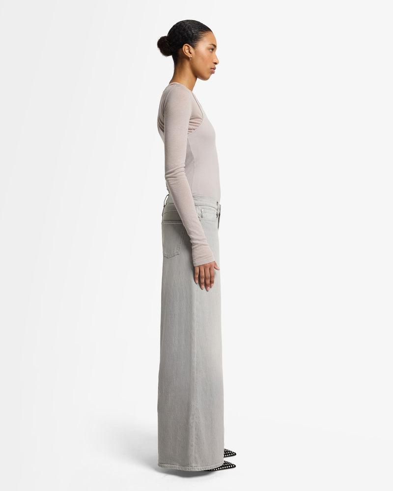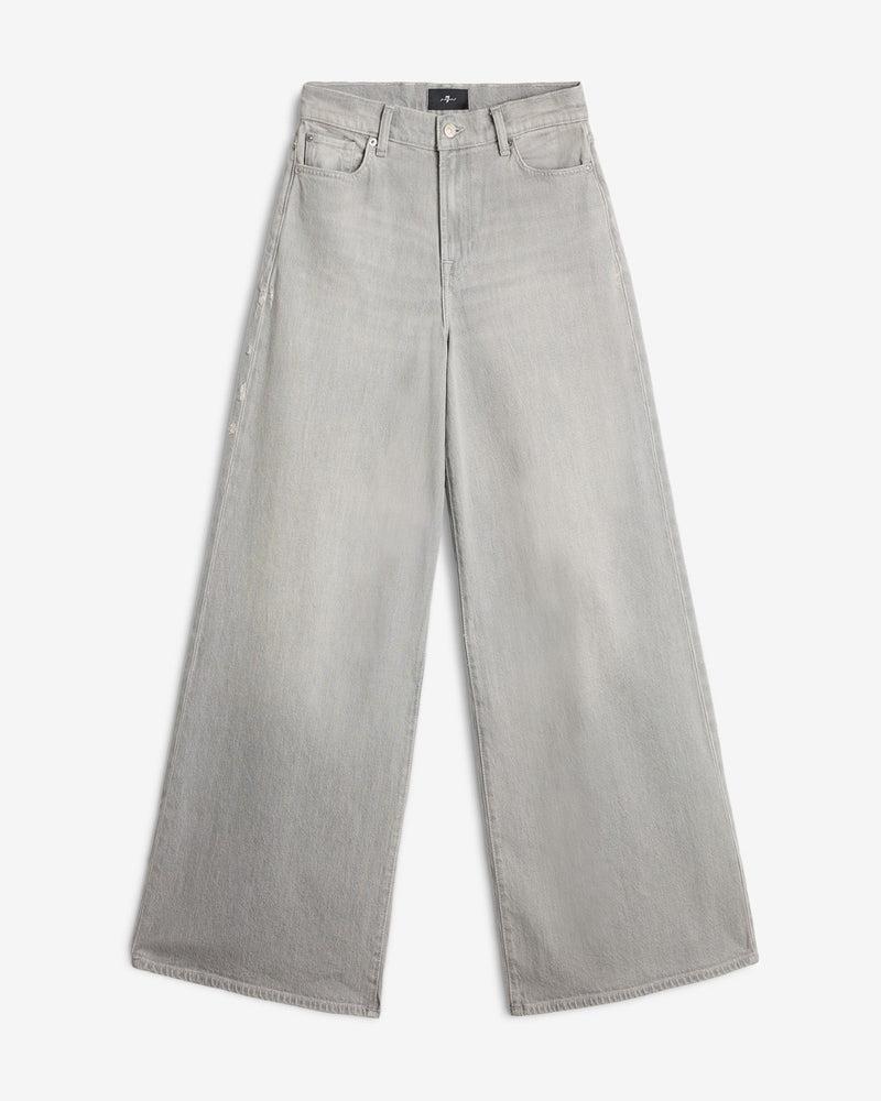 Fits like: Sleek and elongating, this high rise silhouette defines the waist before flowing into a dramatic wide leg shape from thigh to floor. Feels like: A grounded, structured denim that develops softness and character with every wear. The Details: Grey Wash Zip fly with button closure Clean back pocket Sutble whisk