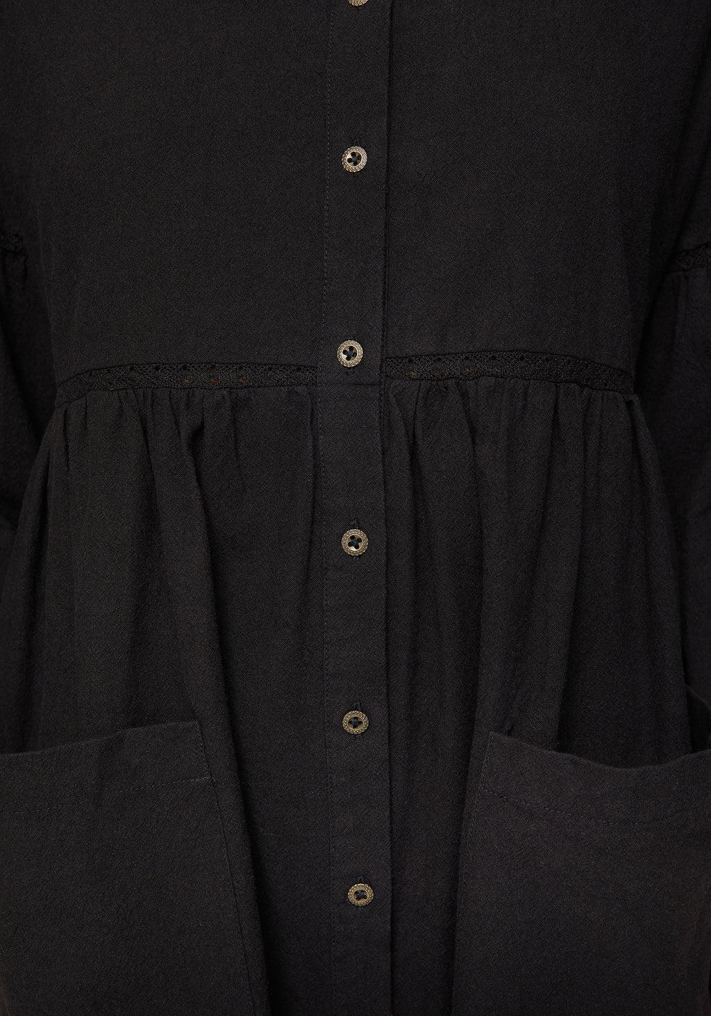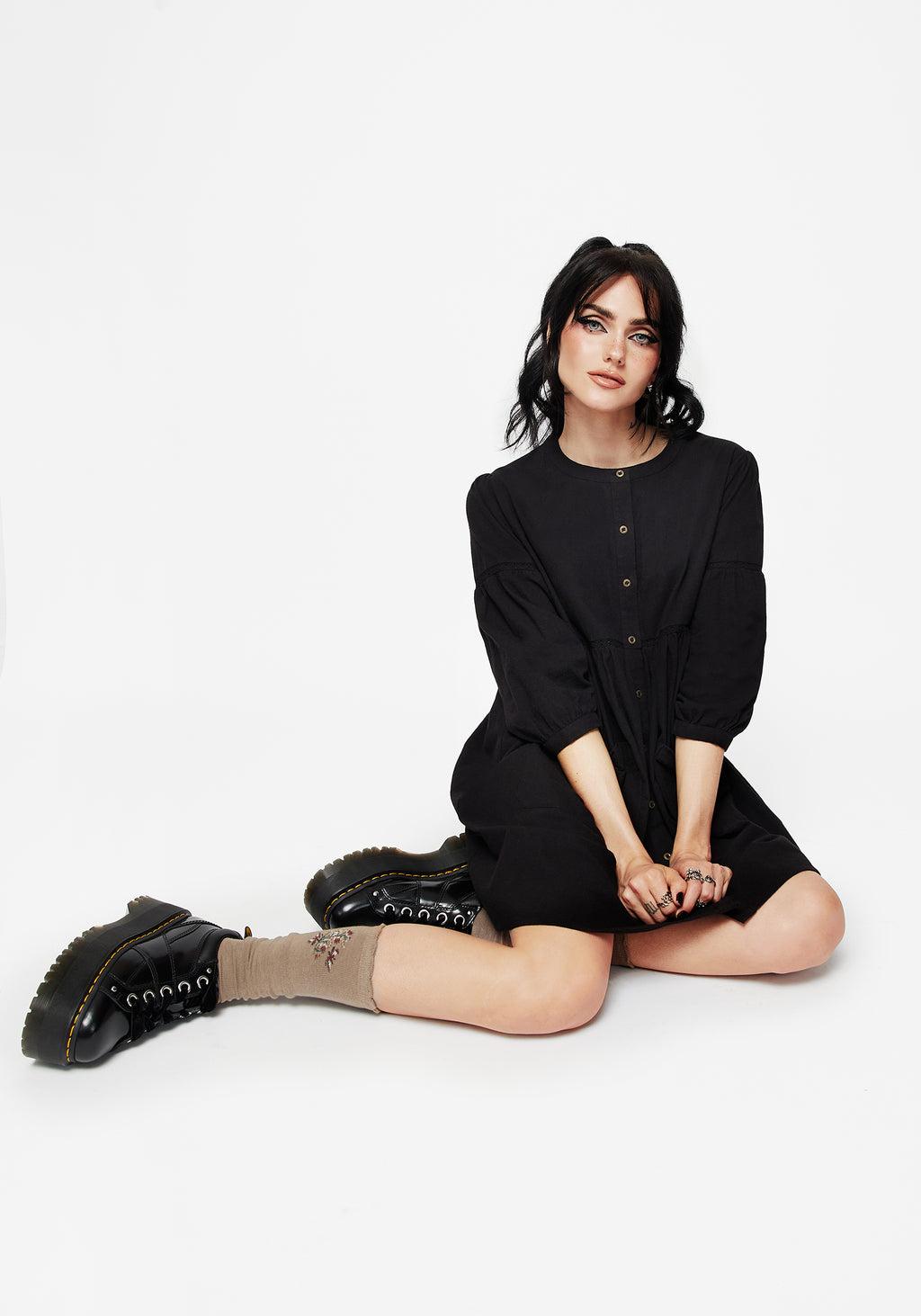 Black Mini Smock Dress Functional Button Front Crew Neckline Mid-Length Sleeves Front Patch Pockets Mini Length Crochet Lace Trim 100% Cotton Brianne is 5'7" and is wearing a size UK6 / US2