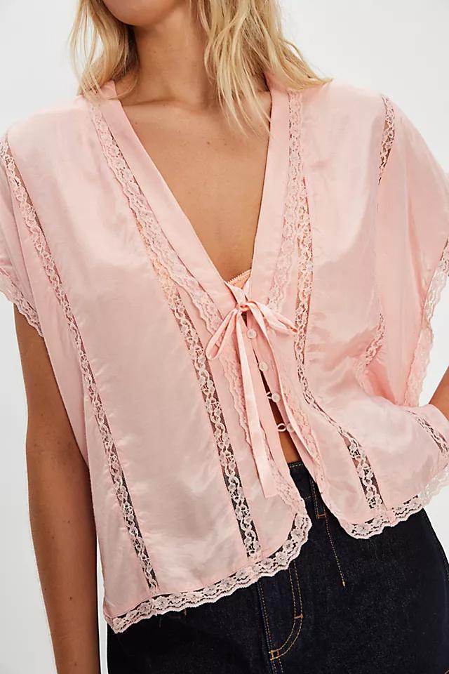 **Features:** Delicate satin fabrication, V-neckline, button-front detailing, embroidered lace trim
