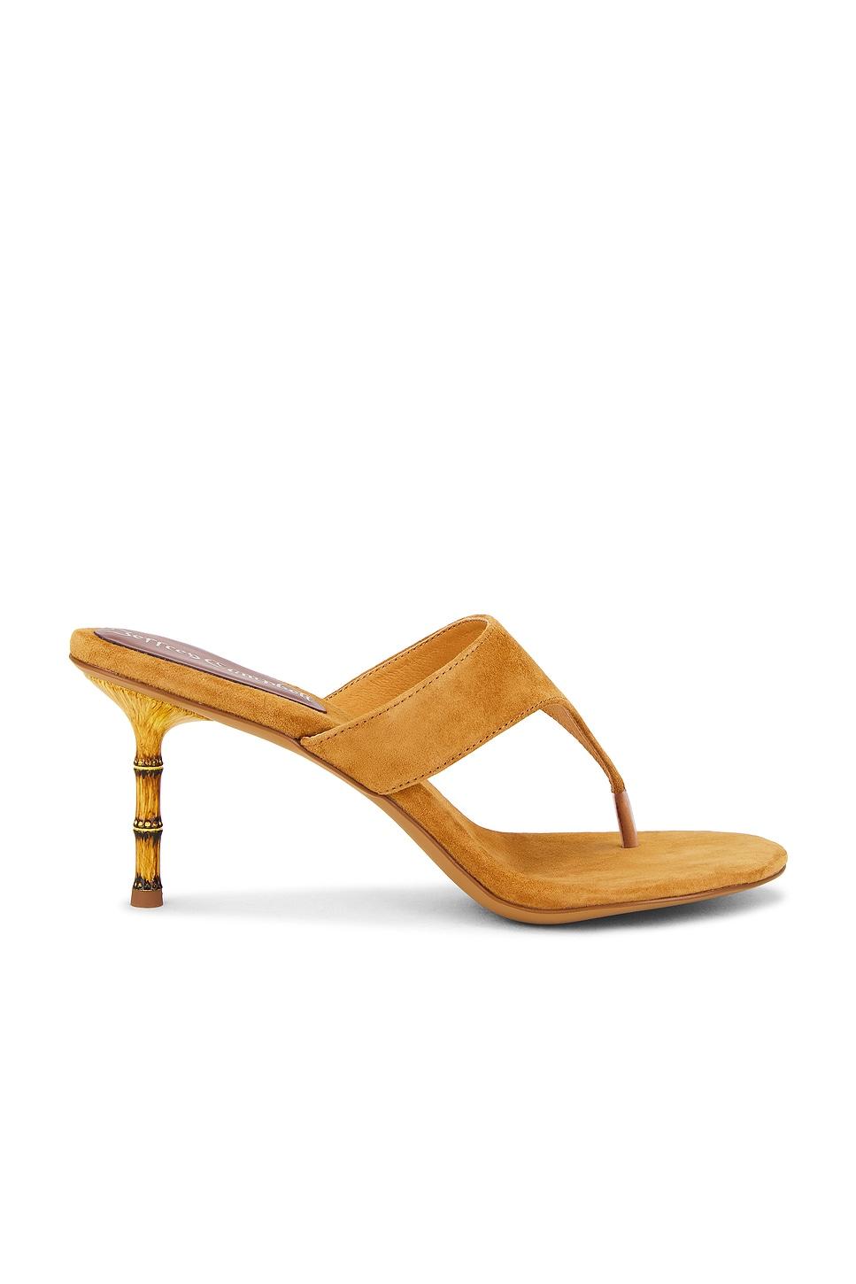 Suede upper with manmade sole. Slip-on styling. Faux suede footbed with leather lining. Thong design. Rounded toe with bamboo style heel. Approx 75mm/ 3 inch heel. Made in China. Revolve Style No. JCAM-WZ2050. Manufacturer Style No. MARILLA.