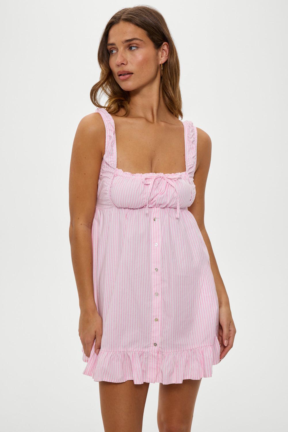 The Marilyn babydoll dress is designed for your sweetest moments this winter. Slip into this prairie mini and you'll be ready for any indoor occassion. Details Stretchy smocked back Elastic shoulder straps Ruffle, bow, and button details Fabric 100% Cotton Model Size & Fit This style runs true to size Jasmine is wearing a size Small Height 5’9” (175cm) Bust 34" (86cm), Waist 23.5" (60cm), Hips 34” (86cm)