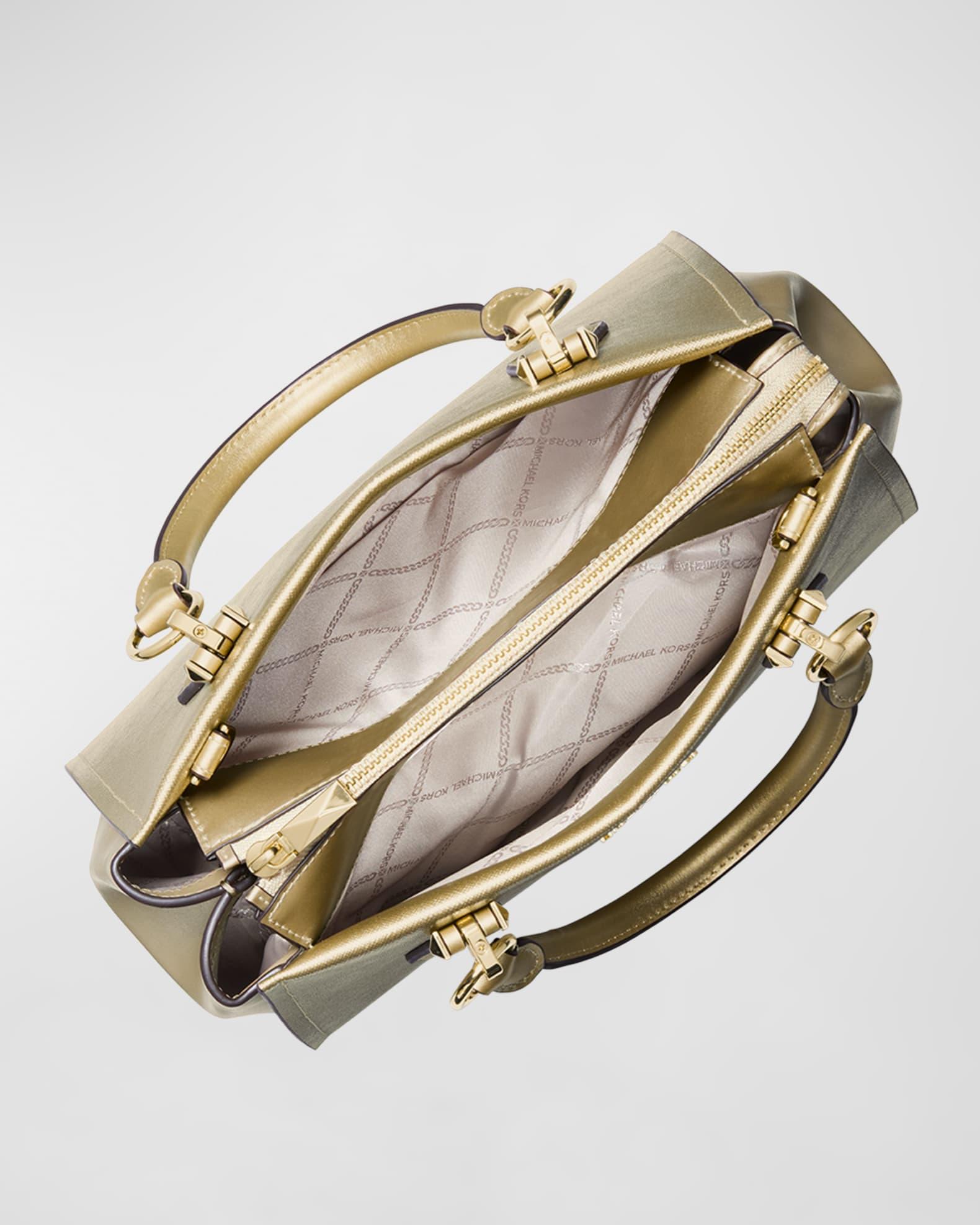 MICHAEL Michael Kors "Marilyn" satchel bag in metallic leather Rolled top handles, 4.5" drop Detachable, adjustable shoulder strap Can be worn as a top handle or shoulder bag Center zip compartment divides interior; one slip pocket and one zip pocket Feet protect bottom of bag Approx. 8.3"H x 11.3"W x 5.5"D Imported