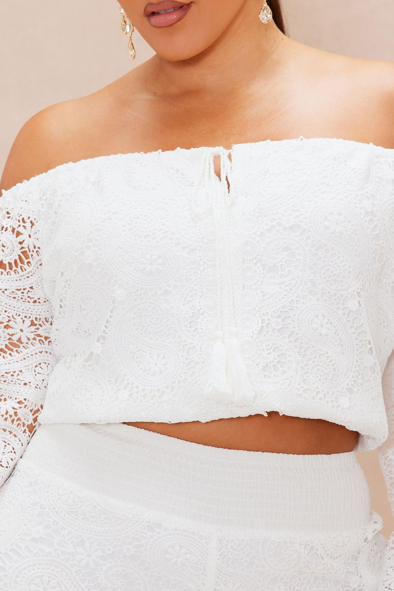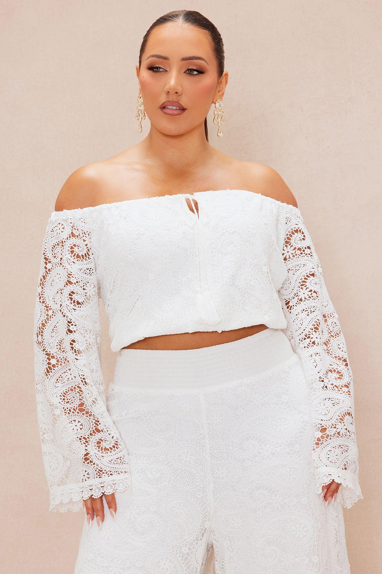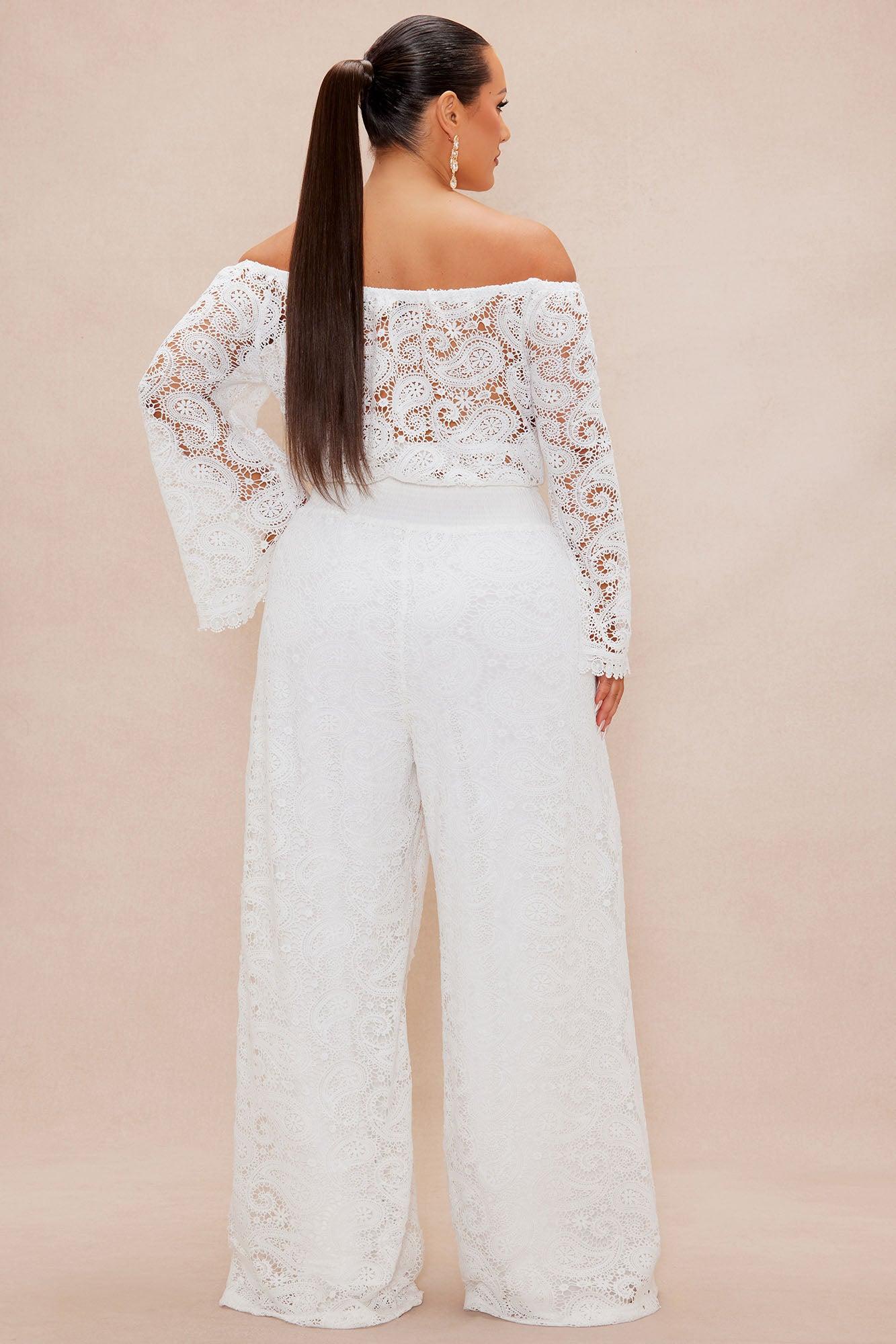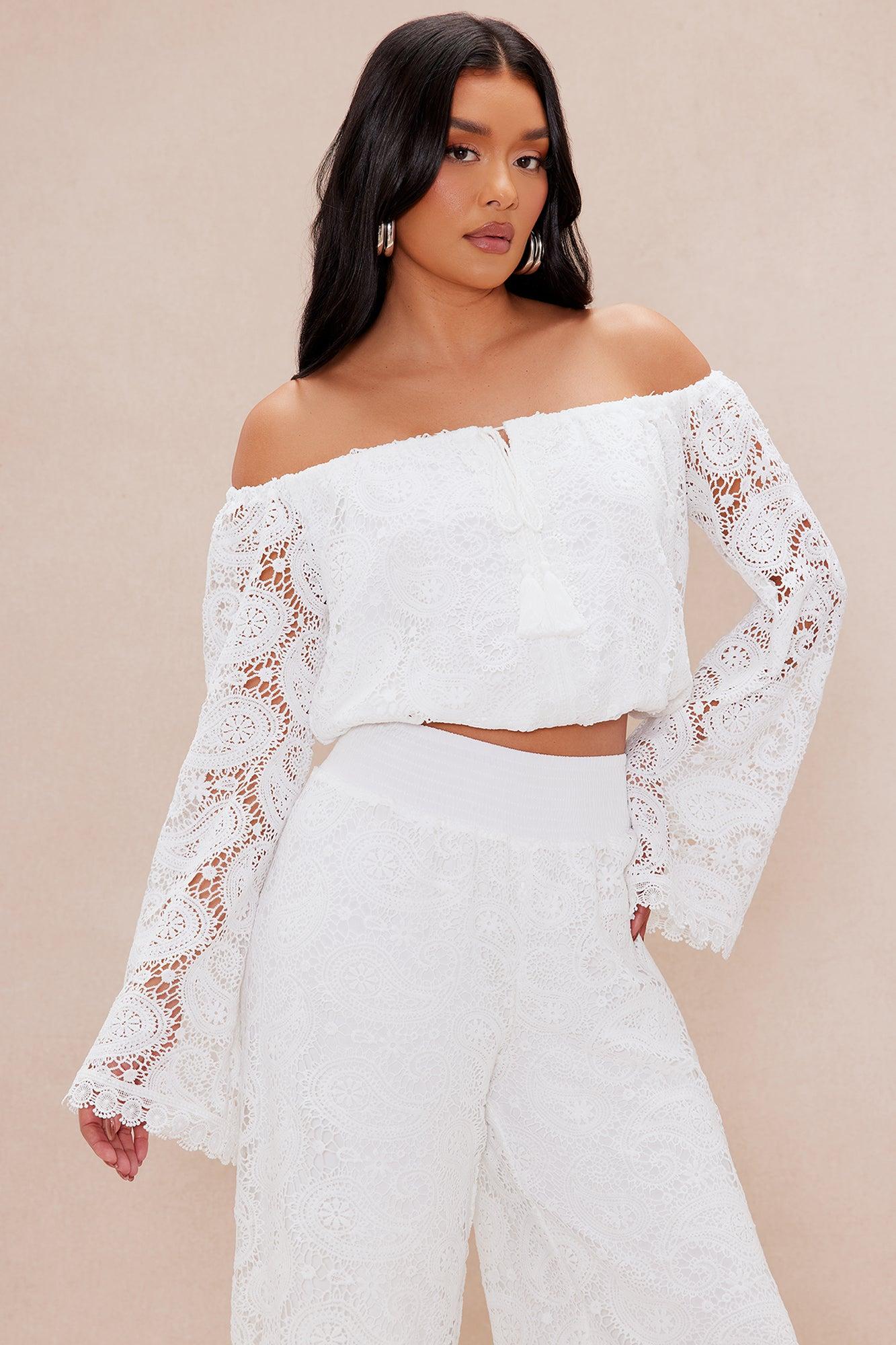 Available In Chocolate And White. Crochet Blouse Off Shoulder Long Sleeve Tie Front Crochet Wide Leg Pant Smocked Lined Non Stretch Disclaimer: Due To The Embroidery Design Placement, Each Garment Is Unique. Top: Shell / Lining 100% Polyester Bottons: Shell 1 / Lining 100% Polyester Bottoms: Shell 2 100% Cotton Imported