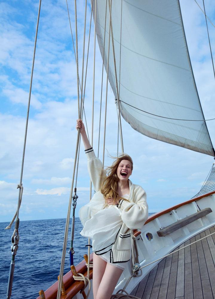 A soft and feminine spin on the sailor aesthetic, the Marina oversized cardigan is adorned with contrast knitted stripes, a classic square sailor collar, and patch pockets.